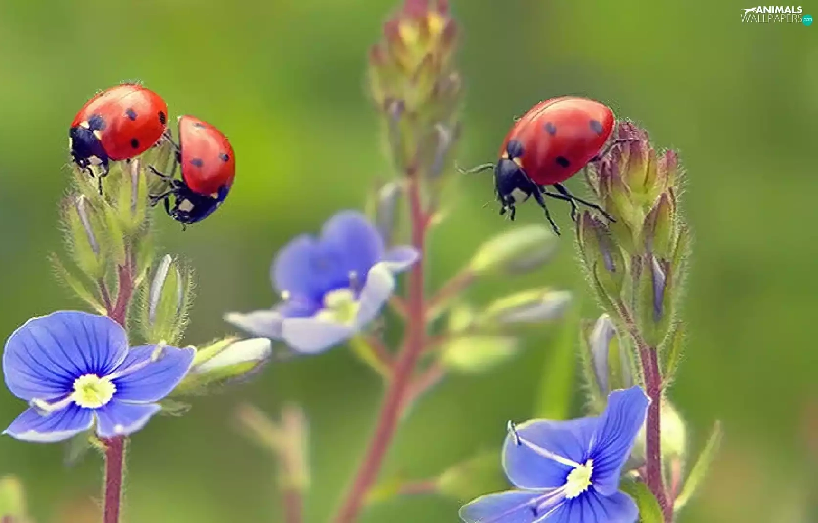ladybugs, Blue, Flowers