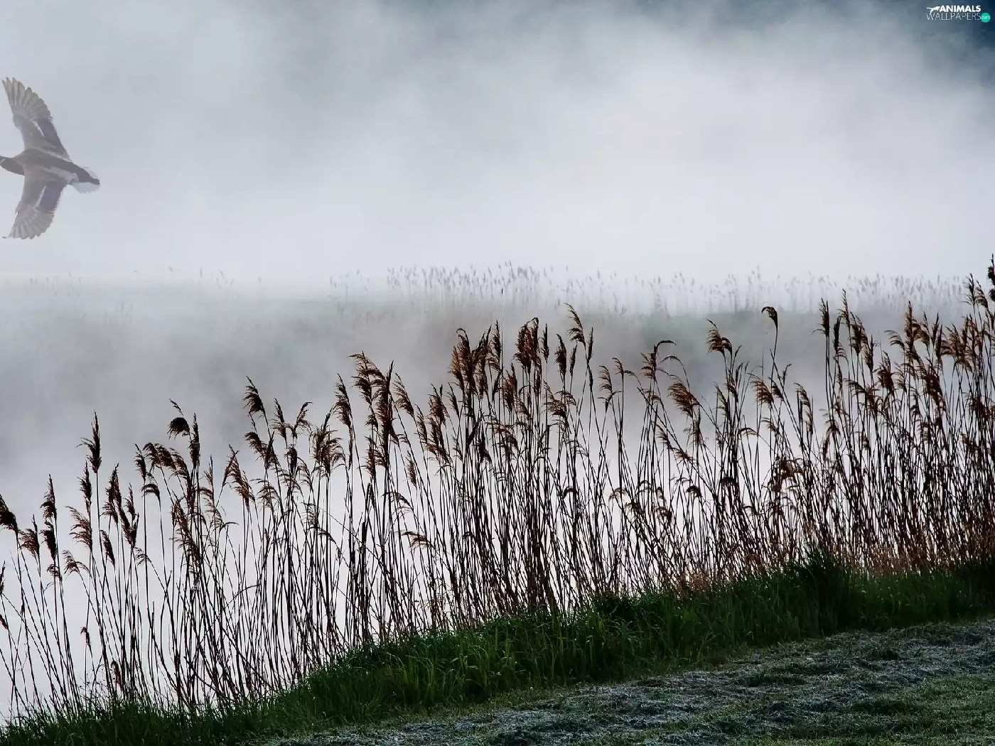 Fog, grass, duck, lake