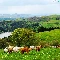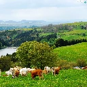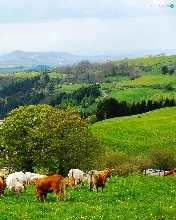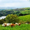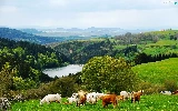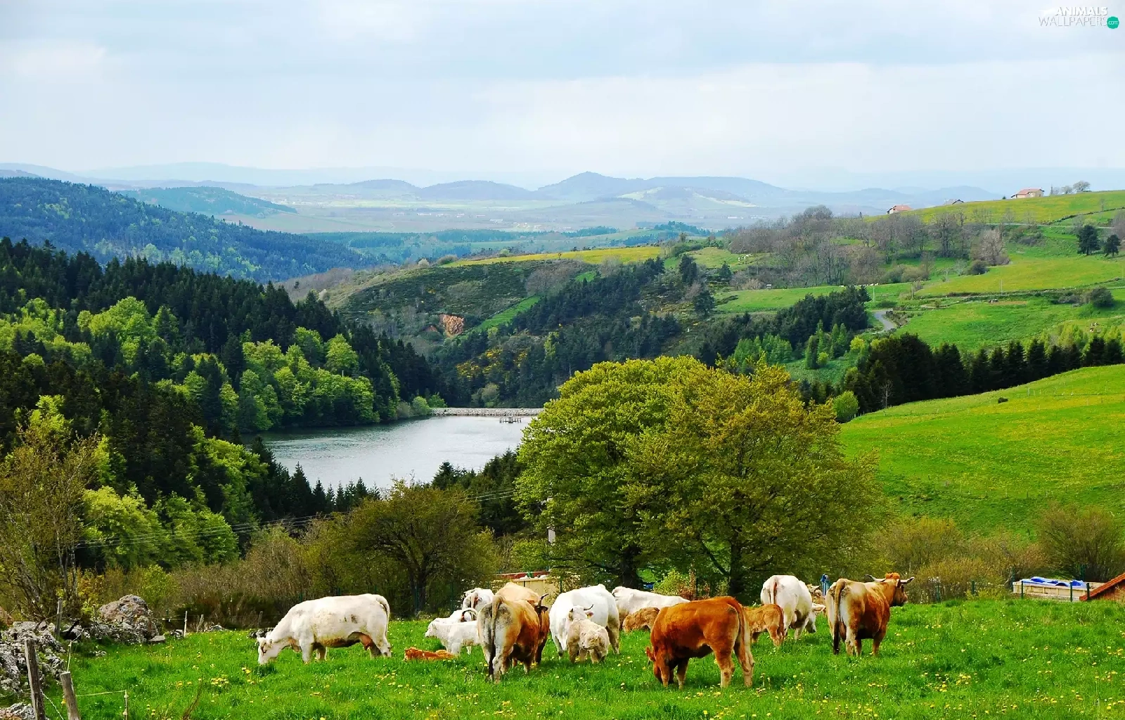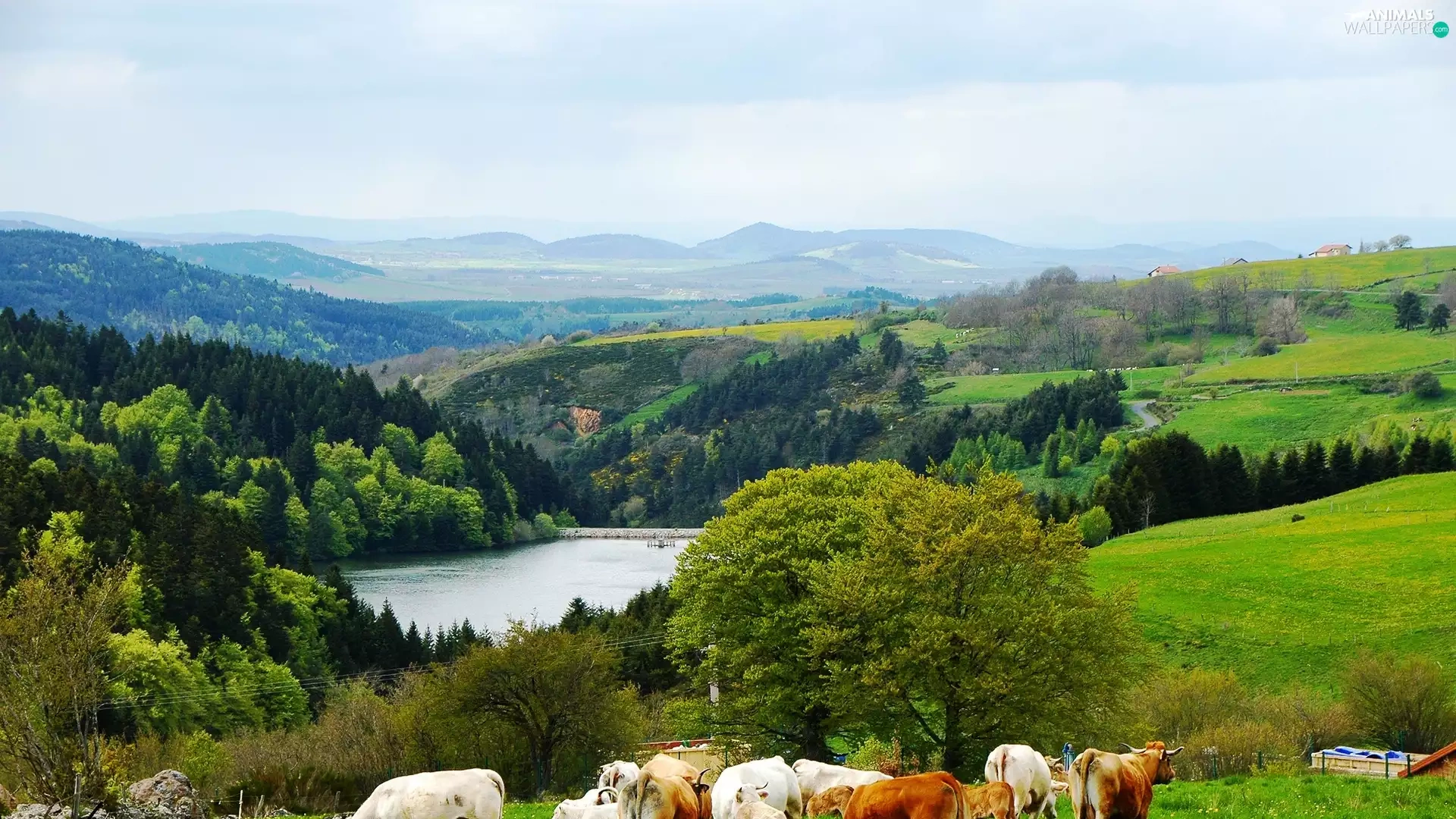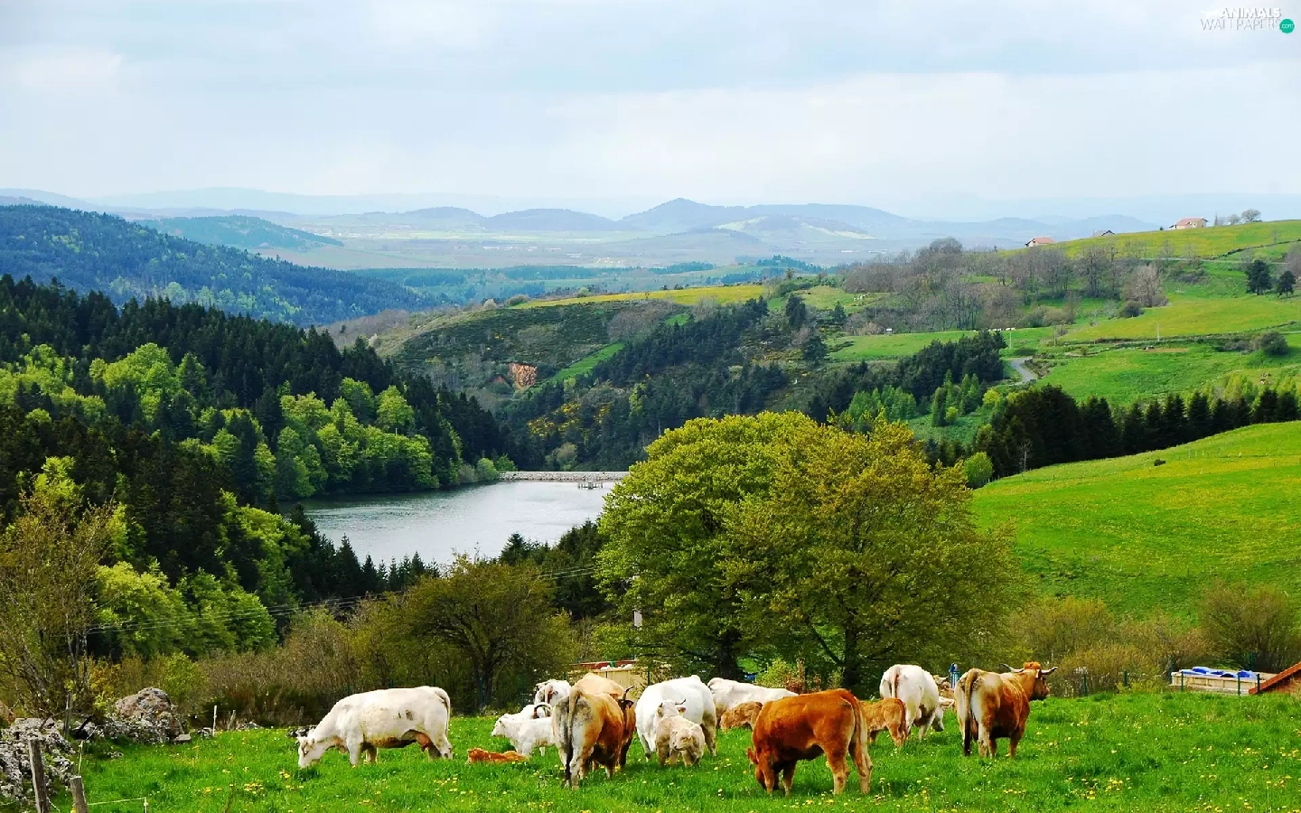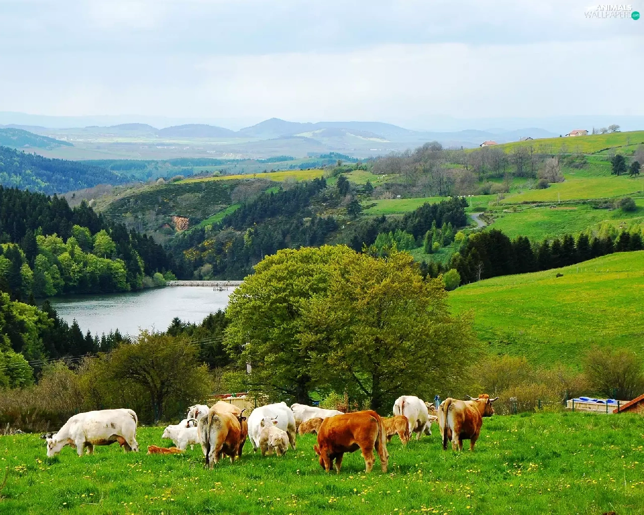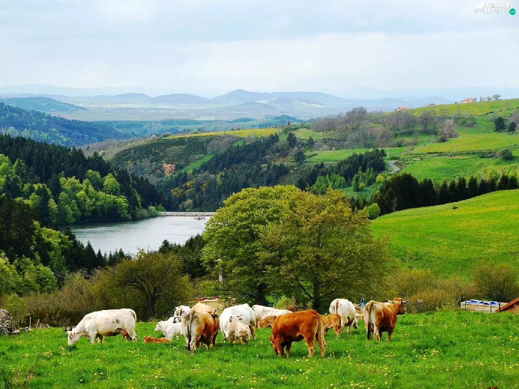 medows, lake, Mountains, woods, Cows