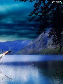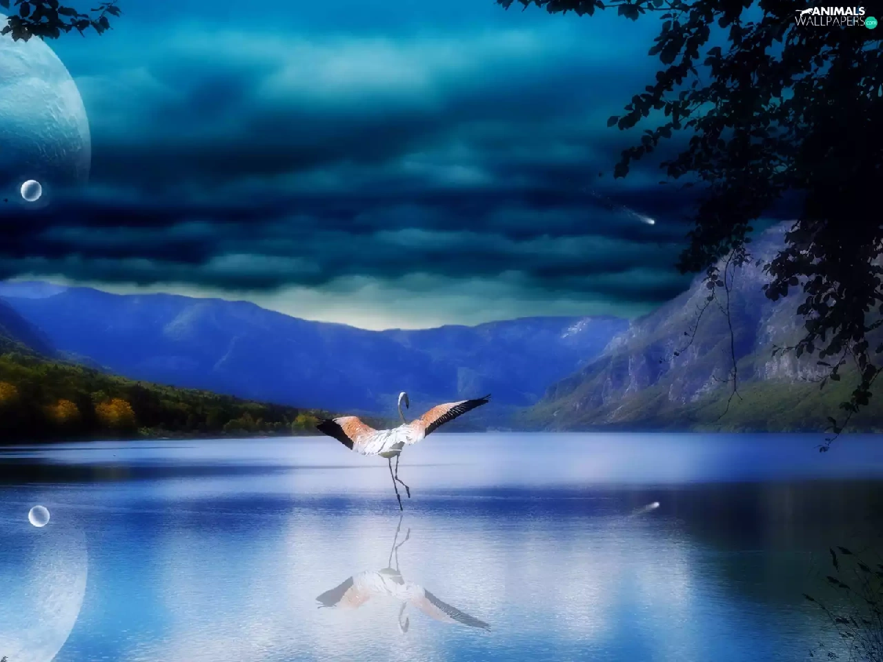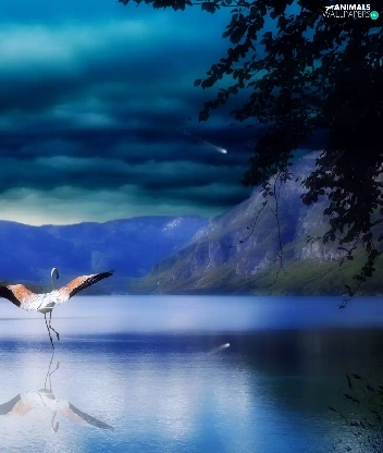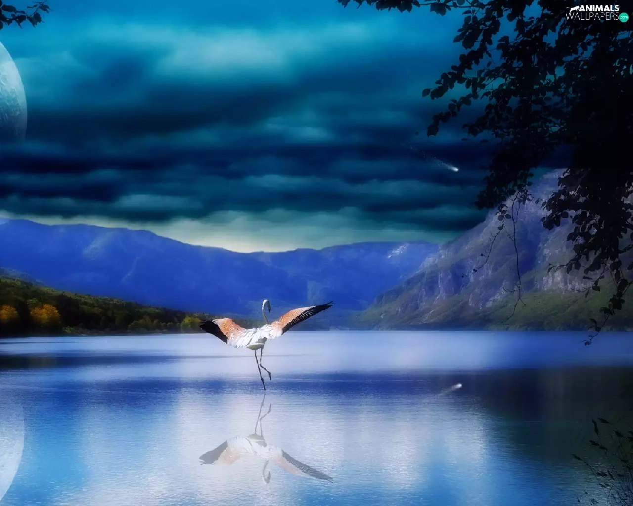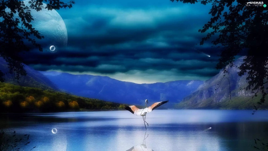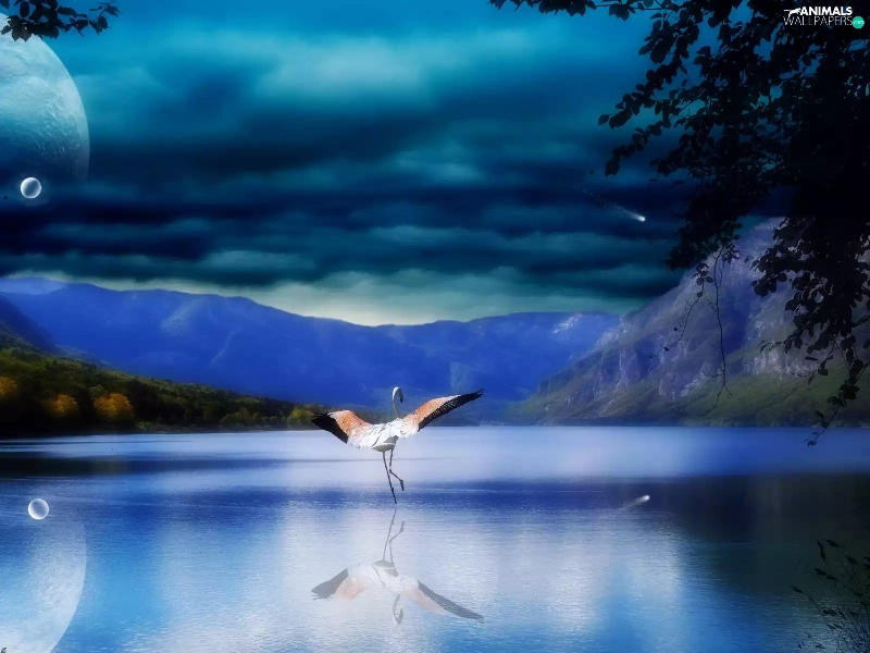 Mountains, Planet, flamingo, lake