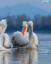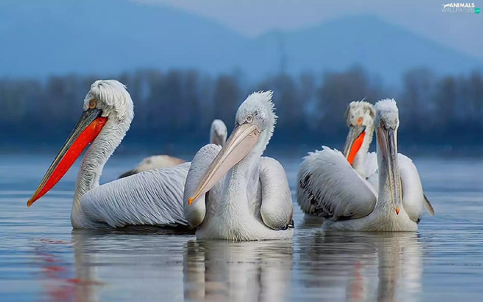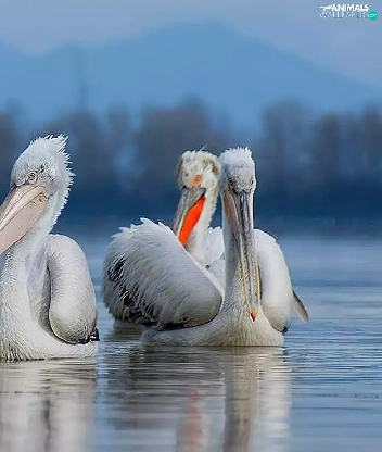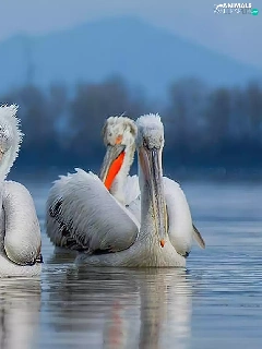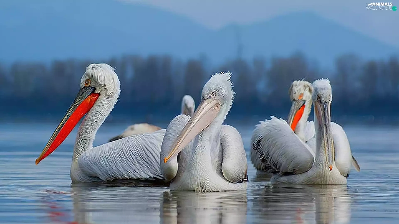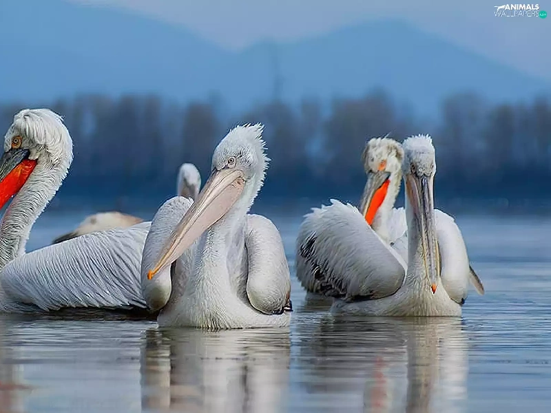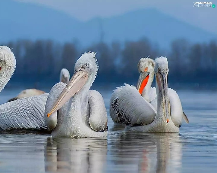 pelicans, Mountains, forest, lake