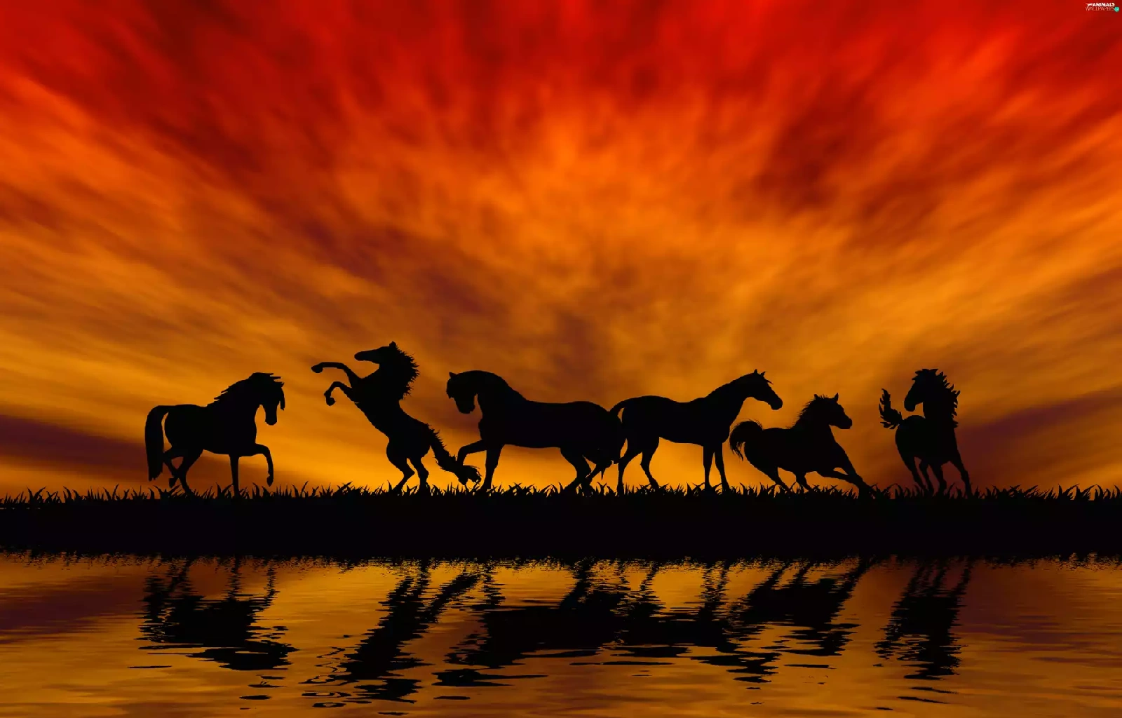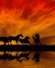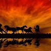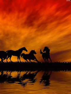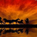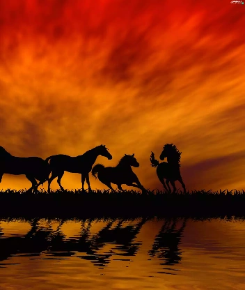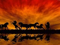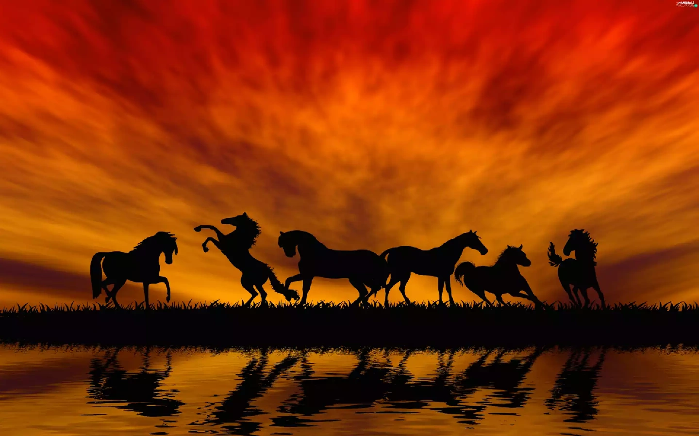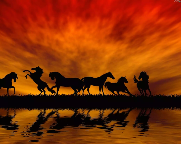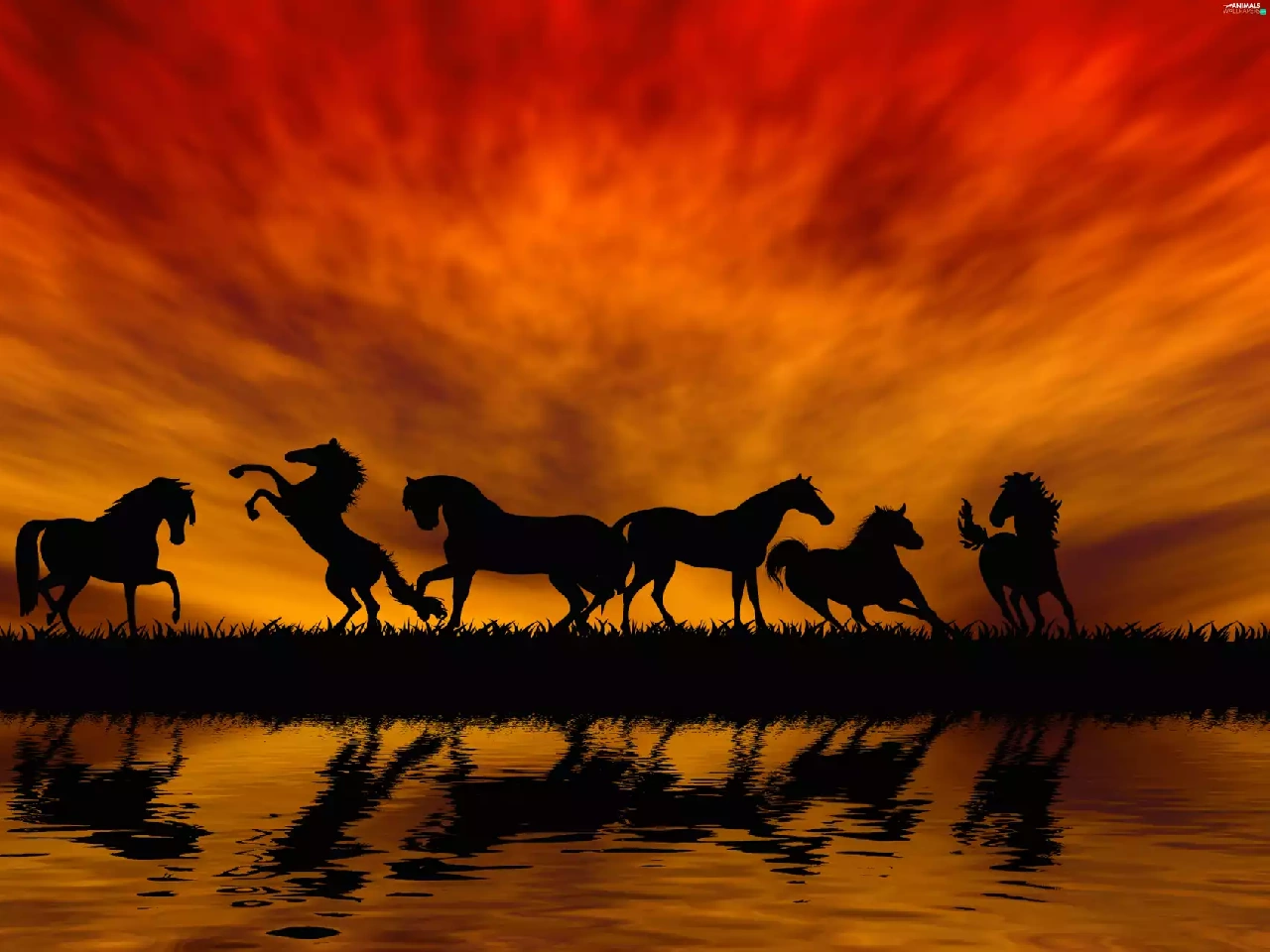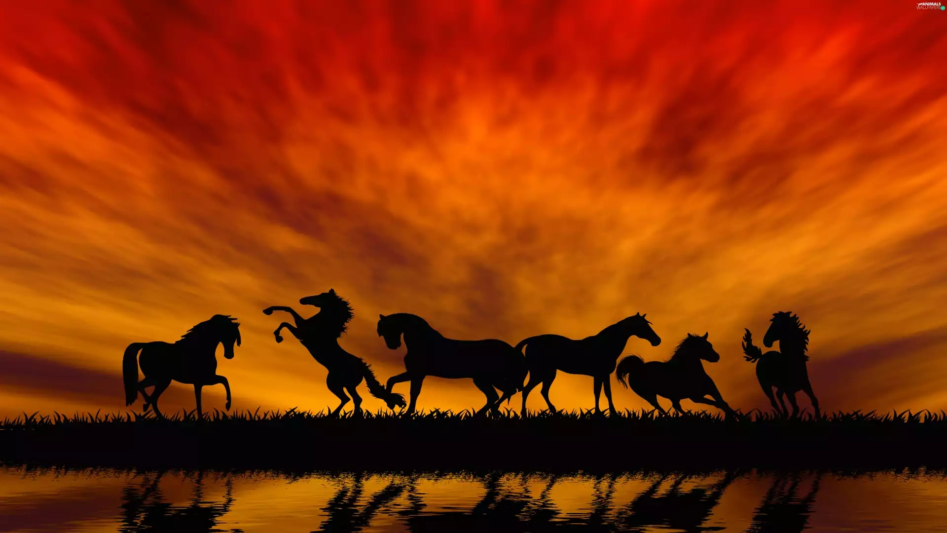 horses, By the lake, sun, herd, west