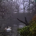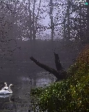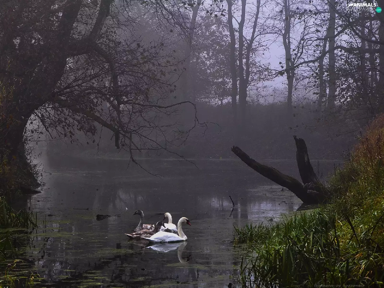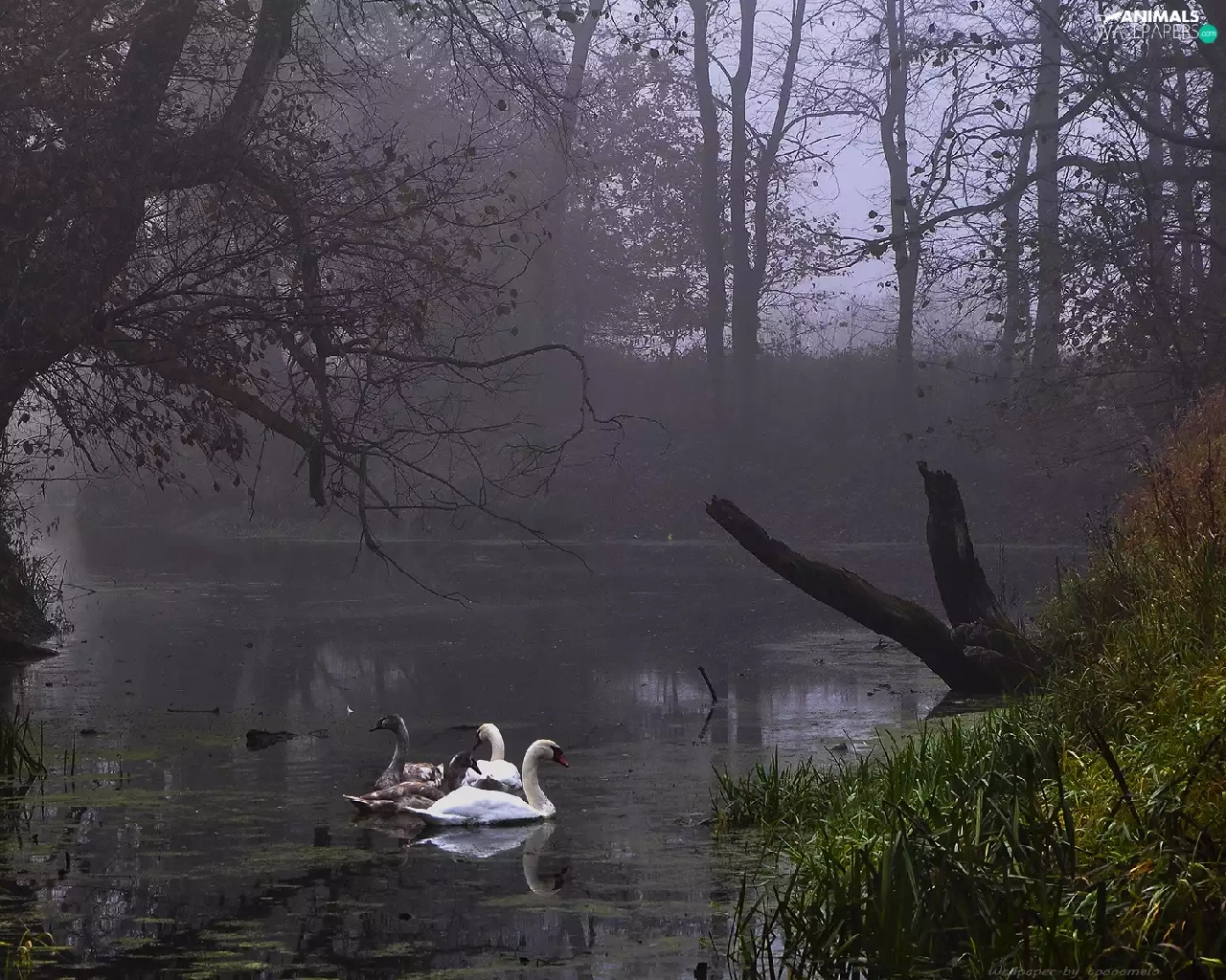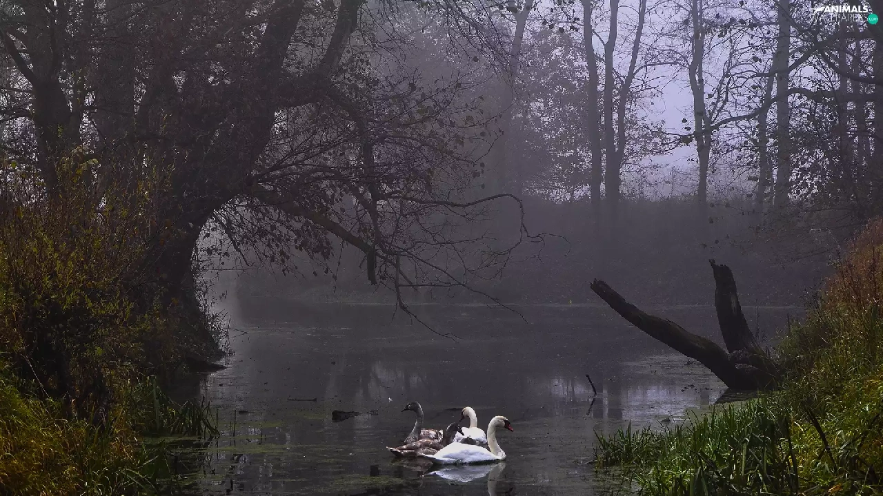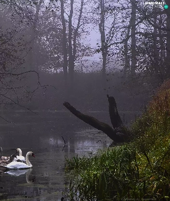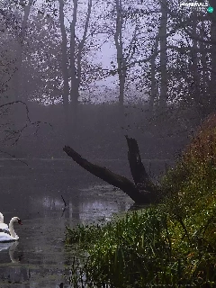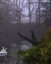 Swan, Fog, Rogalin Landscape Park, Pond - car