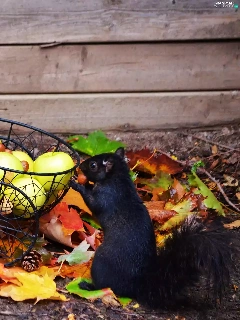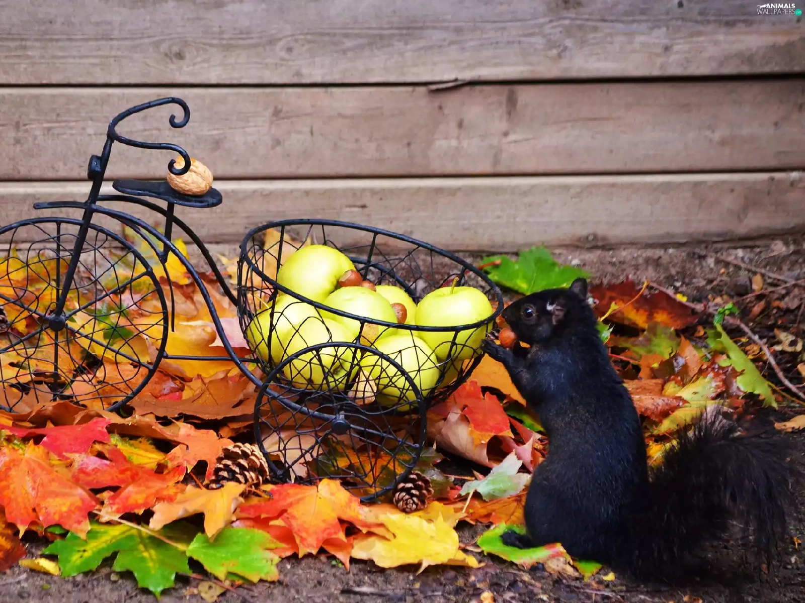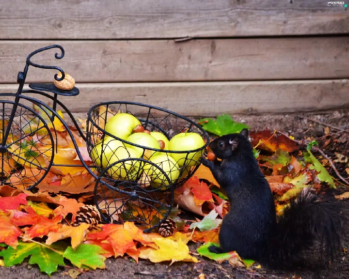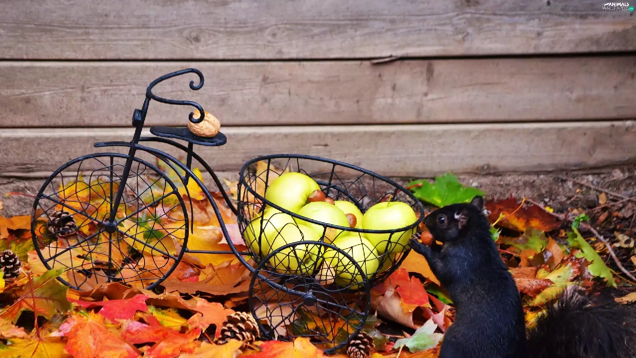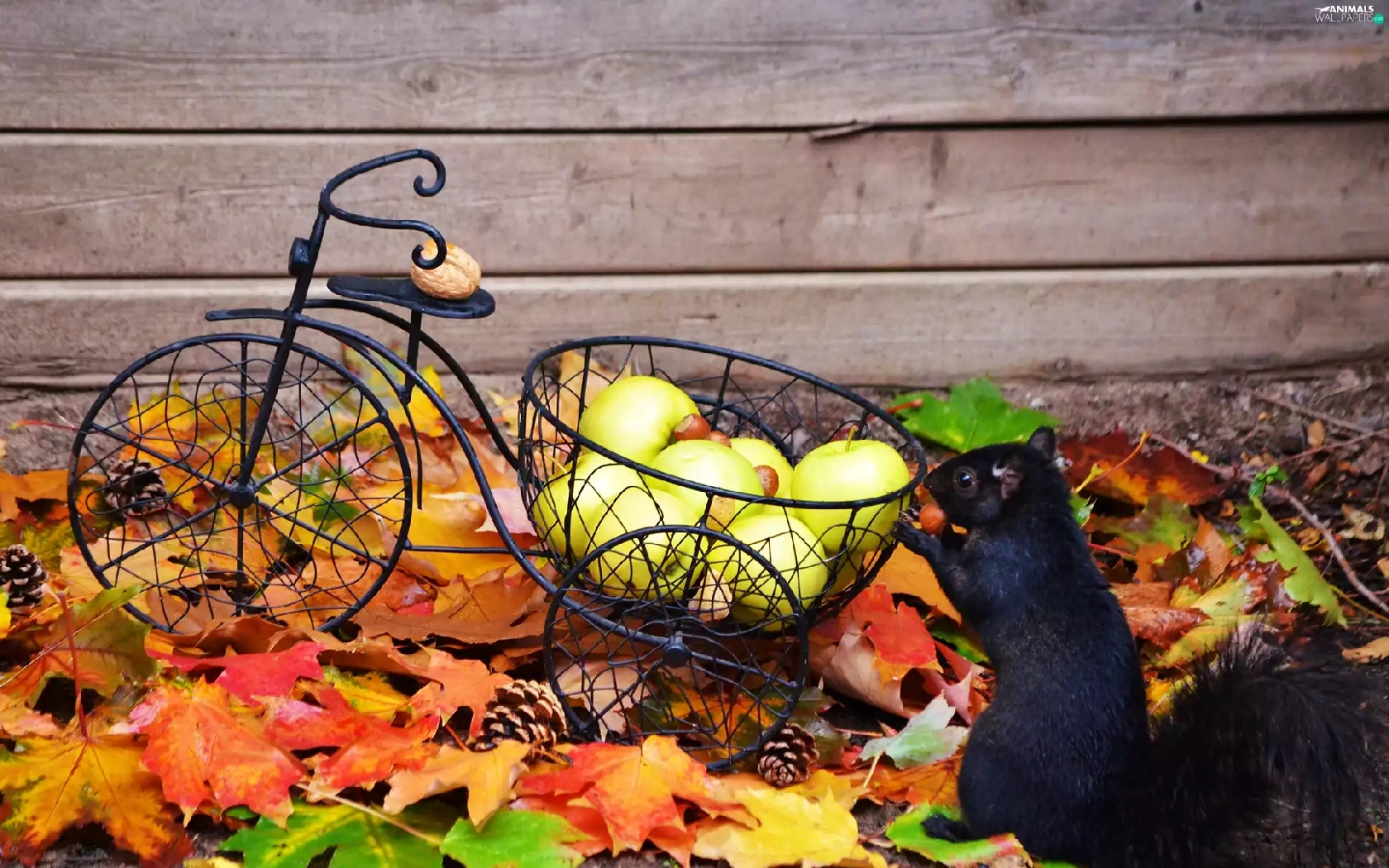 apples, squirrel, Autumn, Leaf, nuts, Bicycle