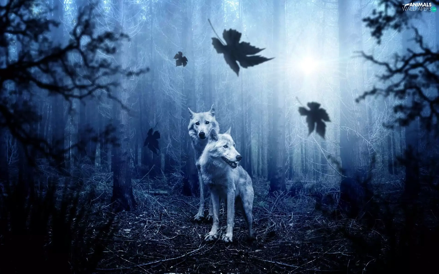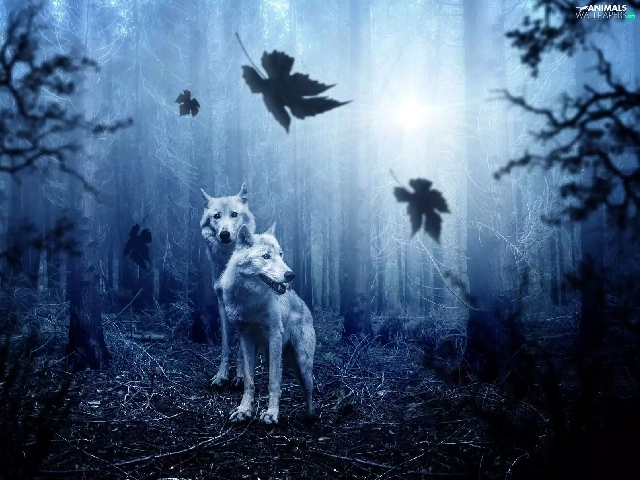 viewes, Leaf, forest, trees, wolves