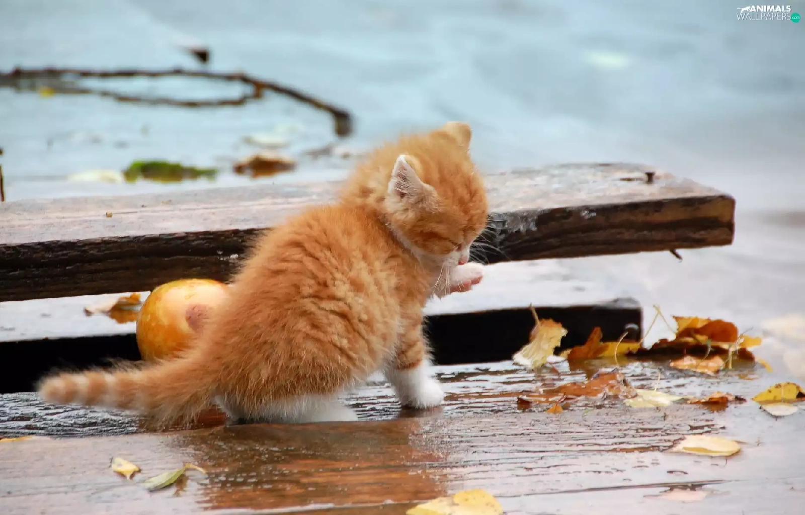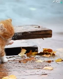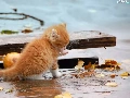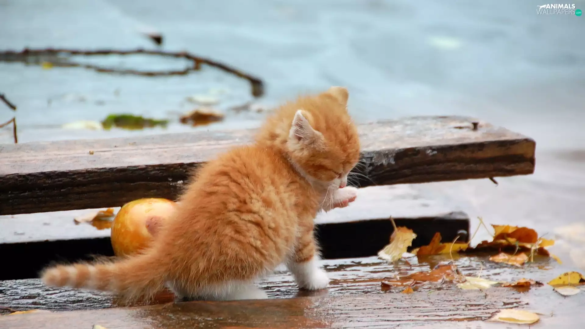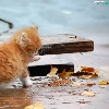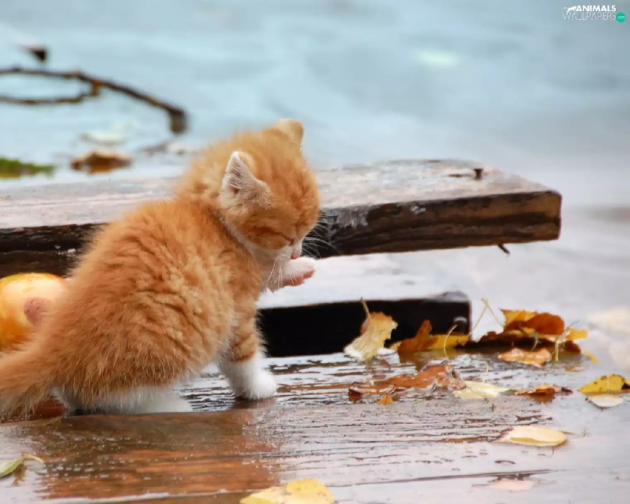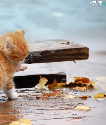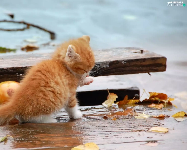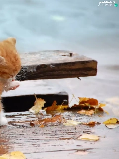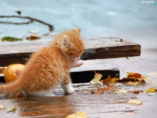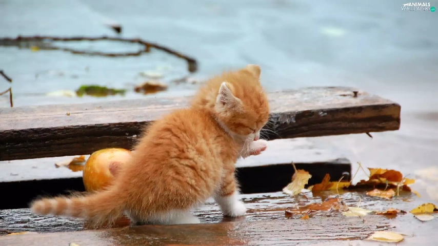 Autumn, Leaf, kitten, board, ginger