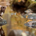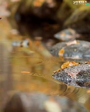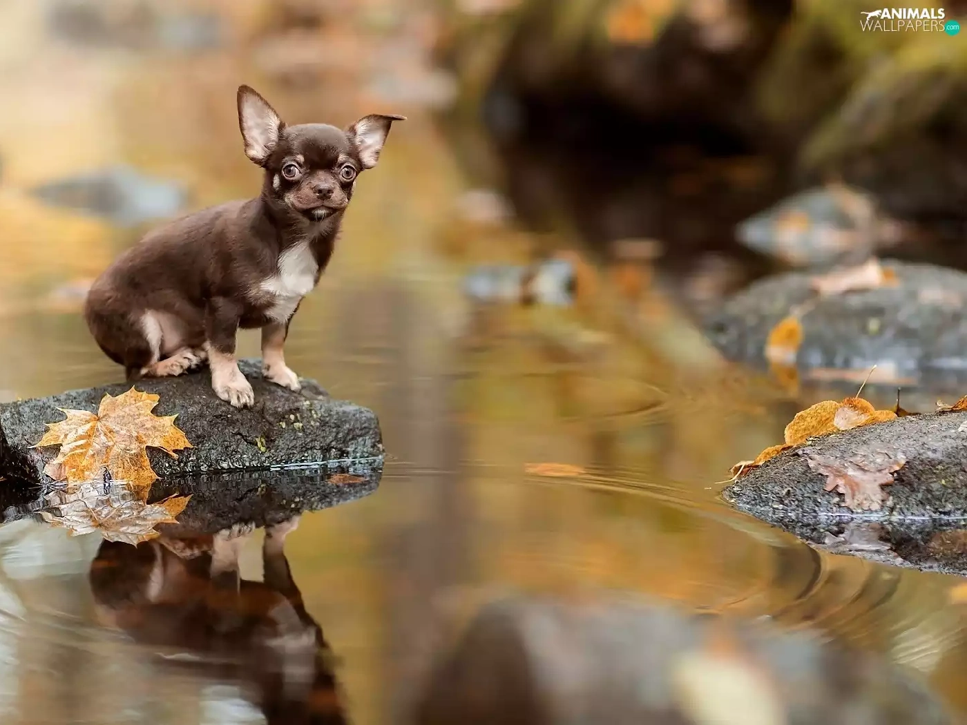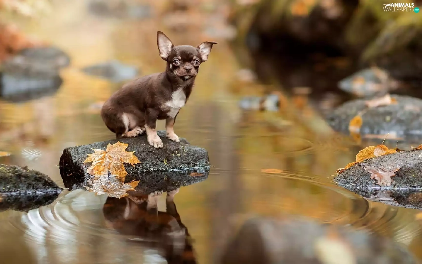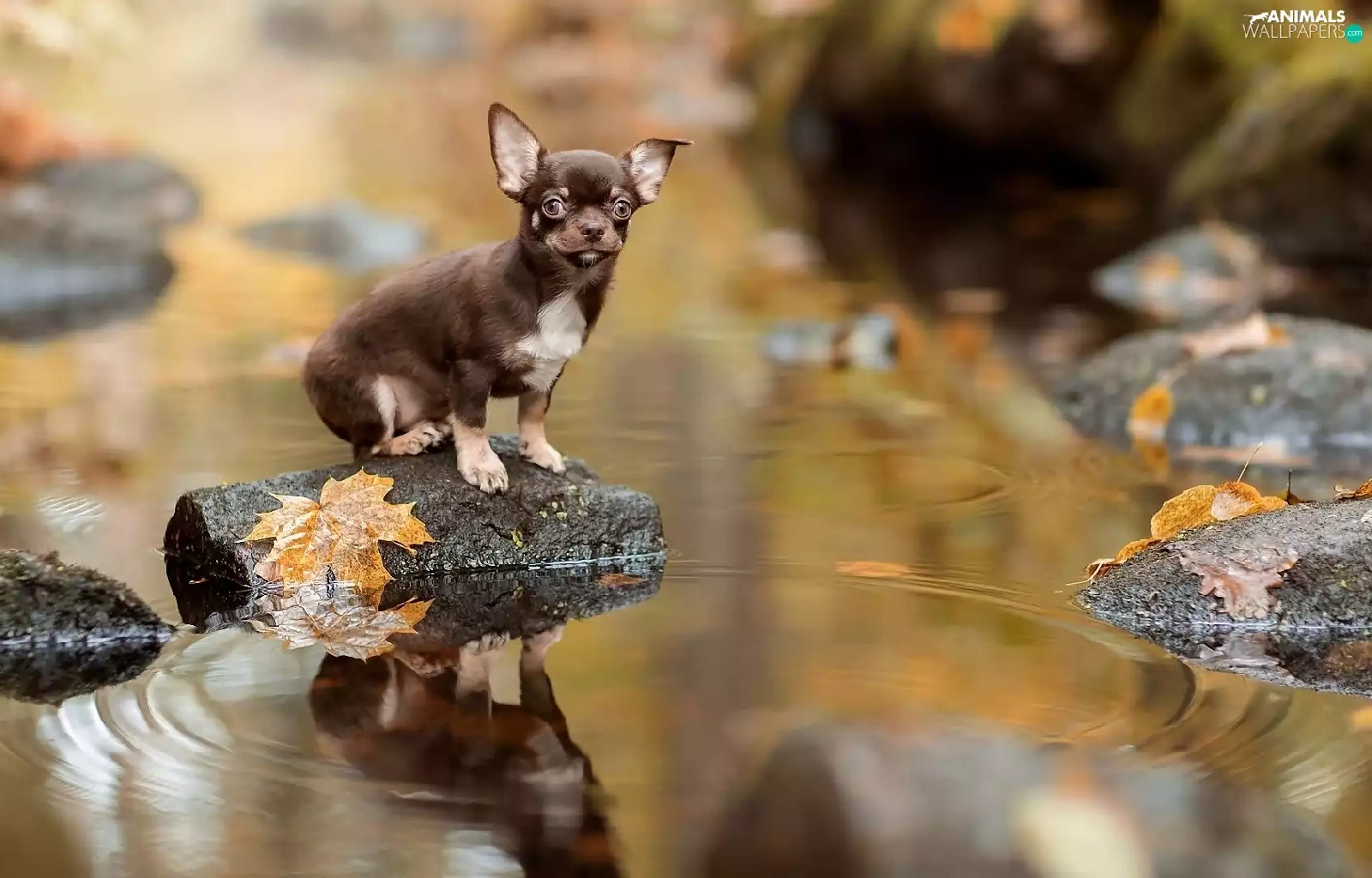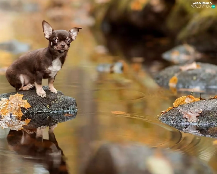 Short-haired Chihuahua, Leaf, Stones, River