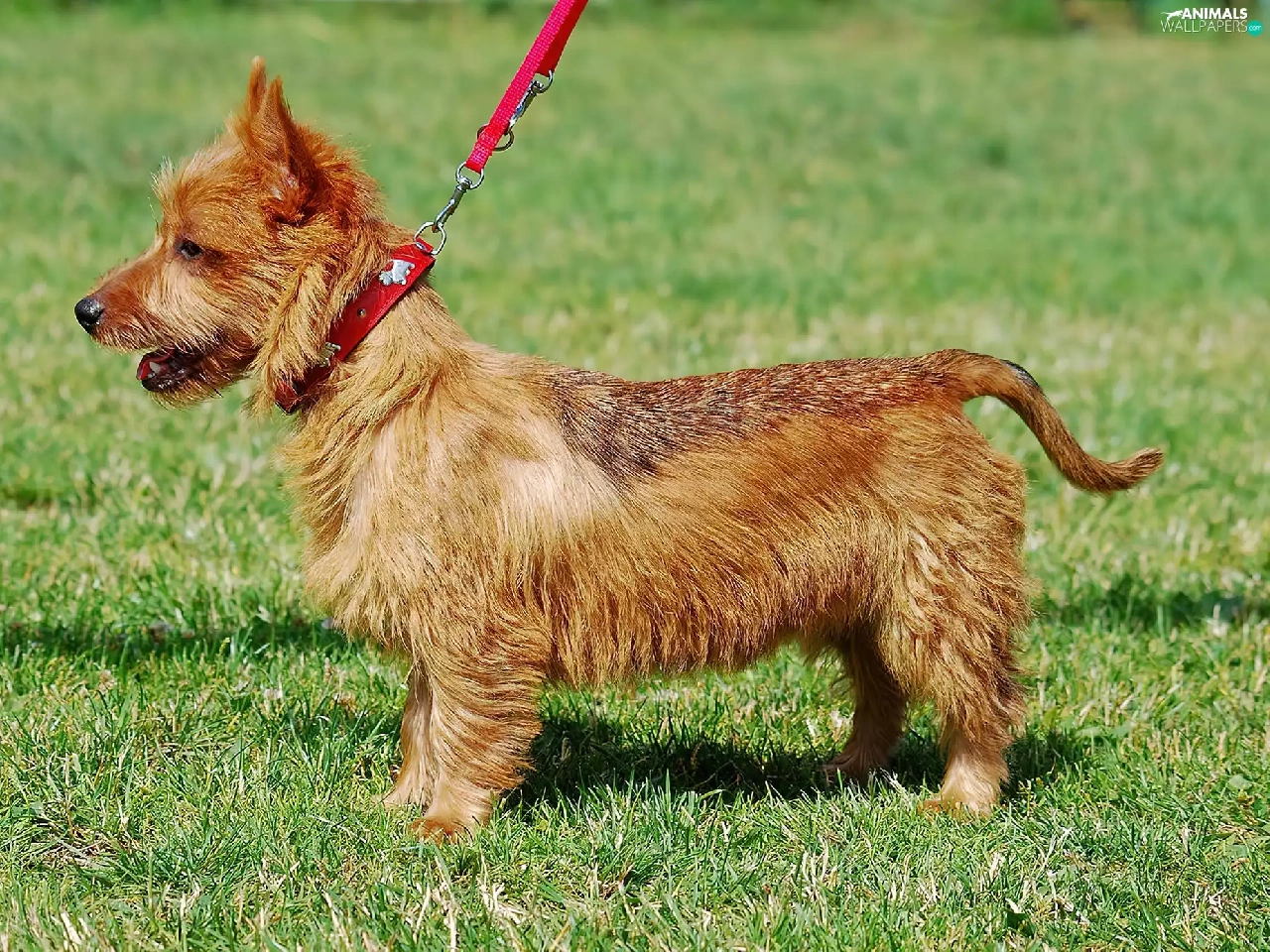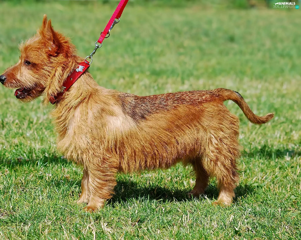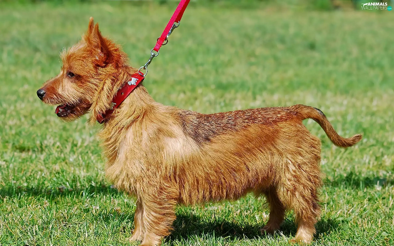 dog, Leash, Lawn, Australian terrier