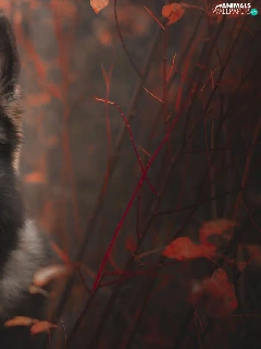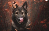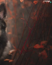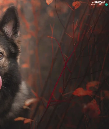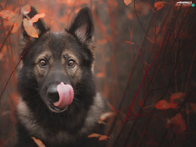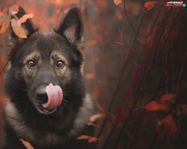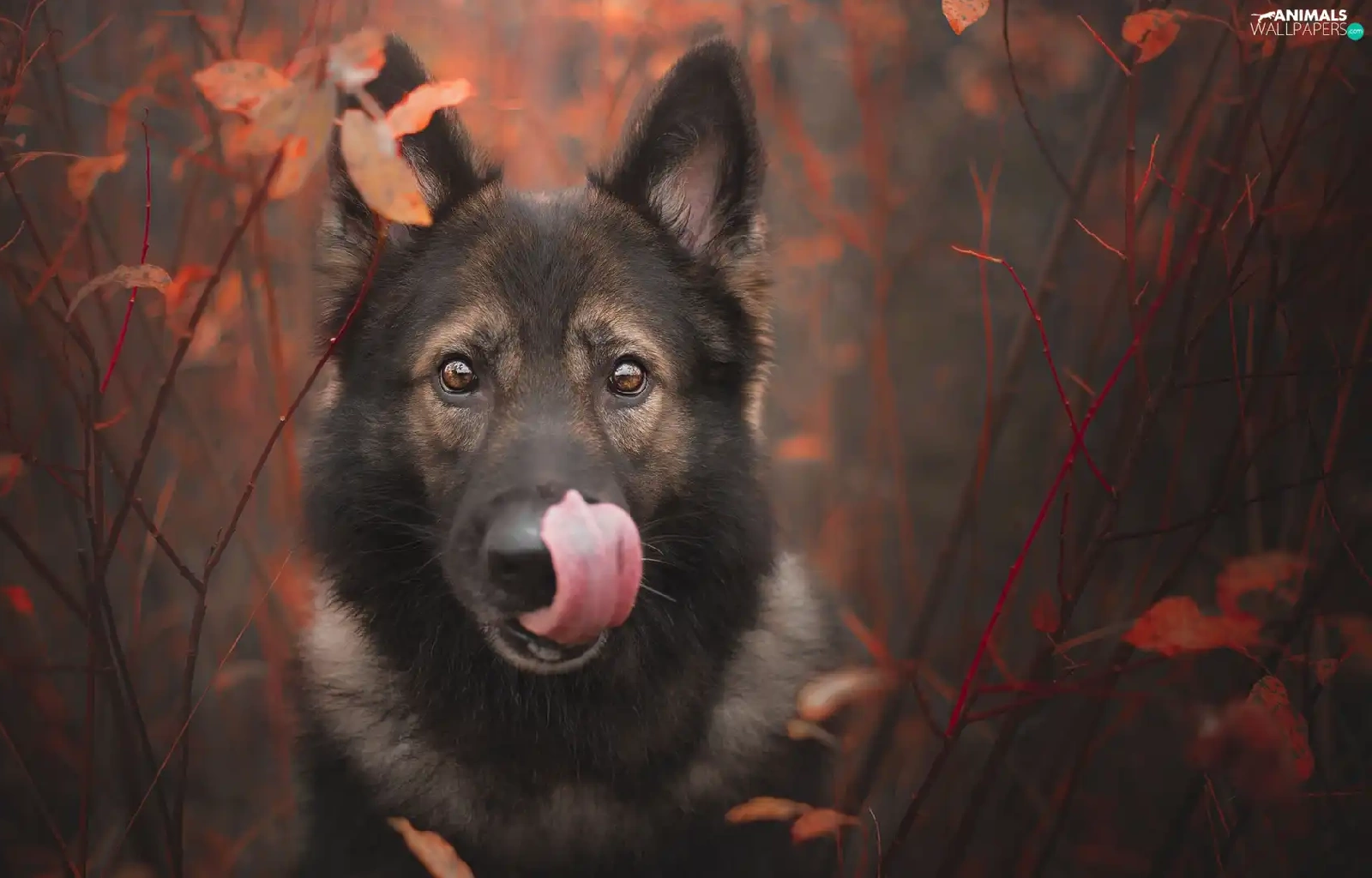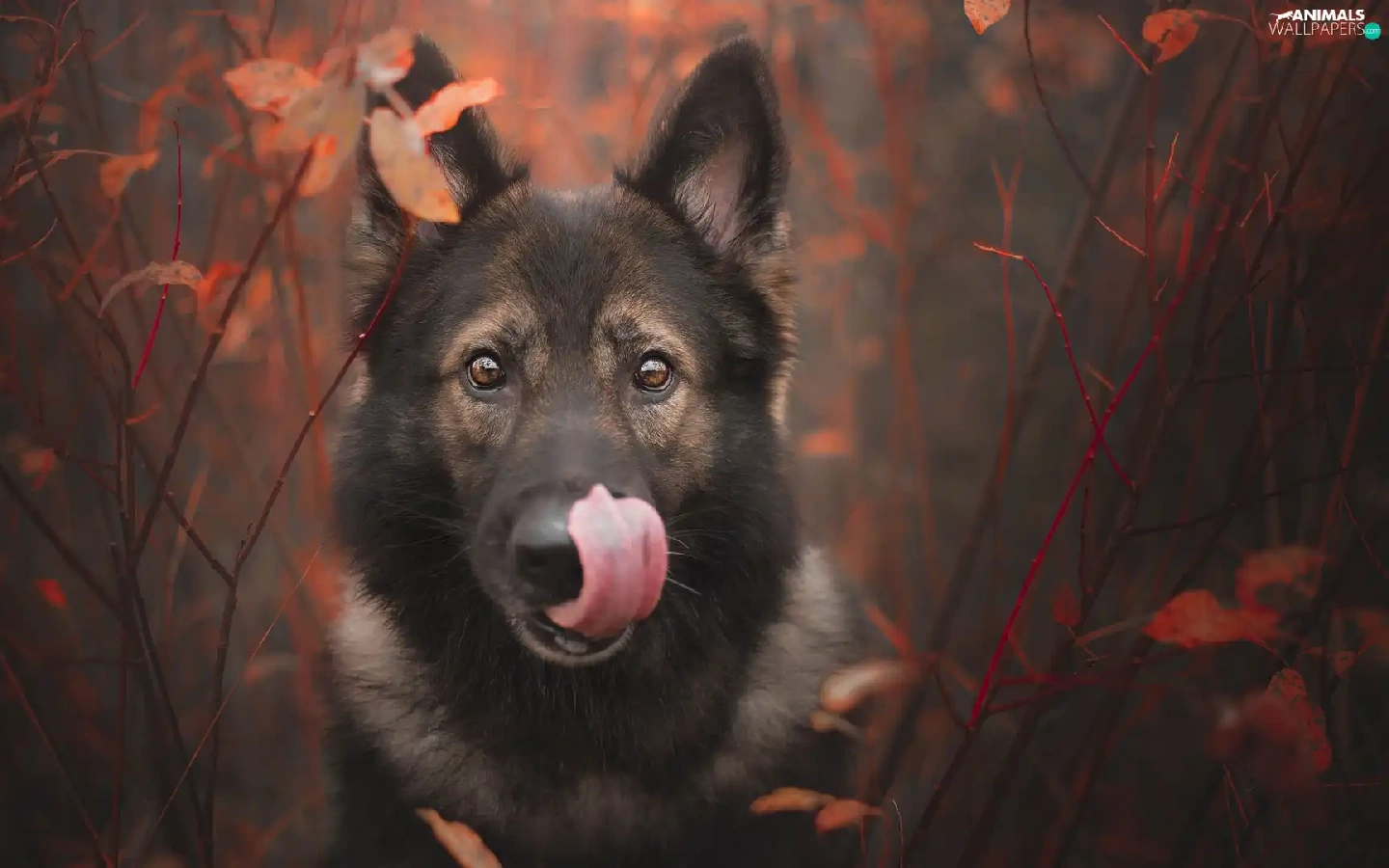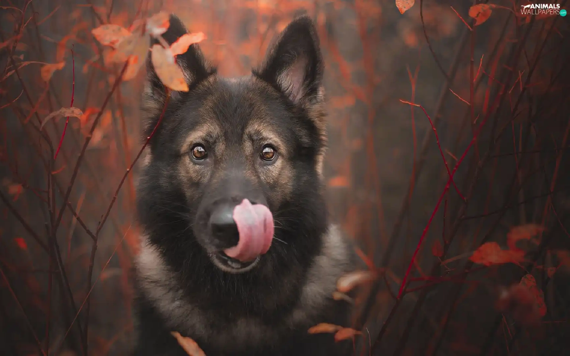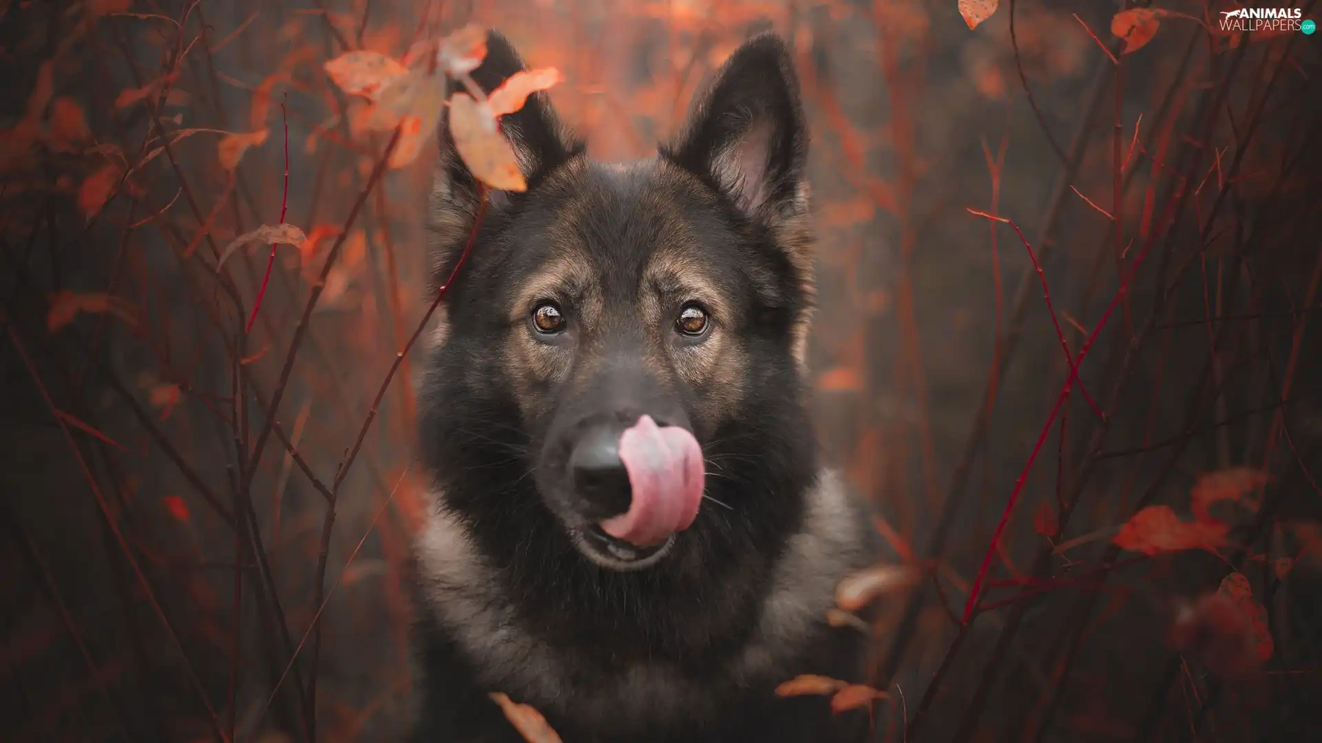muzzle, dog, Twigs, leaves, tongue, German Shepherd