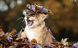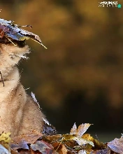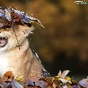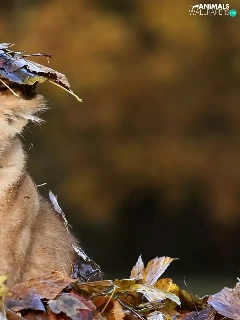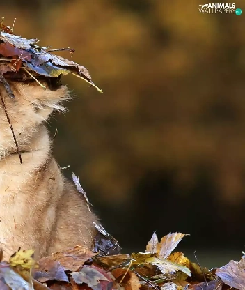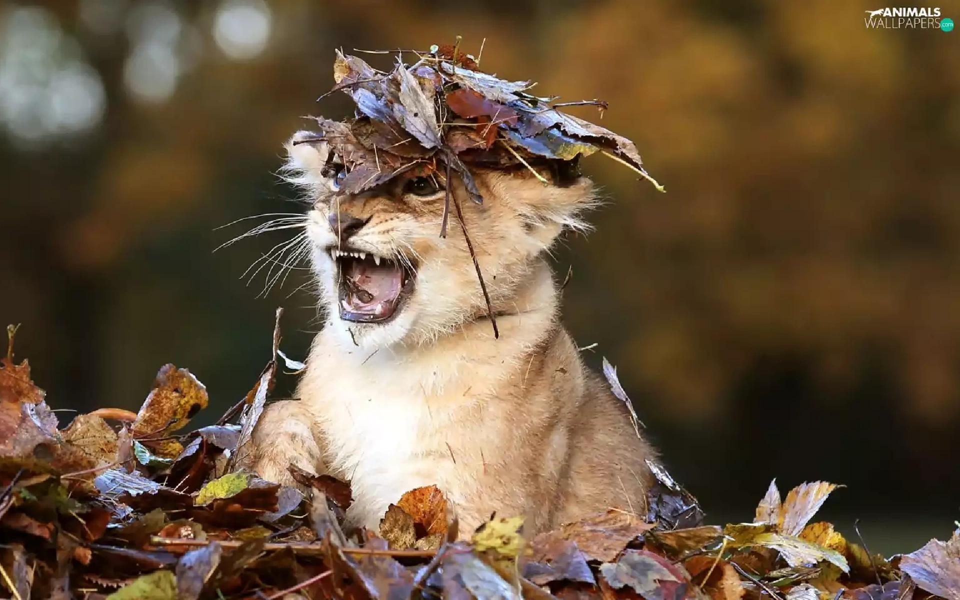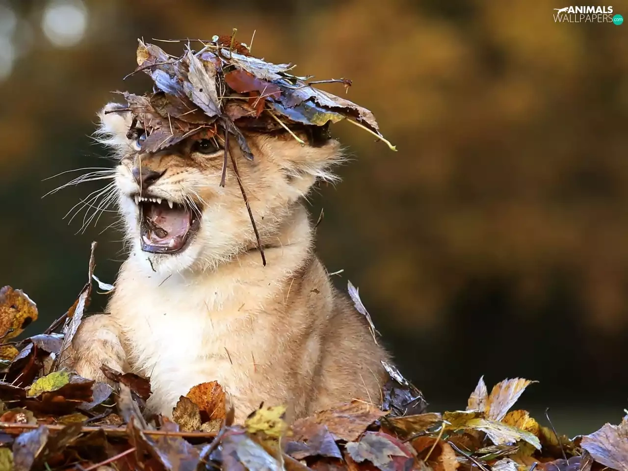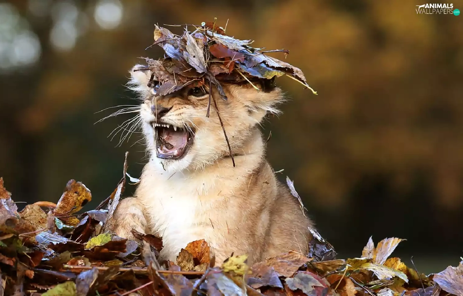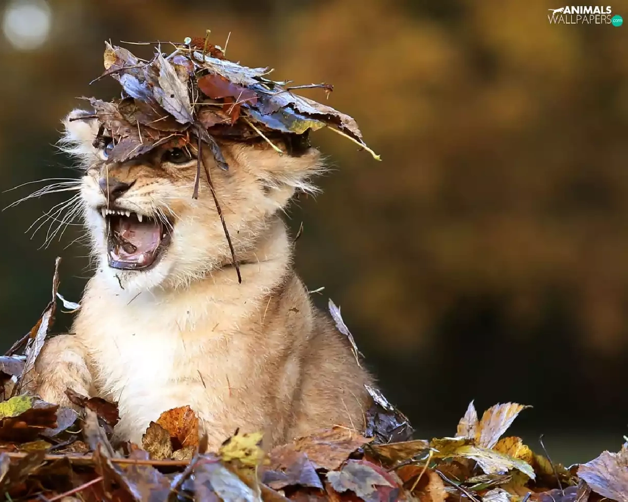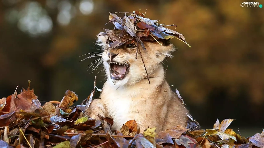 forest, autumn, small lion, Leaf, Terrified
