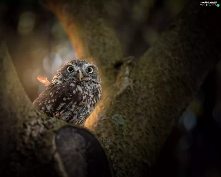 ligh, Little Owl, flash, trees, owl, sun, luminosity