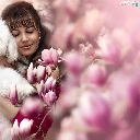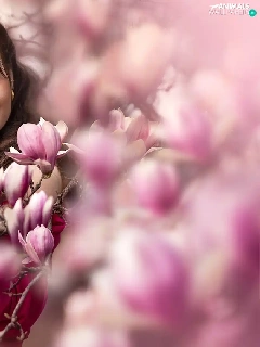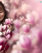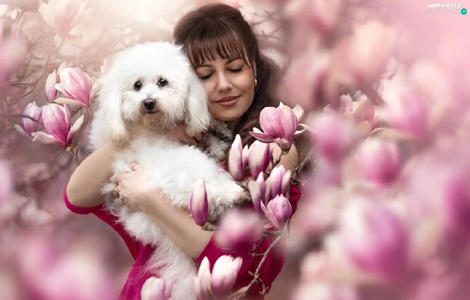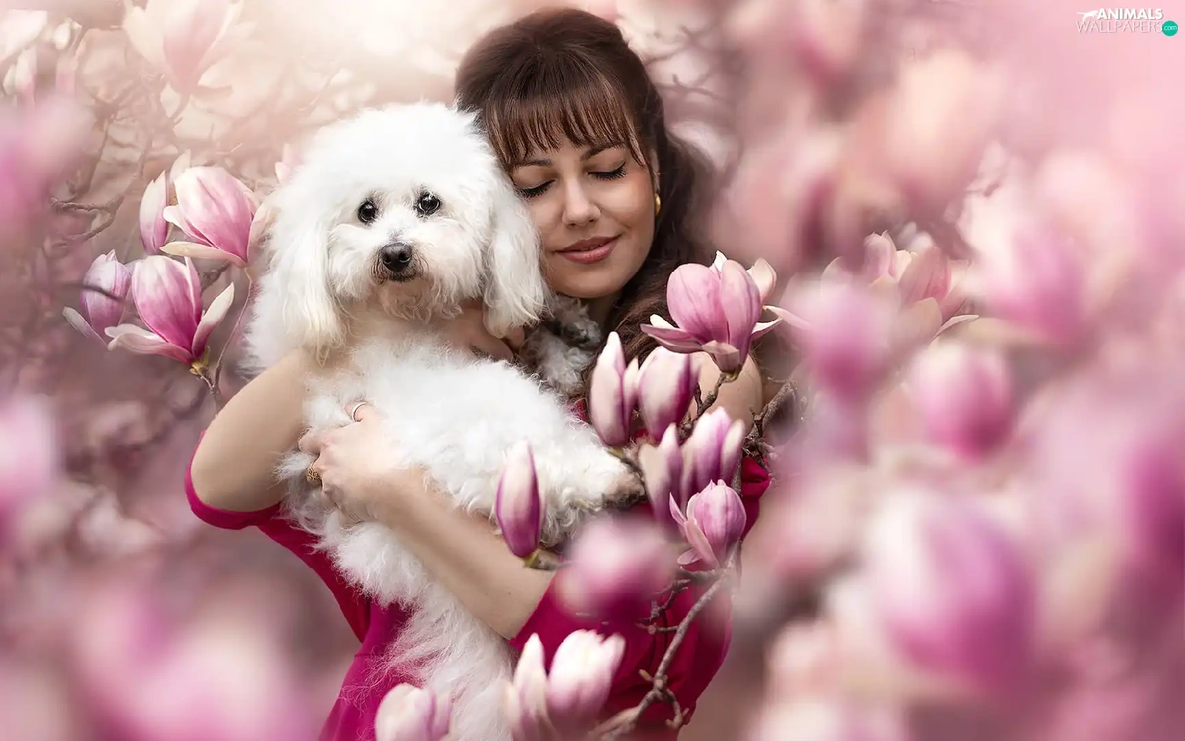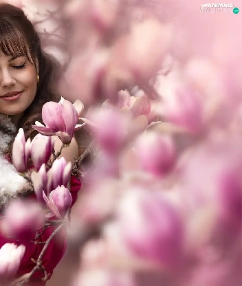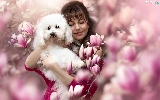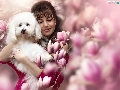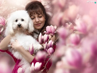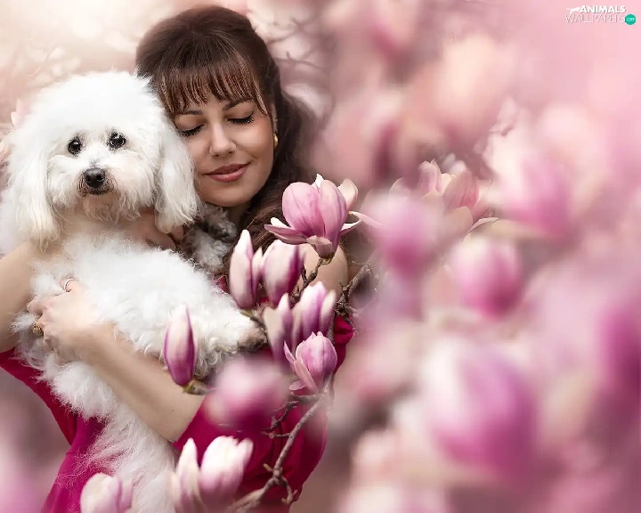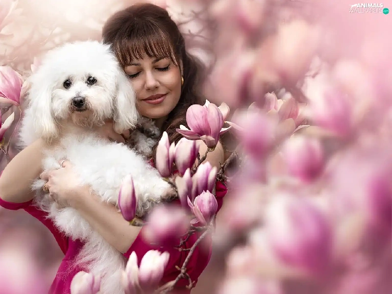 White, Women, Flowers, Magnolias, poodle, dog