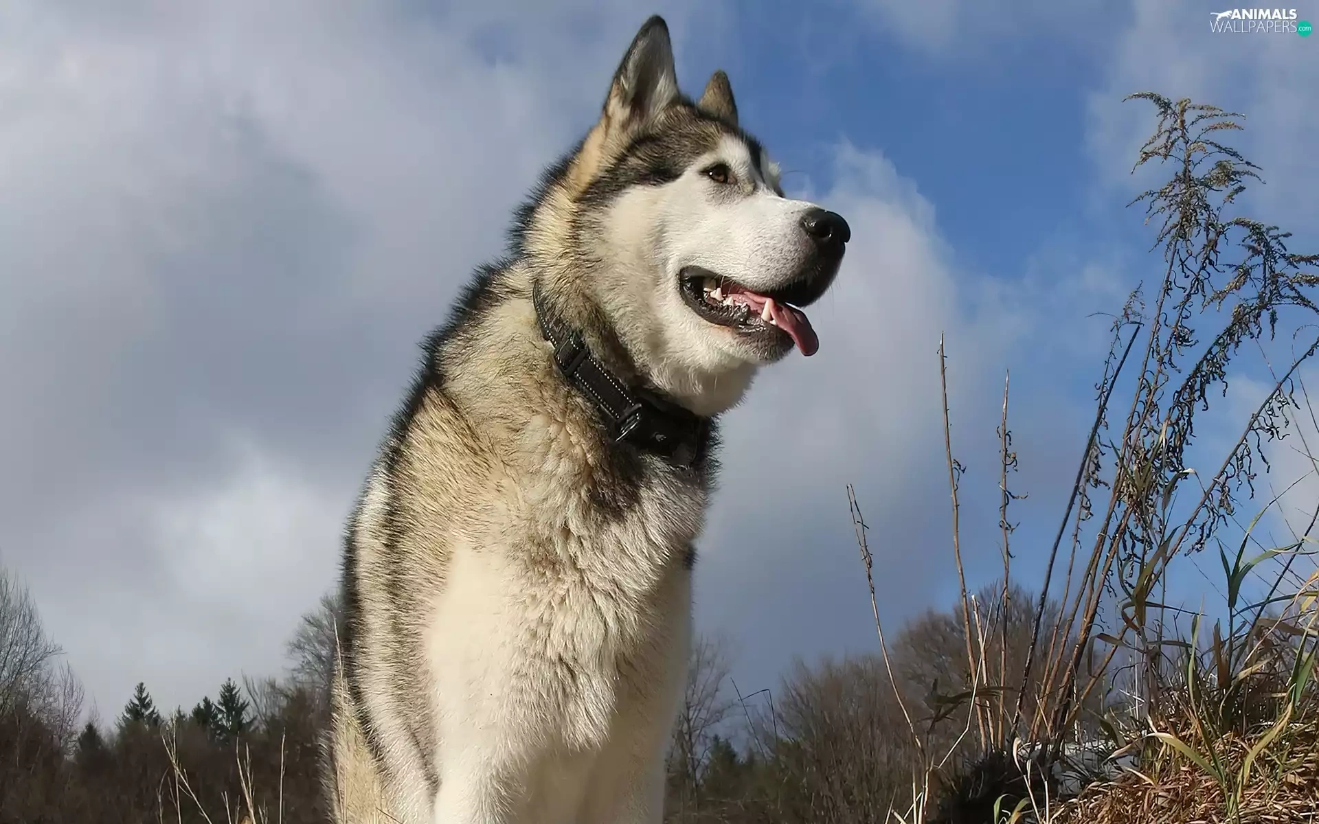 Alaskan Malamute, viewes, grass, trees