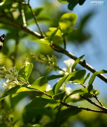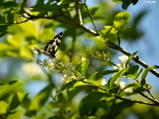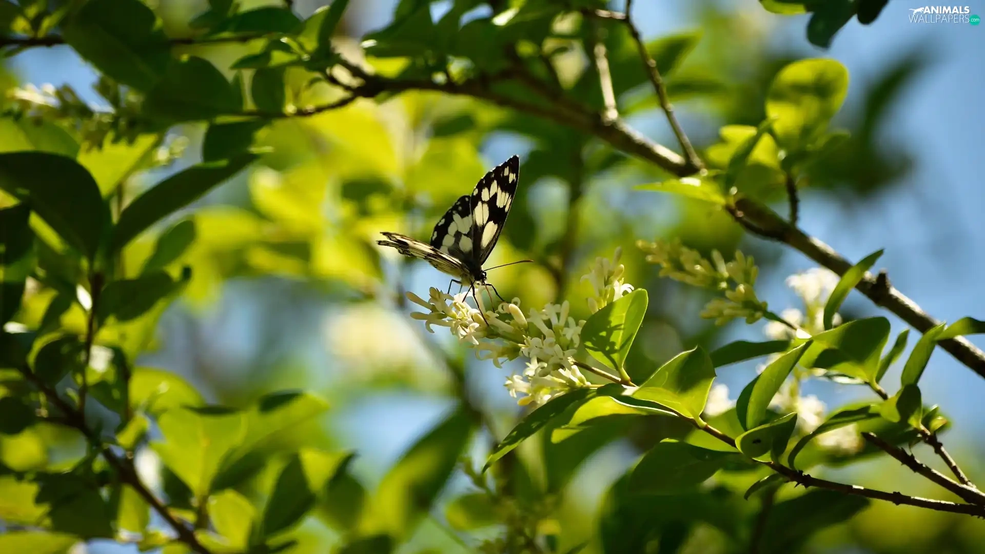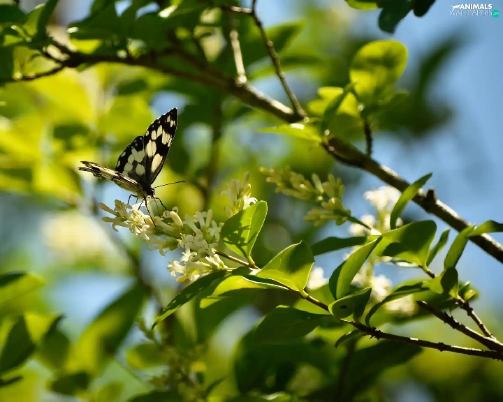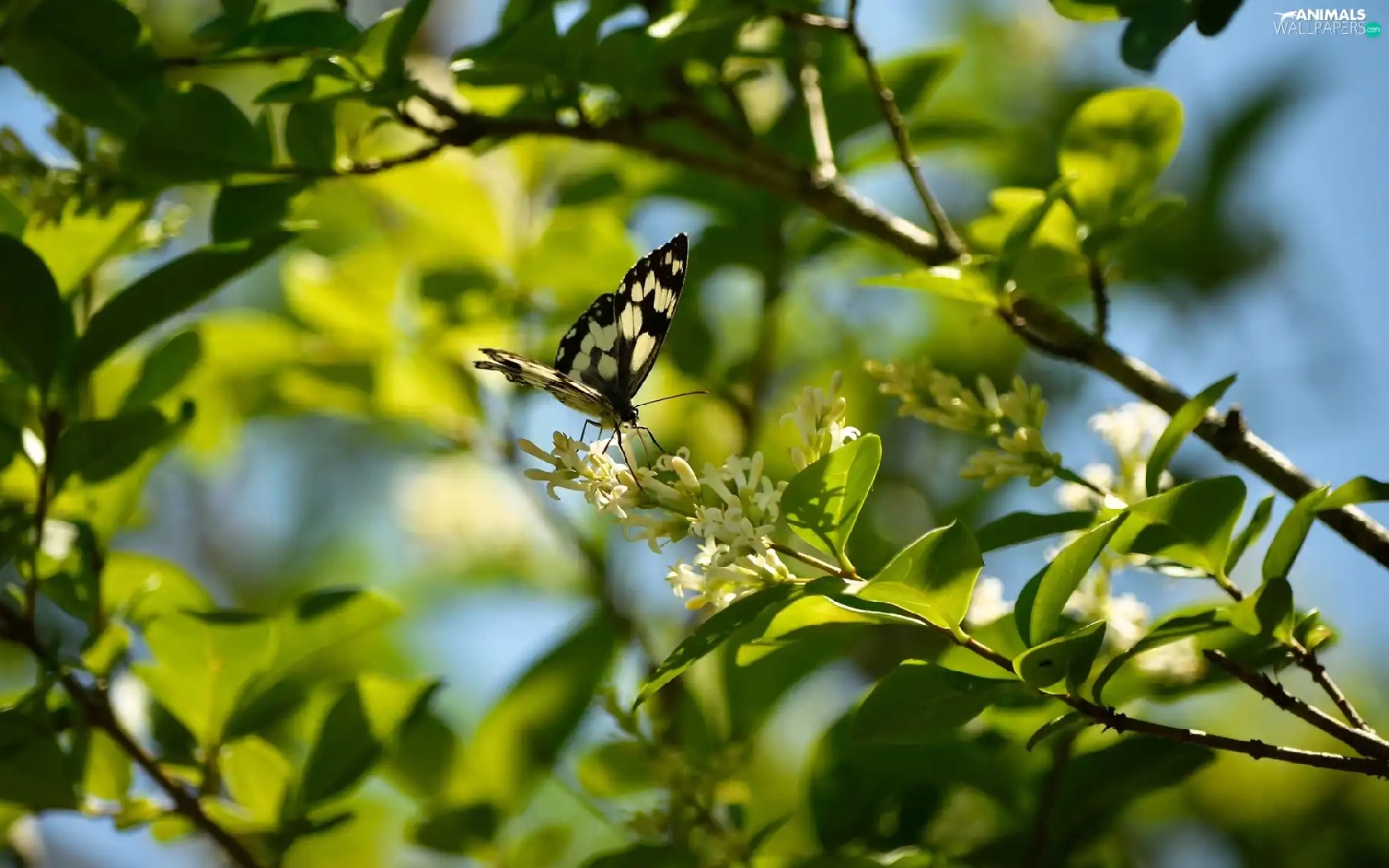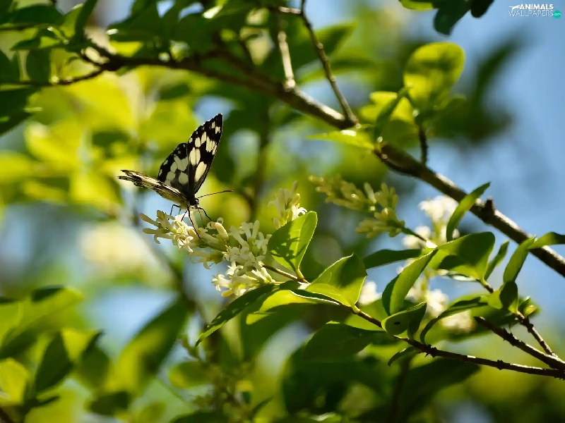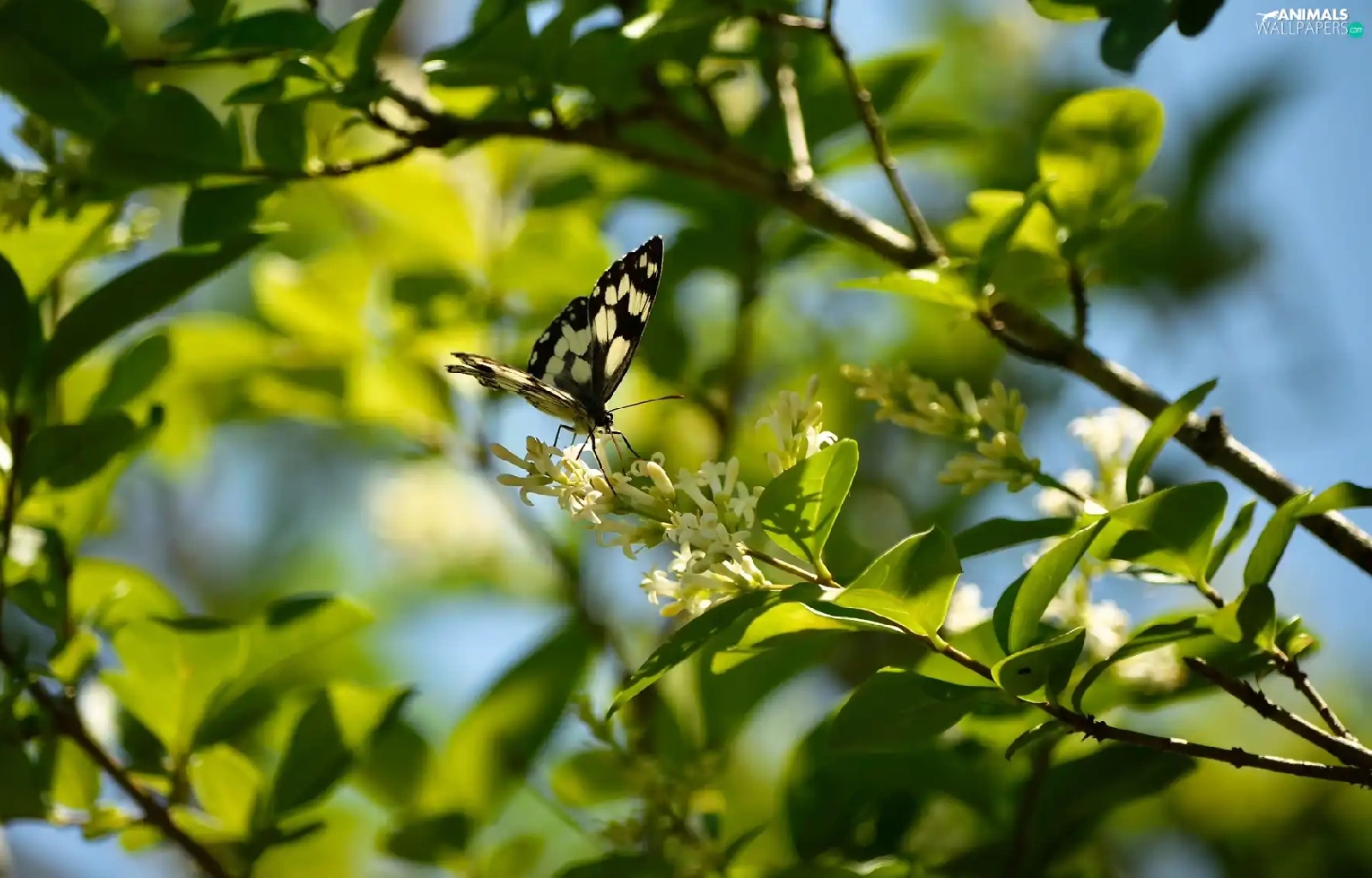 marbled chessboard, butterfly, Twigs, Flowers, flash, luminosity, ligh, sun, White