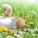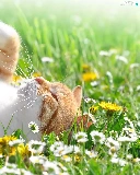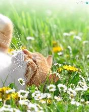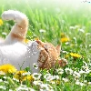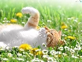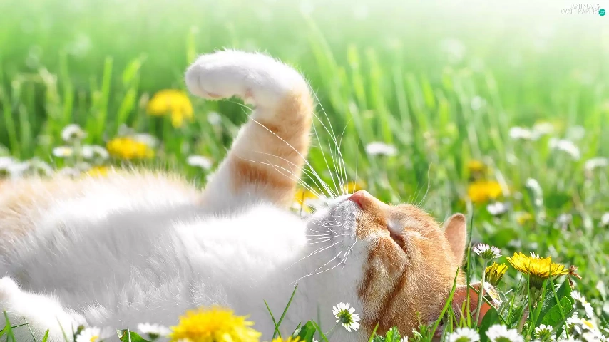 daisies, dandelions, cat, Meadow, white and red