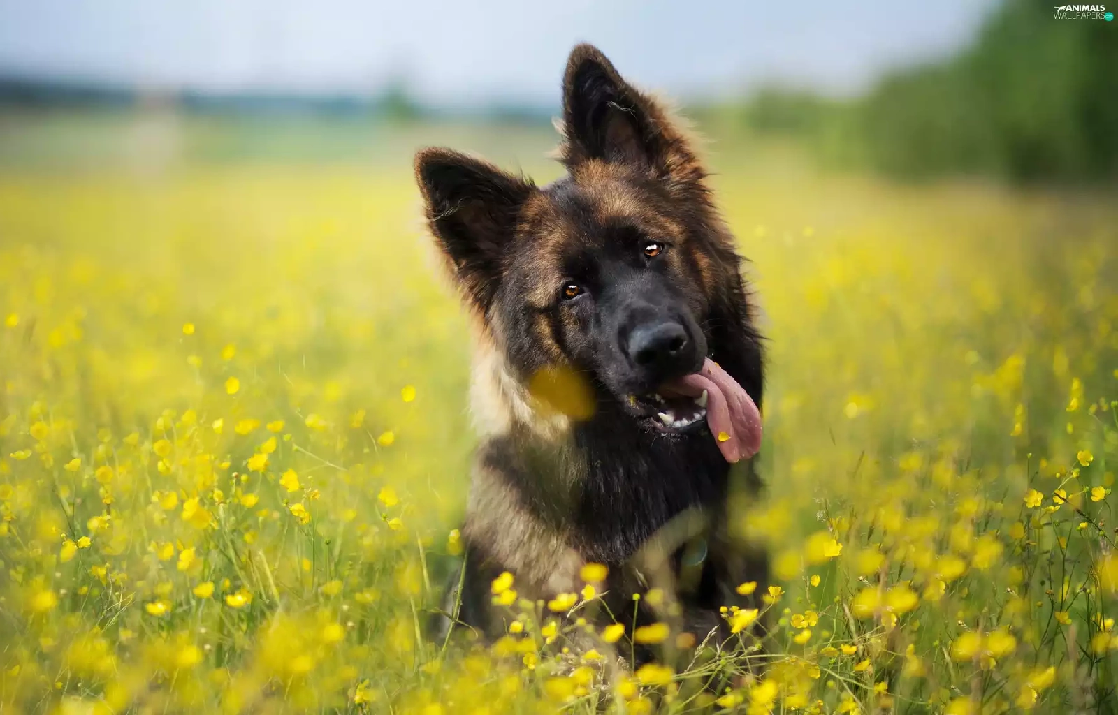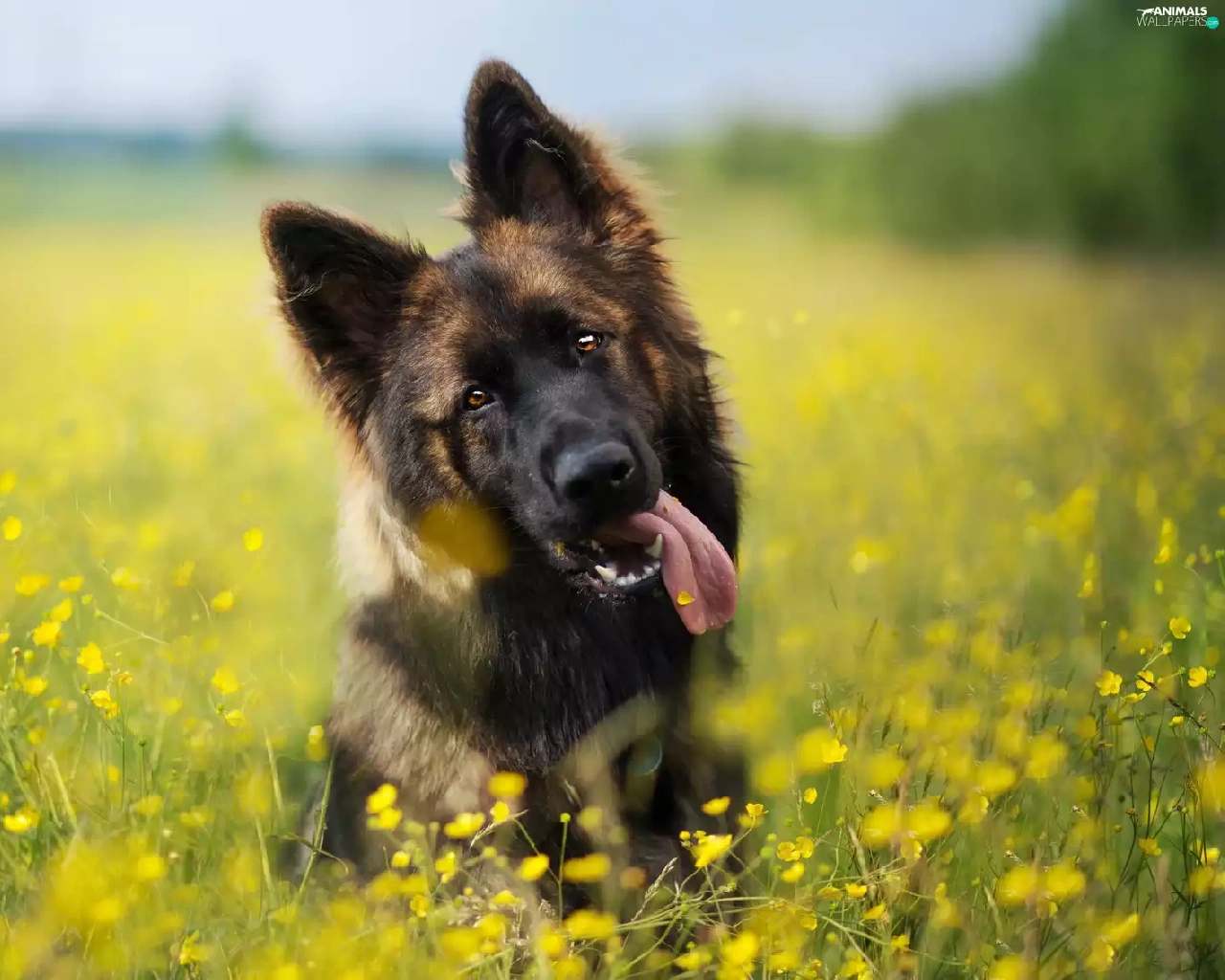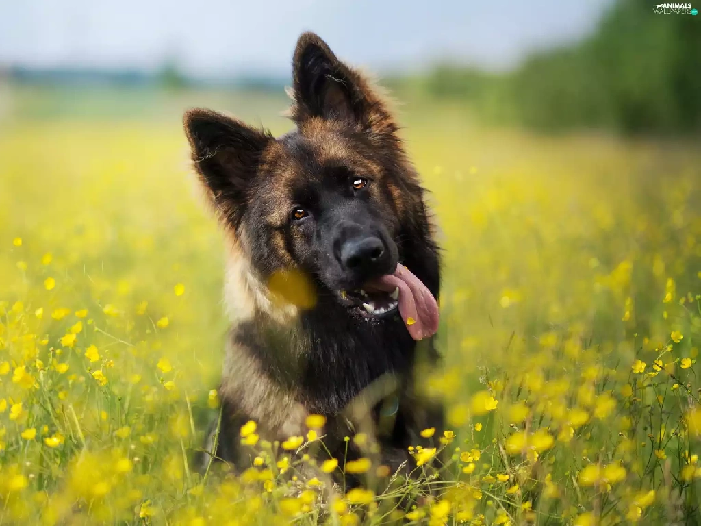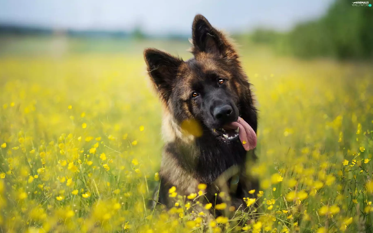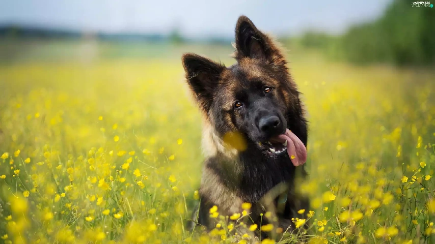 dog, Meadow, Flowers, German Shepherd