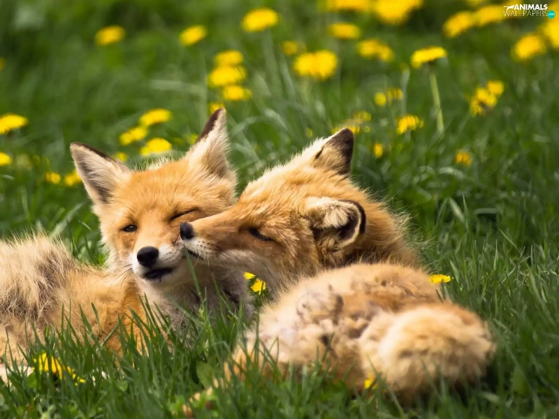 foxes, dandelions, Spring, Meadow
