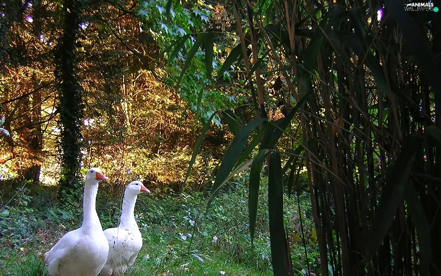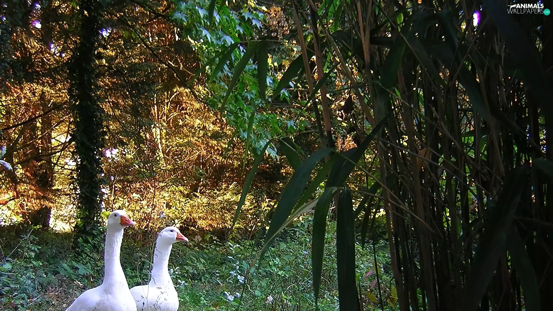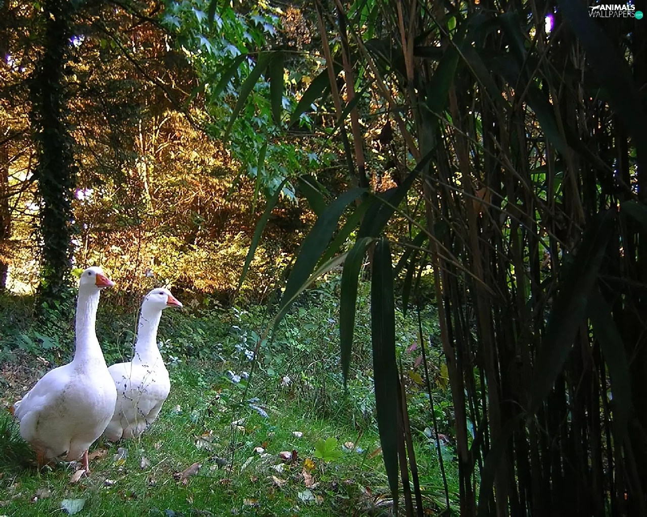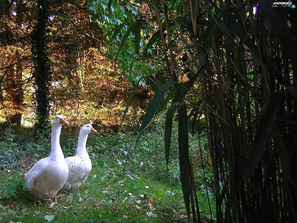 geese, trees, viewes, Meadow
