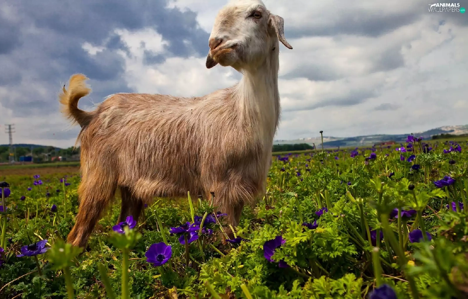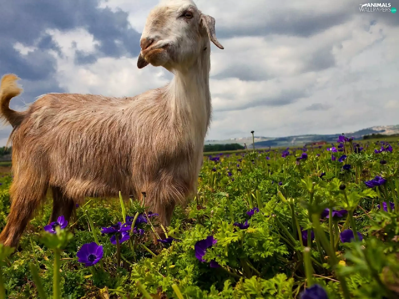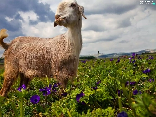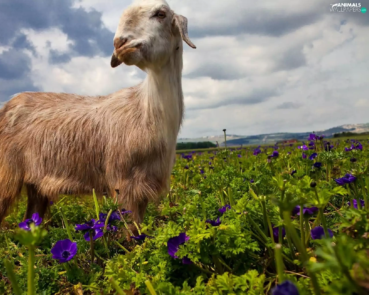 goat, purple, Flowers, Meadow