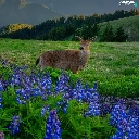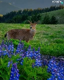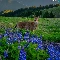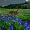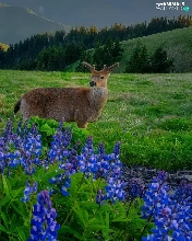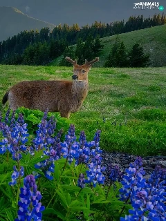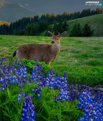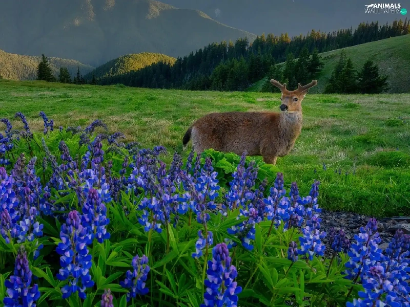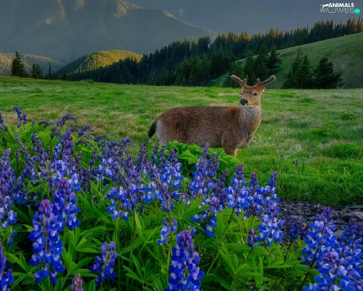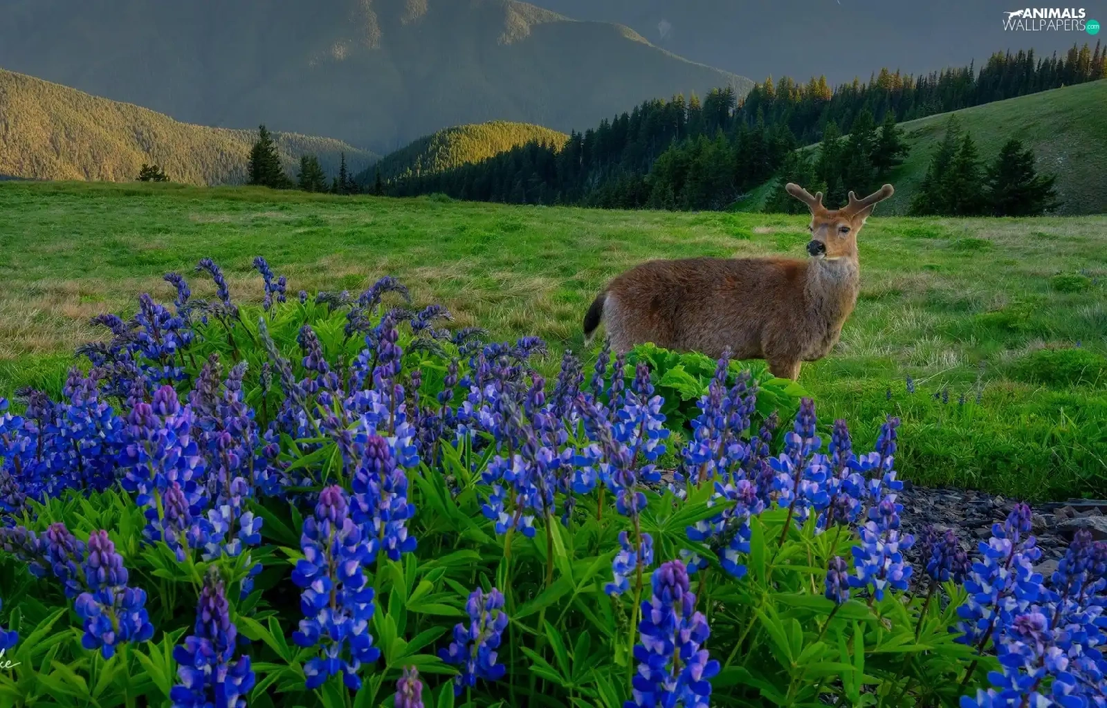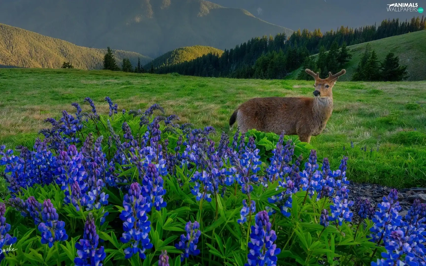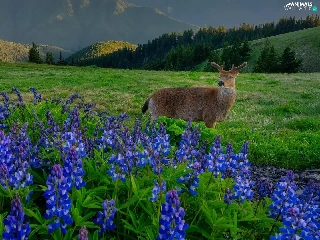 Meadow, Mountains, lupine, fawn, Flowers, car in the meadow
