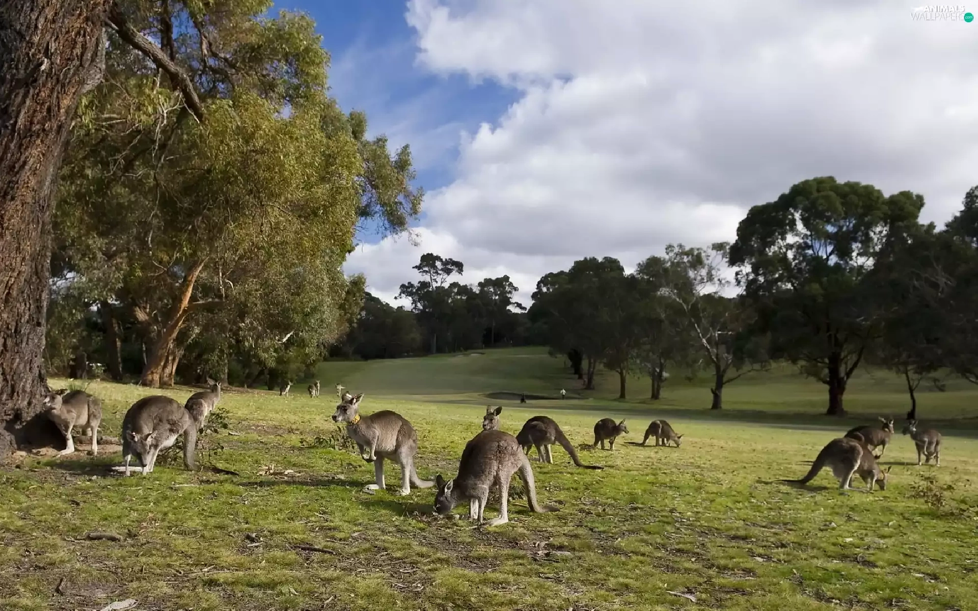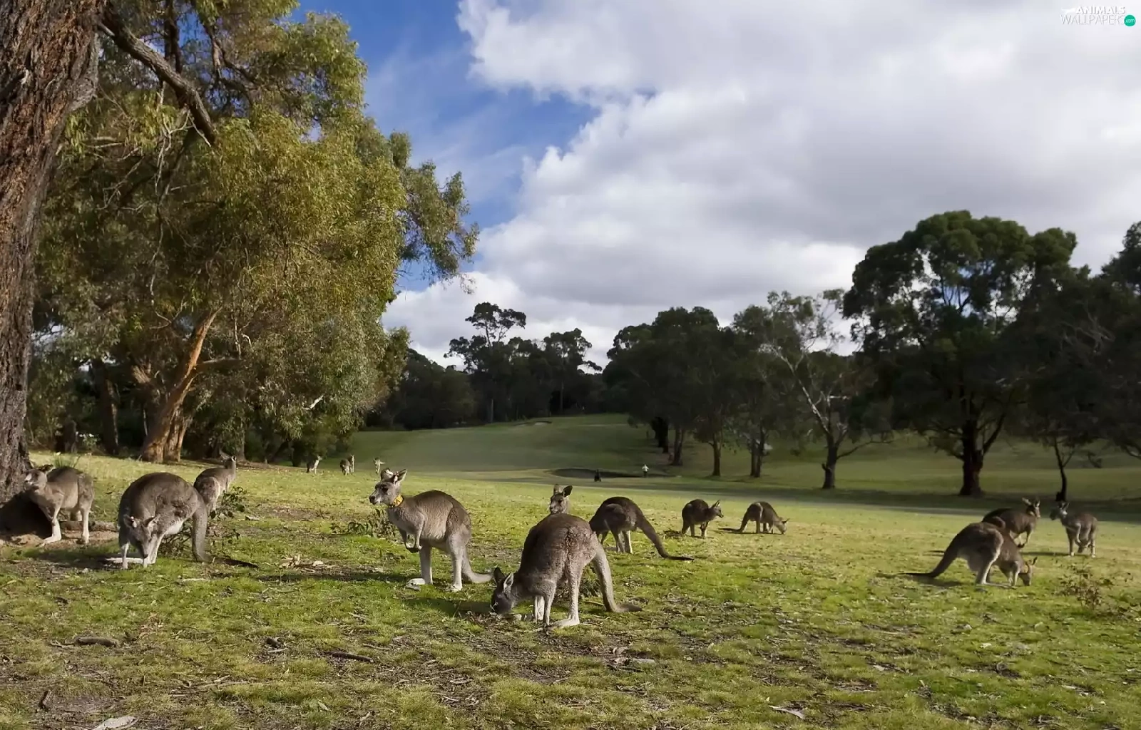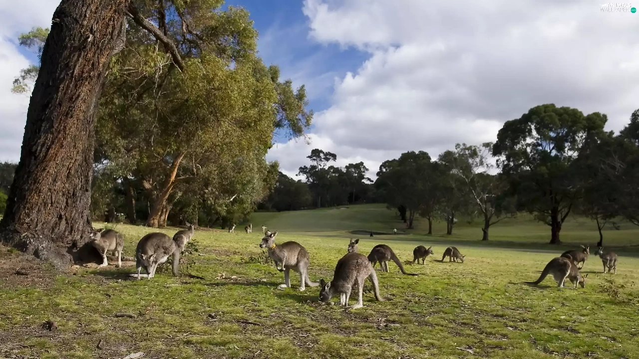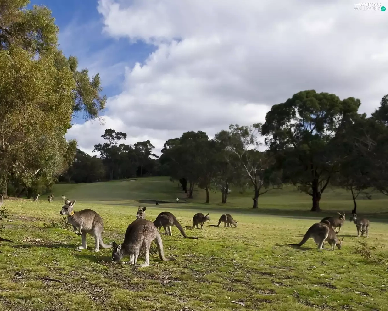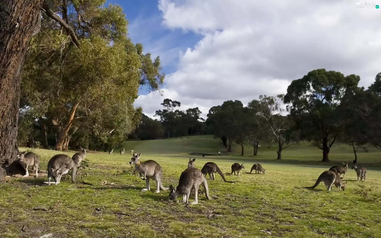 kangaroo, trees, viewes, Meadow