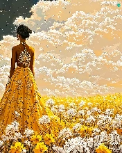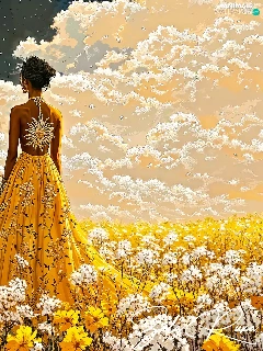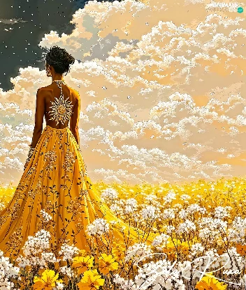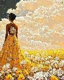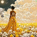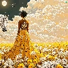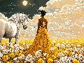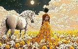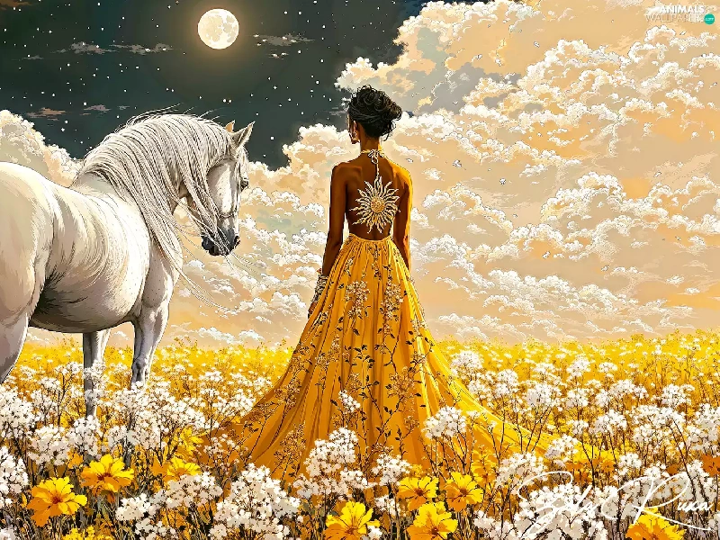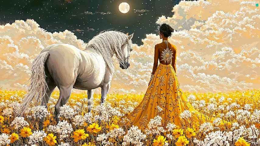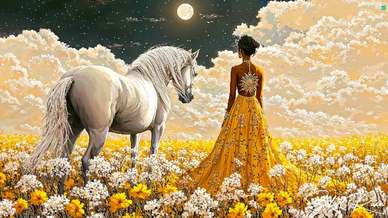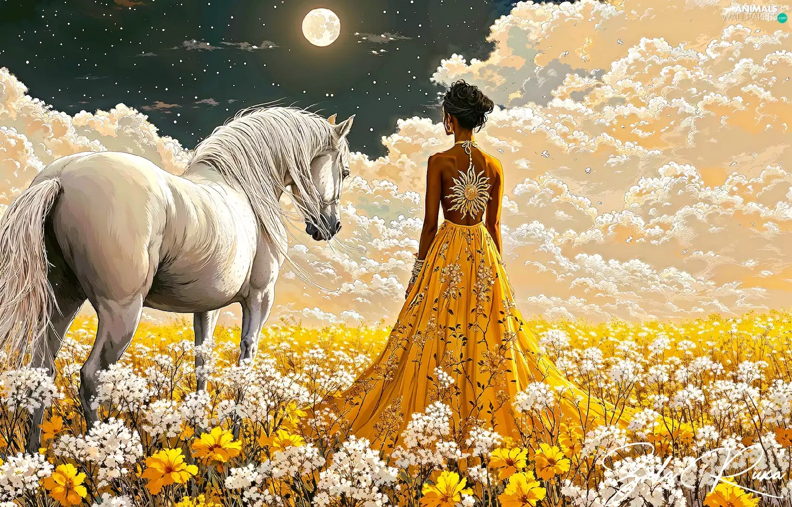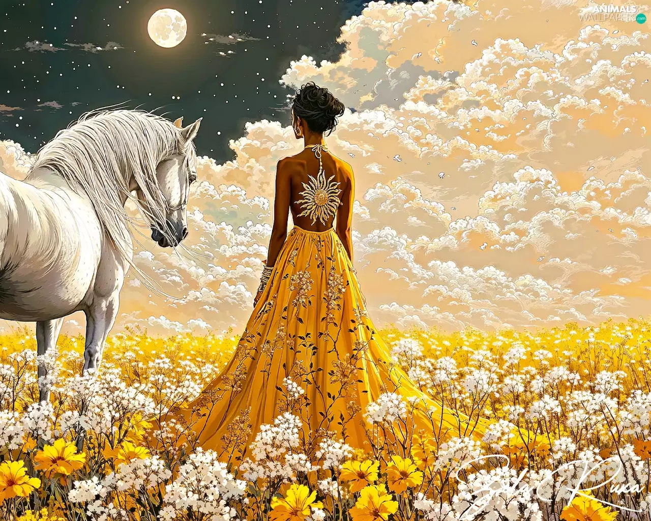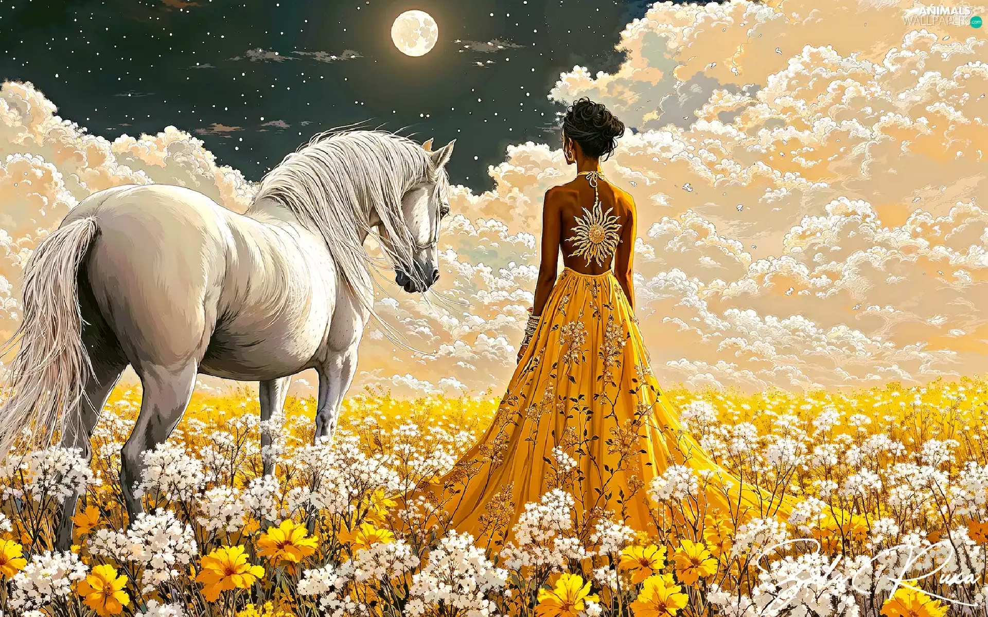 Flowers, Horse, moon, Meadow, Women, clouds, graphics