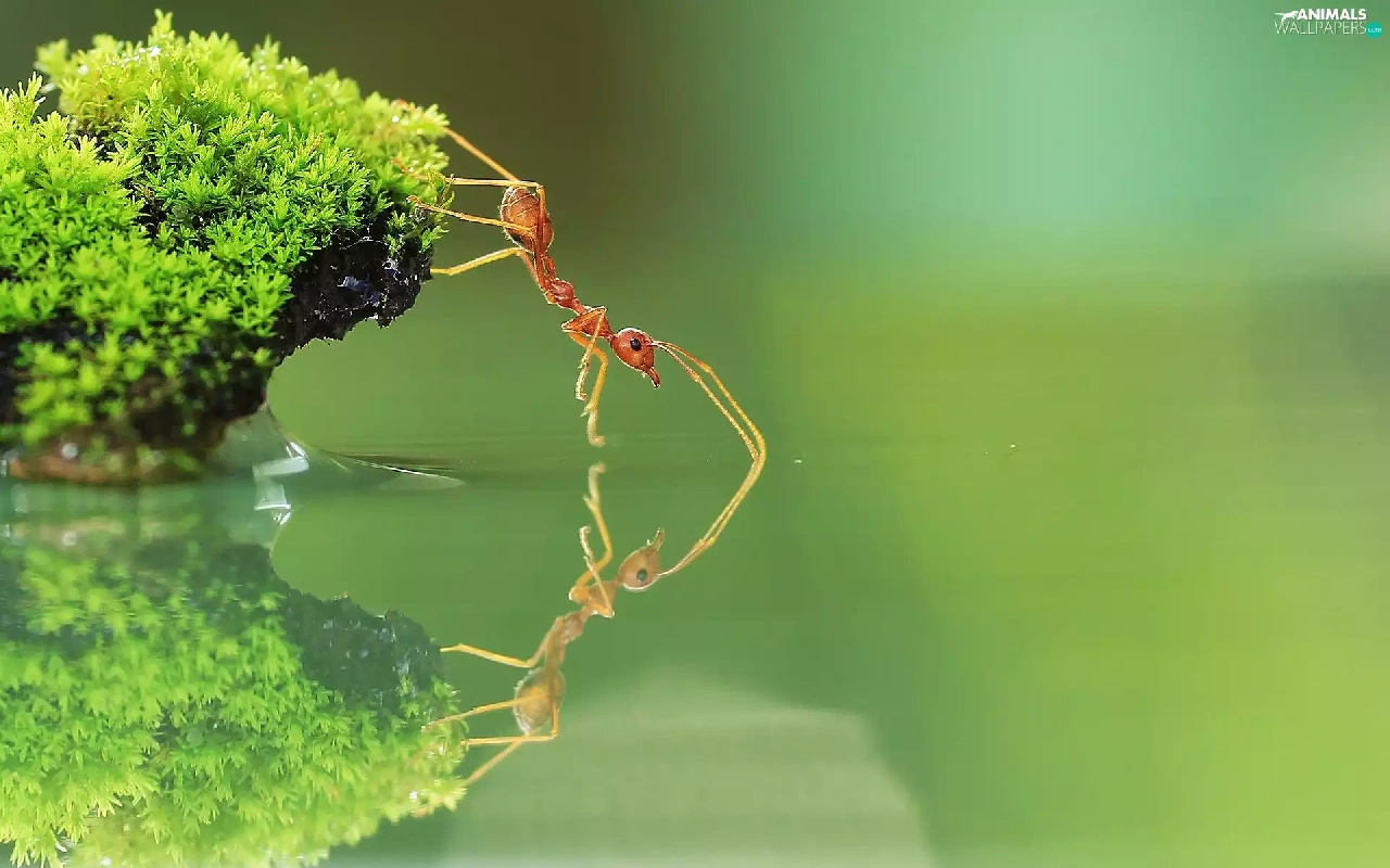 ant, water, reflection, Moss