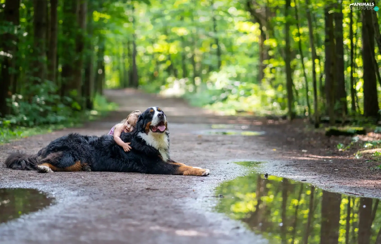 Way, forest, Bernese Mountain Dog, Kid, dog