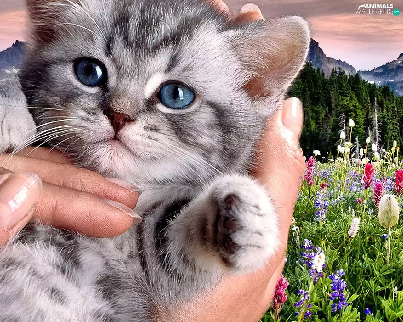 Mountains, cat, hand