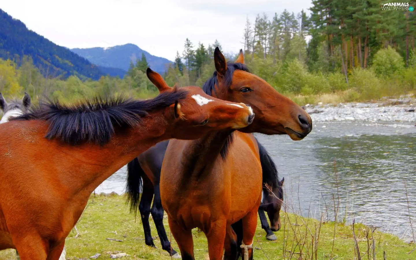 viewes, Mountains, water, trees, bloodstock