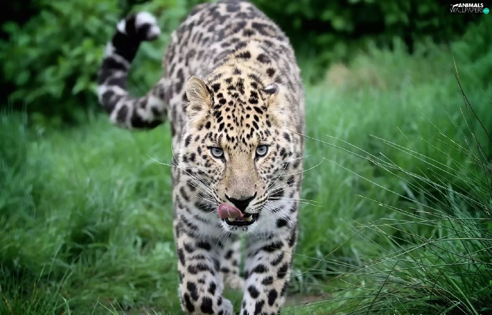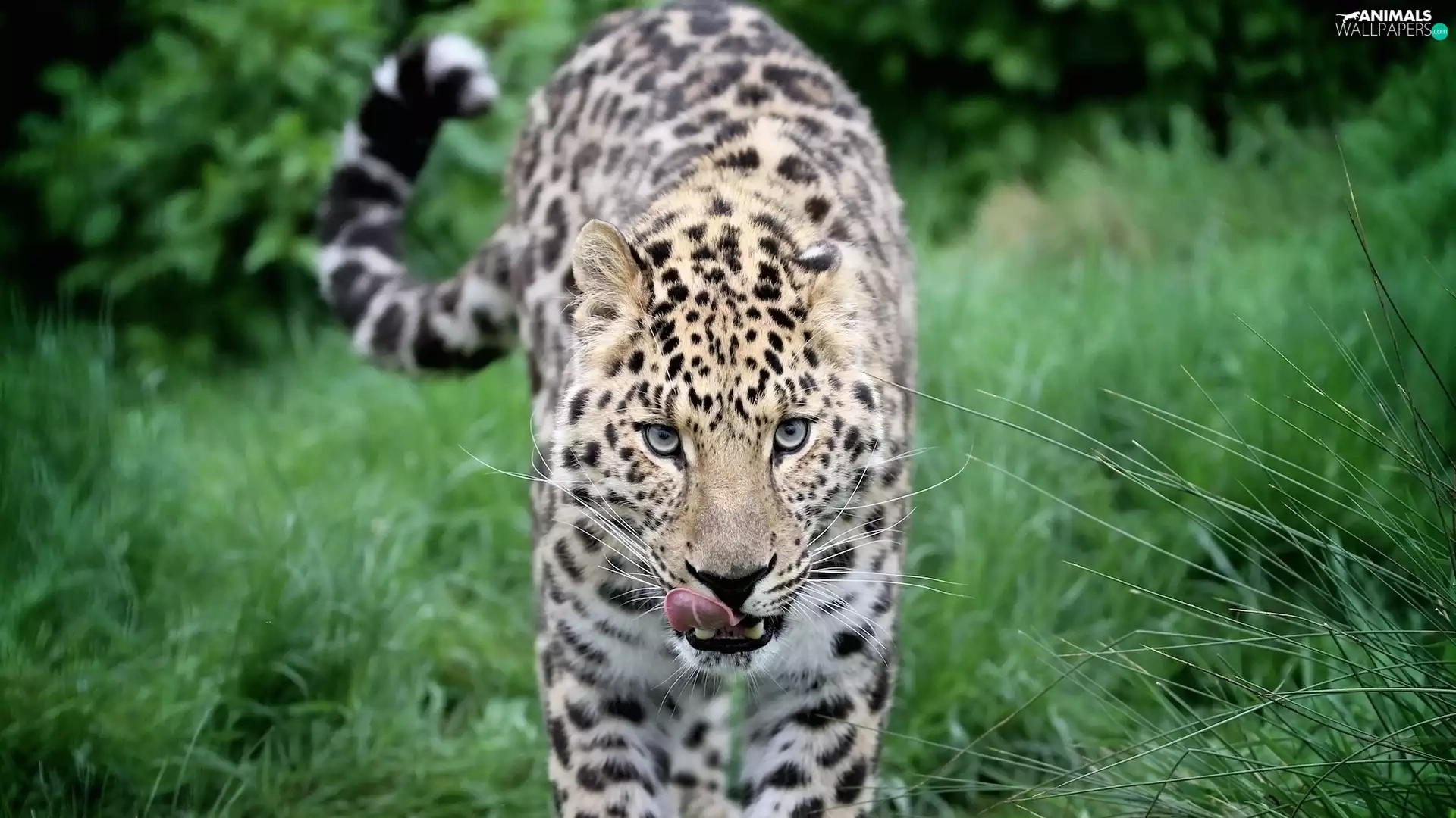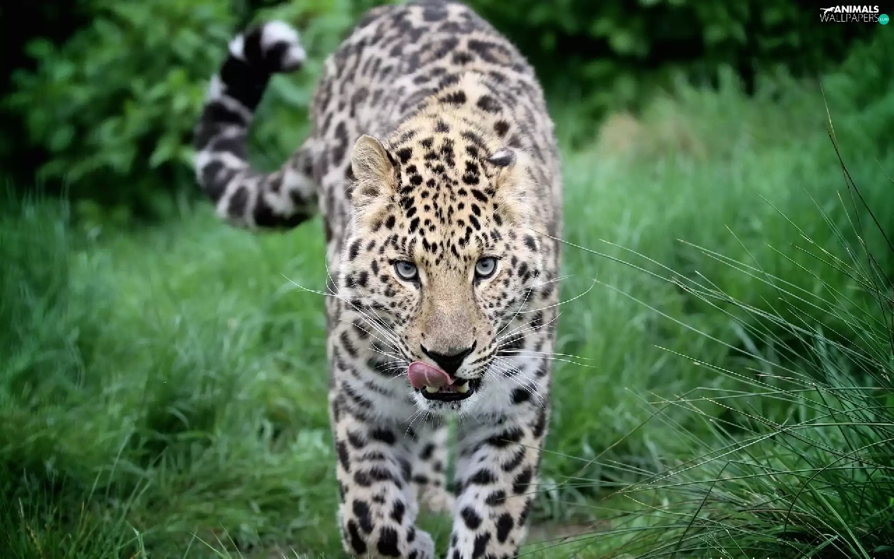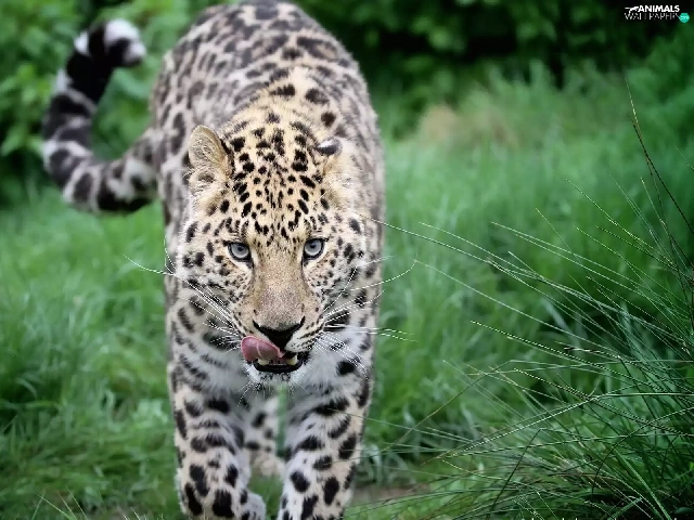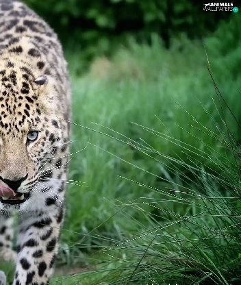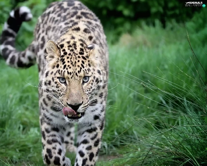 Leopards, Tounge, grass, mouth