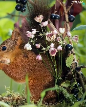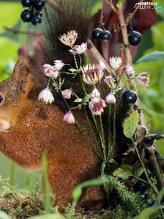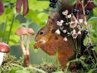 squirrel, Moss, Flowers, mushrooms