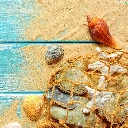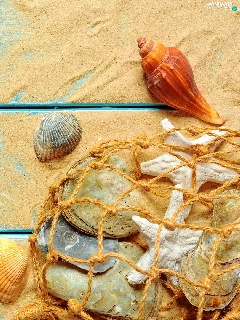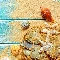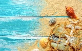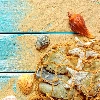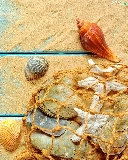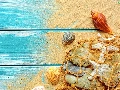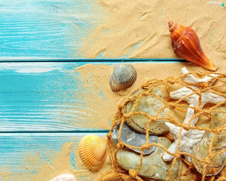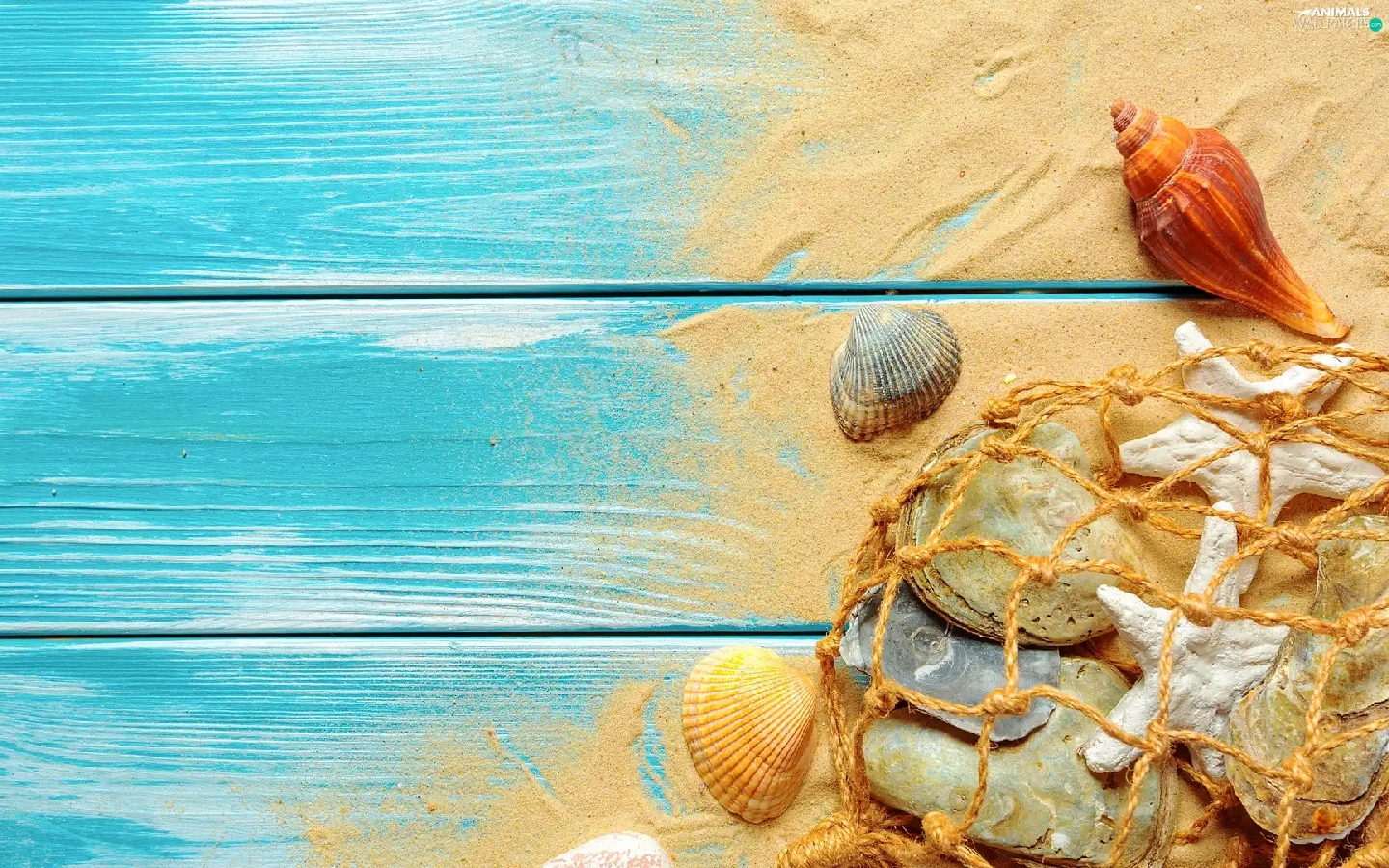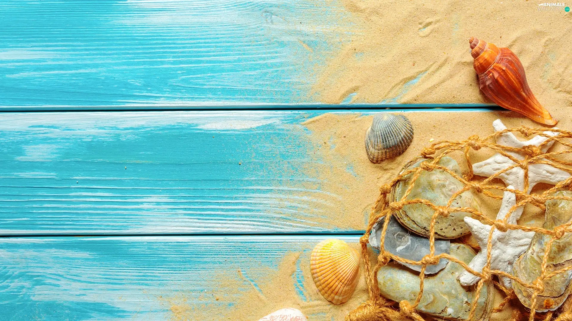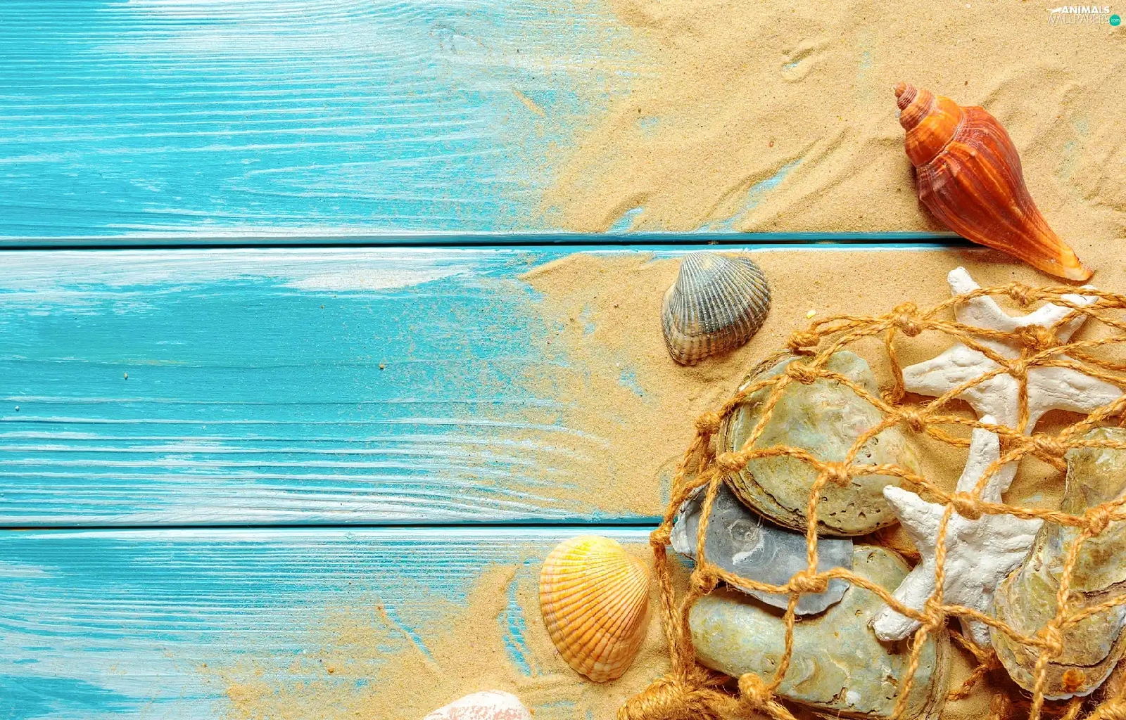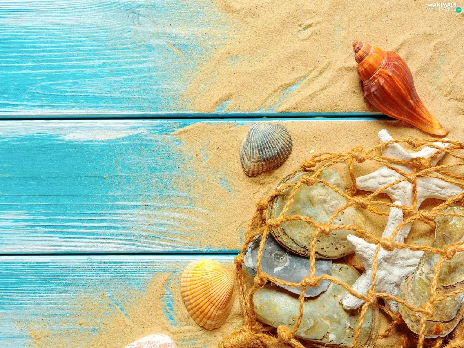 Sand, Shells, boarding, net, starfish, Blue, composition