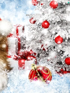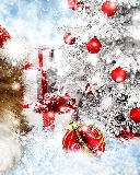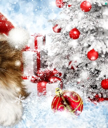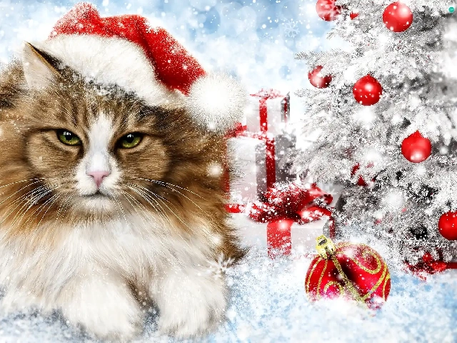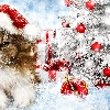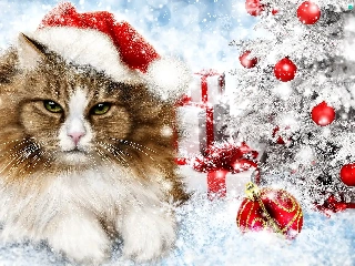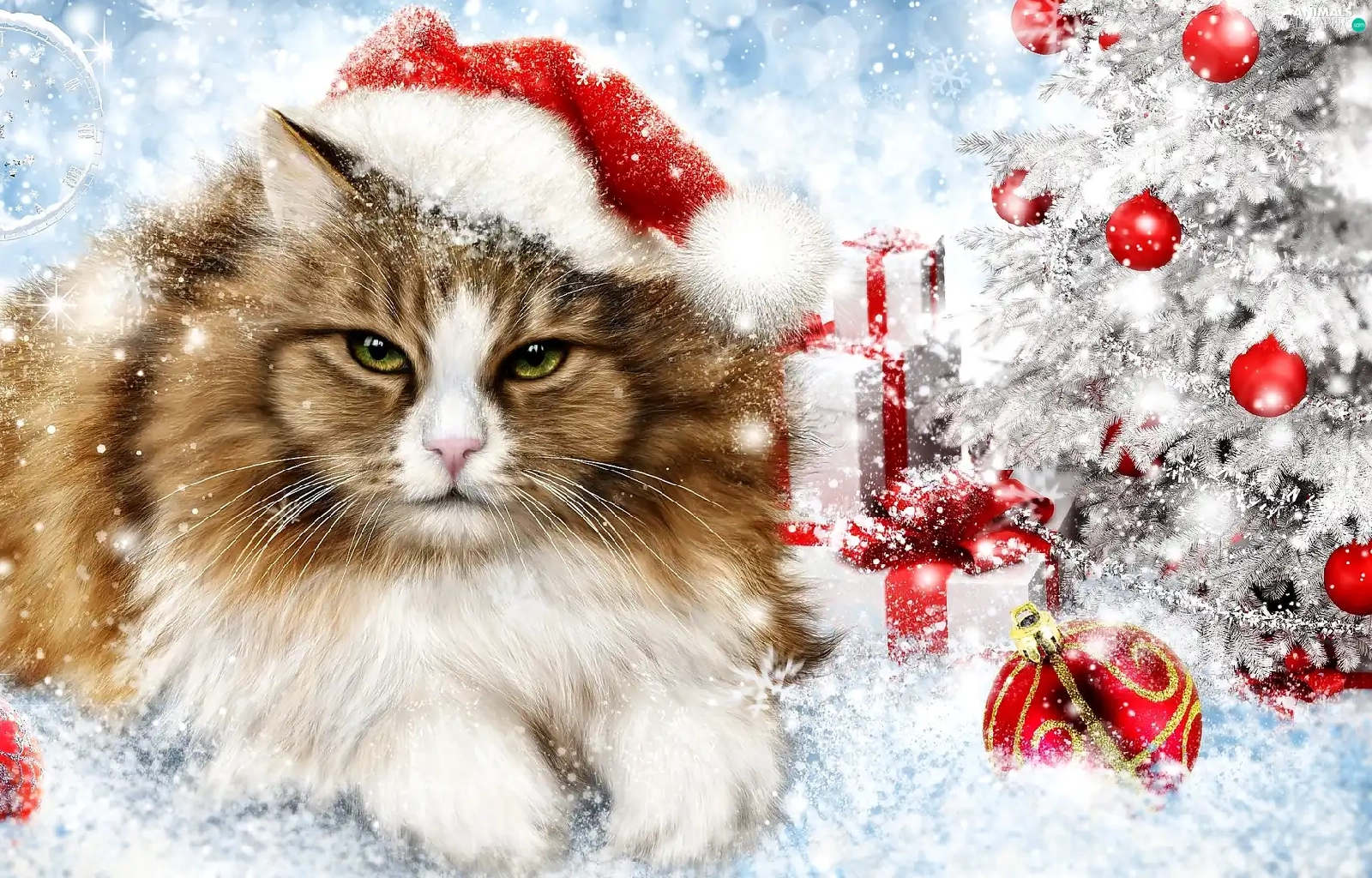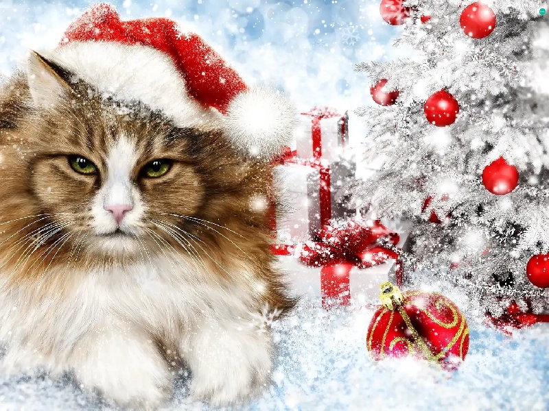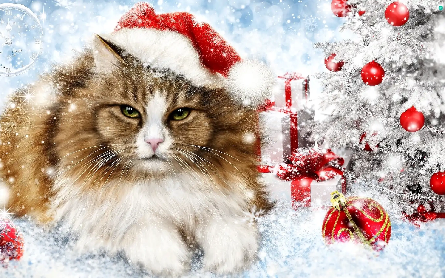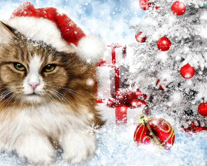 Nicholas, cat, baubles, gifts, christmas tree, Hat