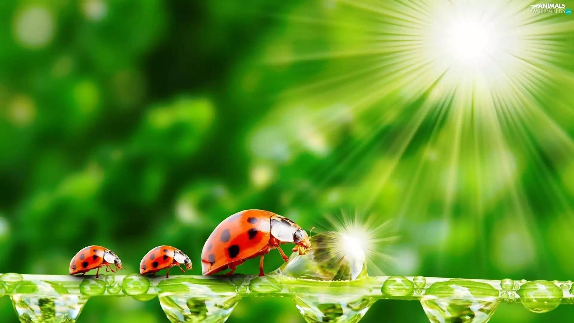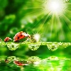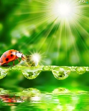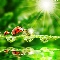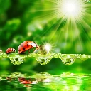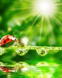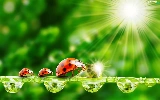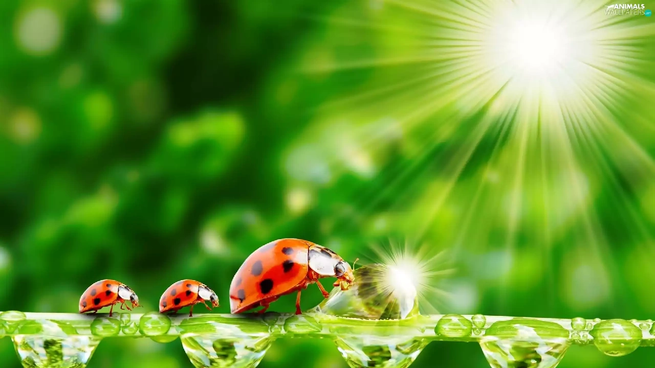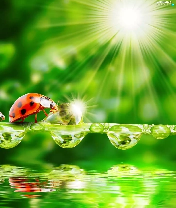 ladybugs, water, rays of the Sun, drops