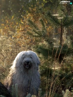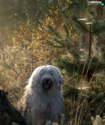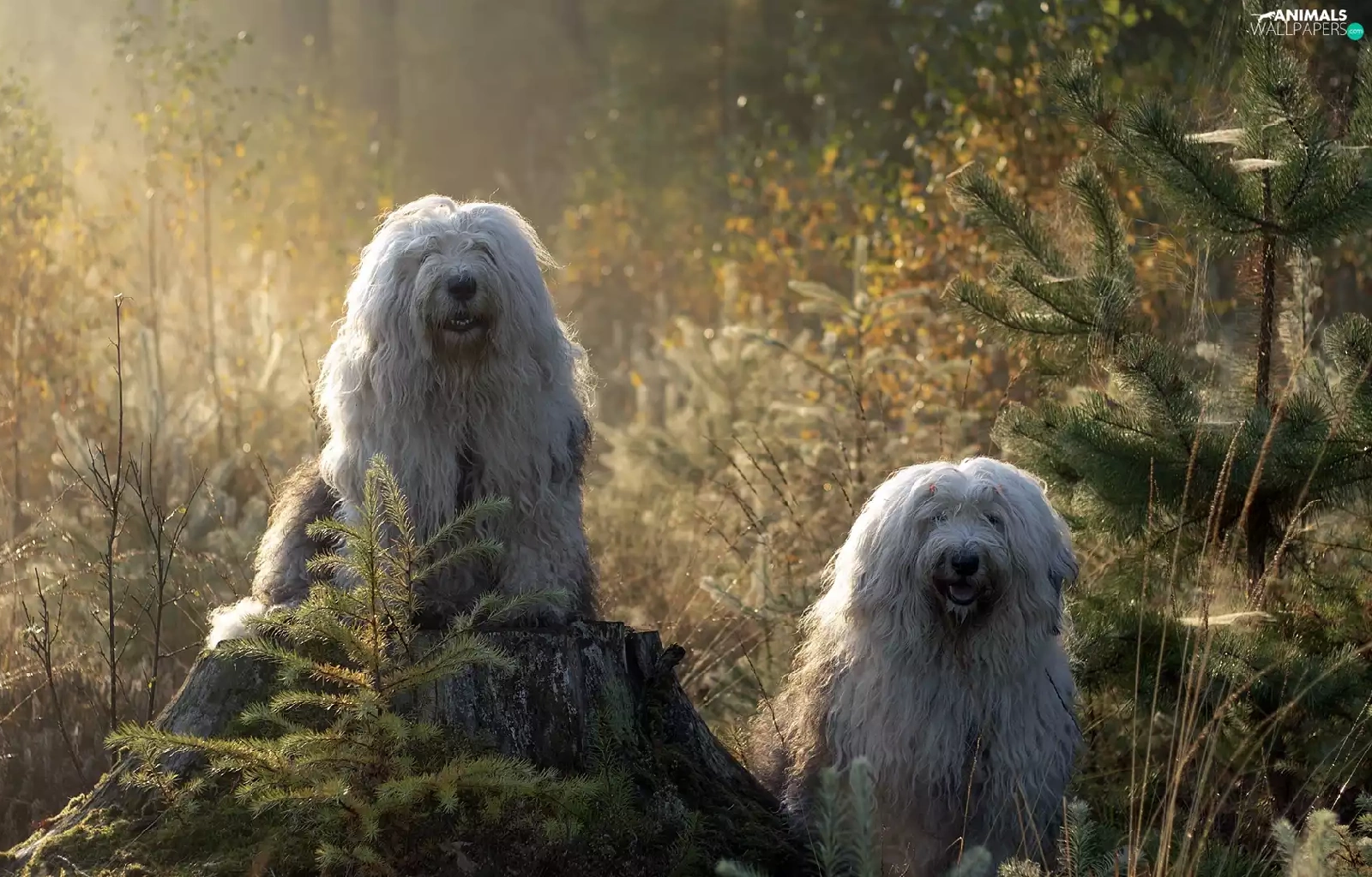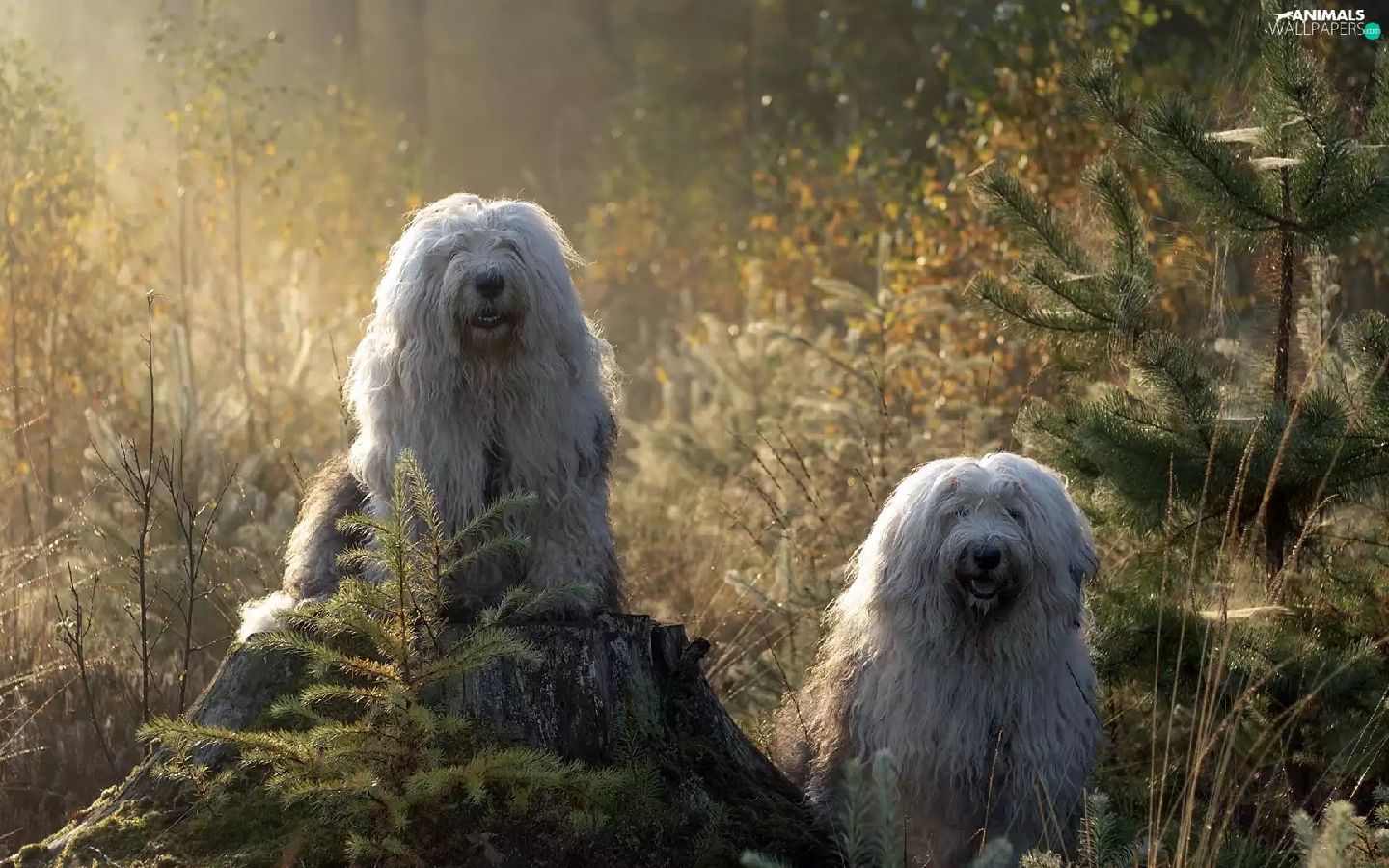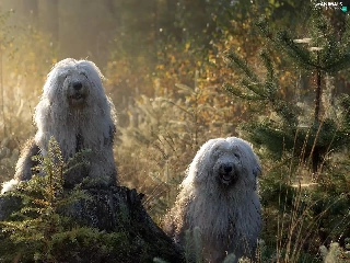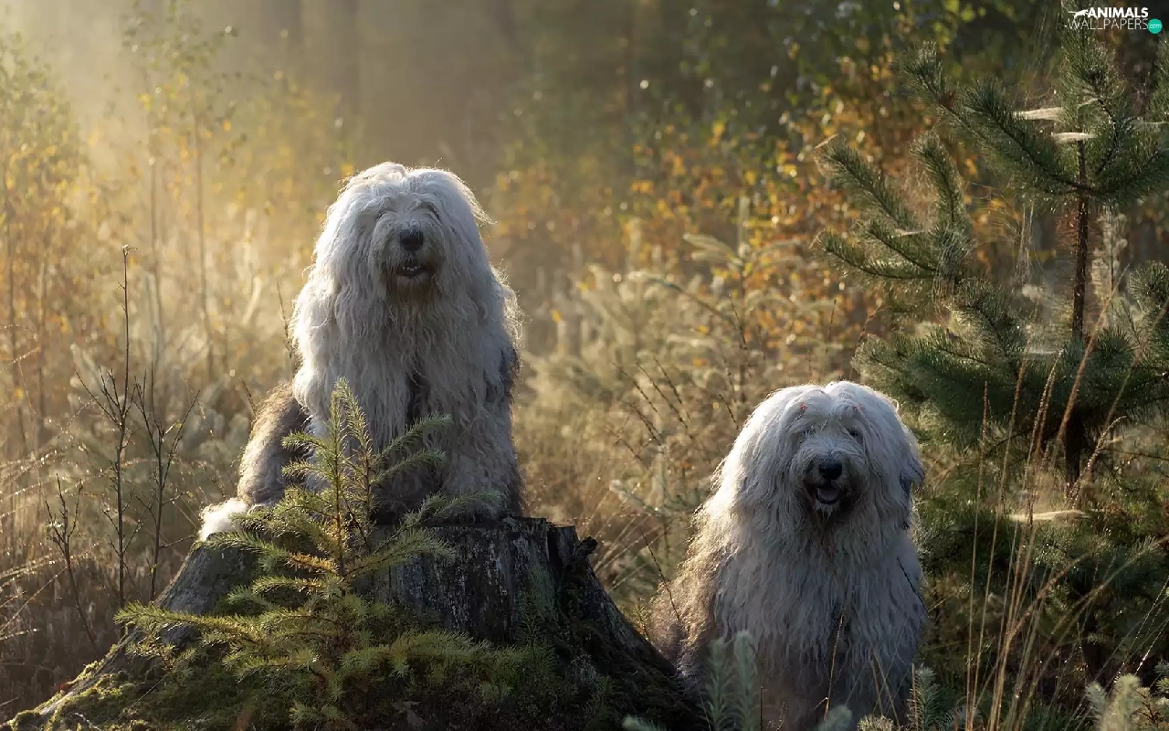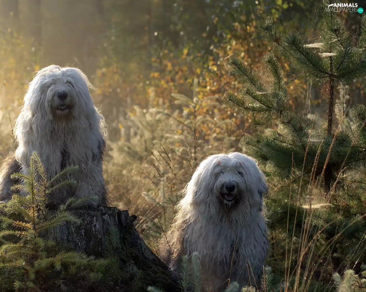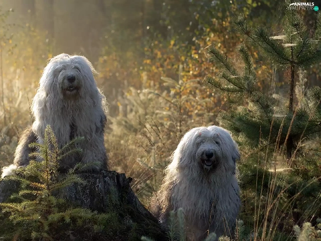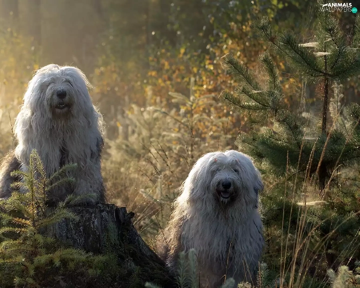 Old English Sheepdog Bobtail, Two cars, Sapling, forest, trunk, Dogs