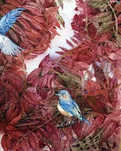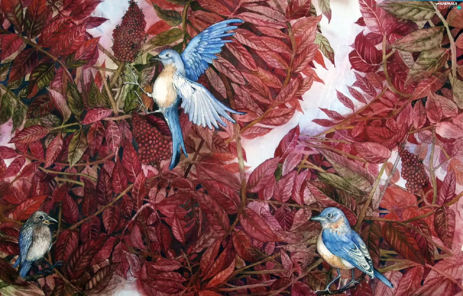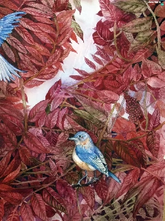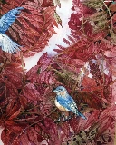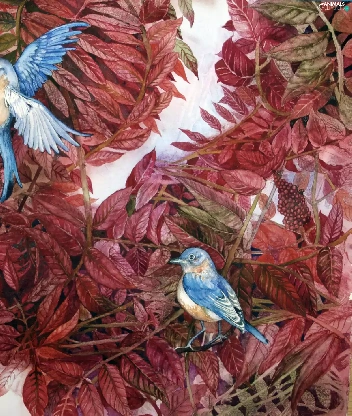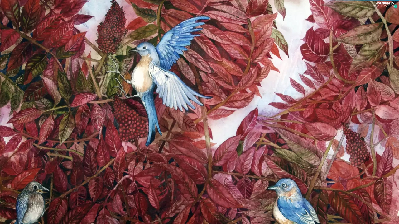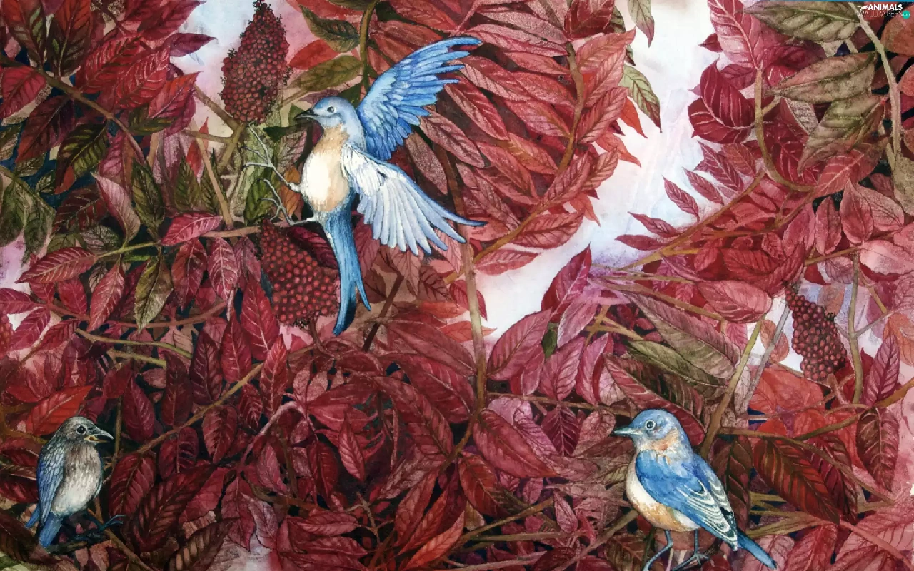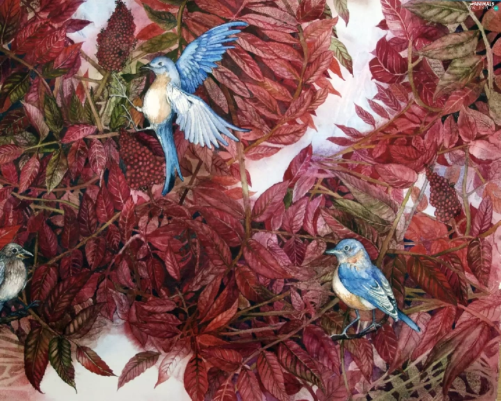 leaves, Blue, Birds on the log