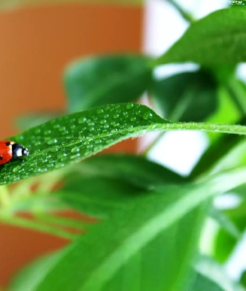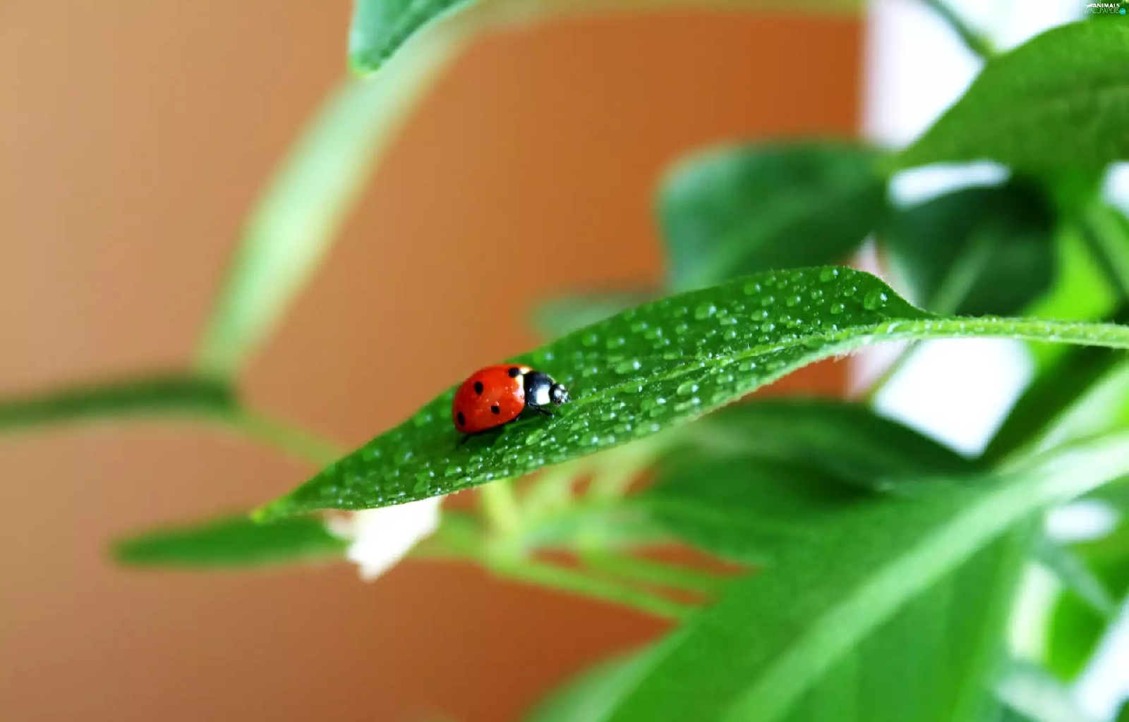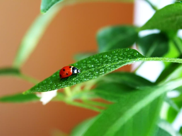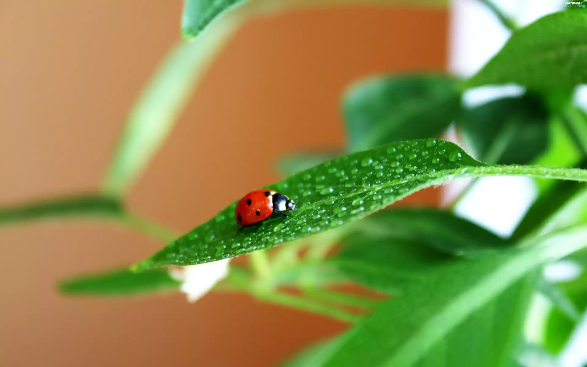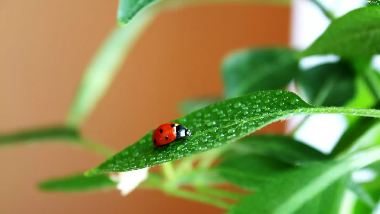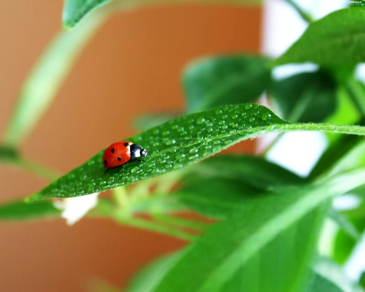drops, Rosy, green ones, leaves, ladybird