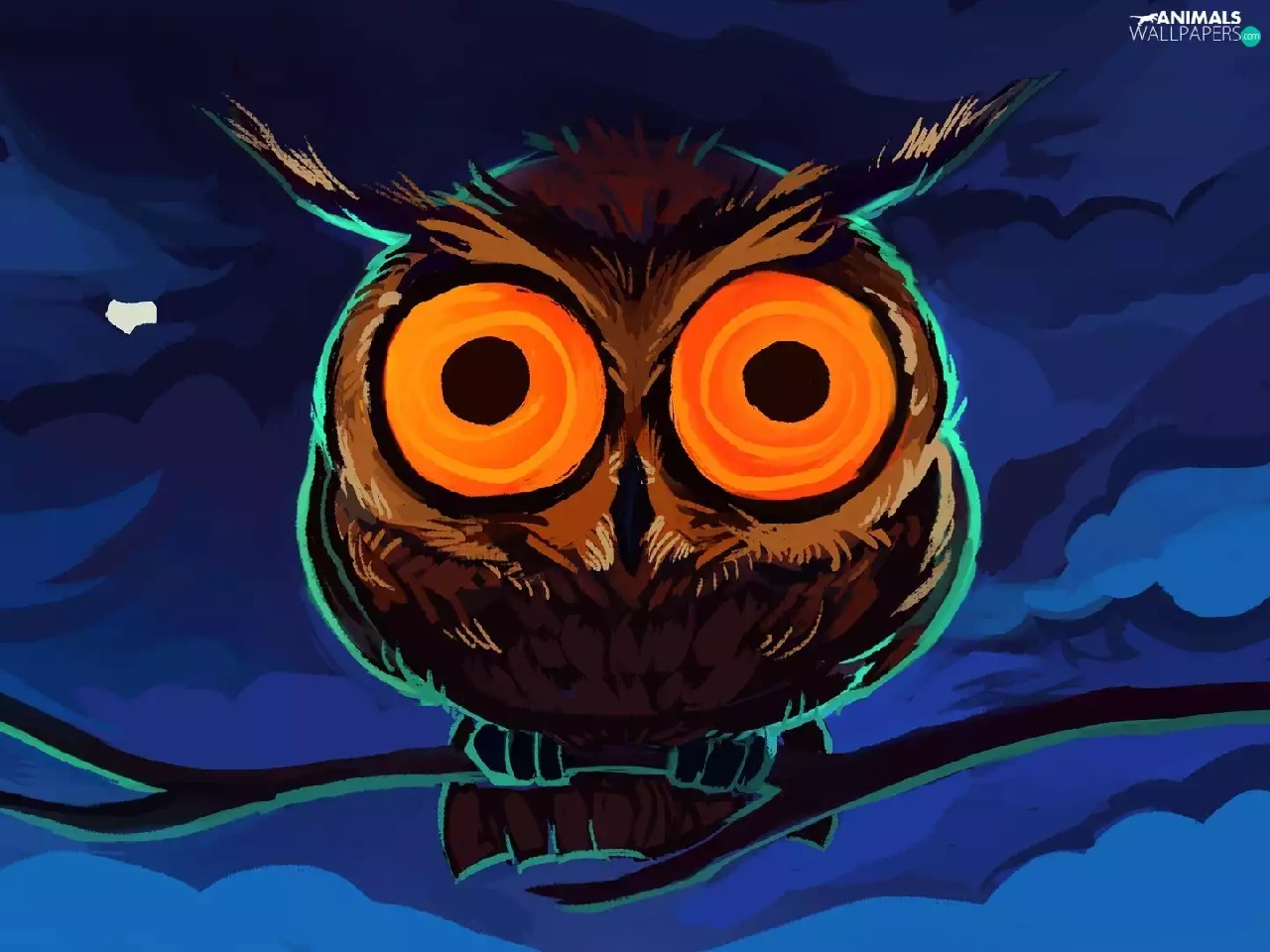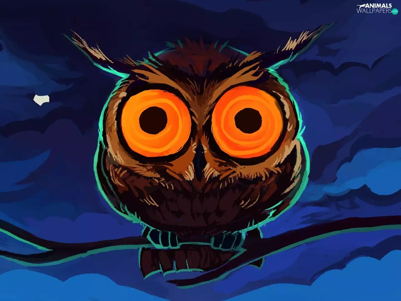 Orange, Eyes, graphics, branch pics, background, owl, Brown, Blue