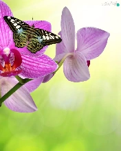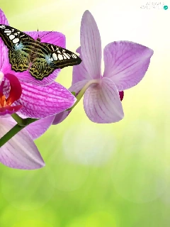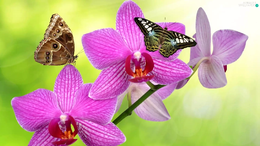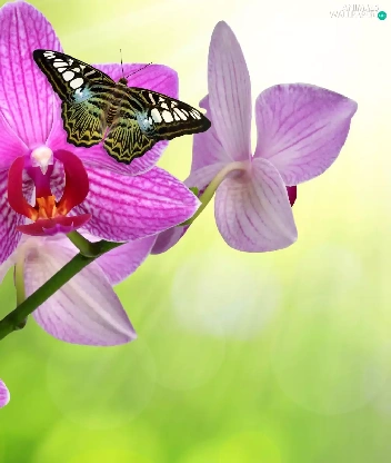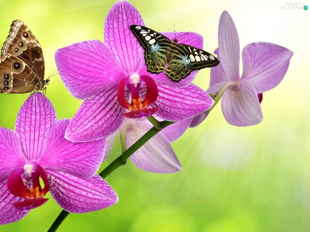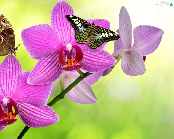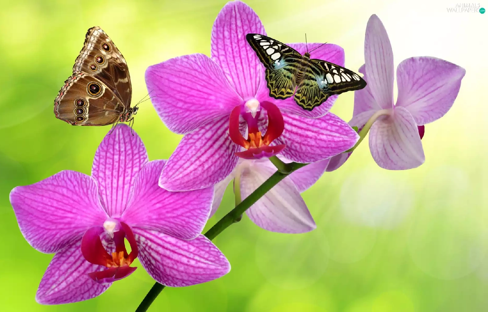 butterflies, twig, Pink, orchid, Colourfull Flowers