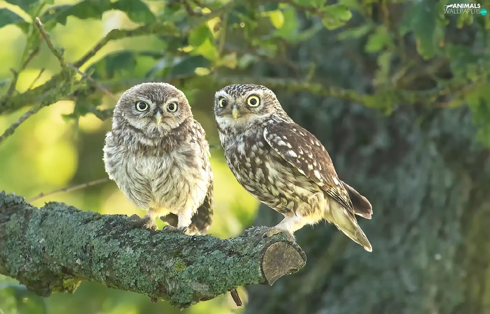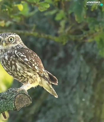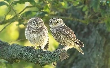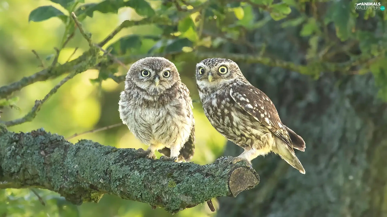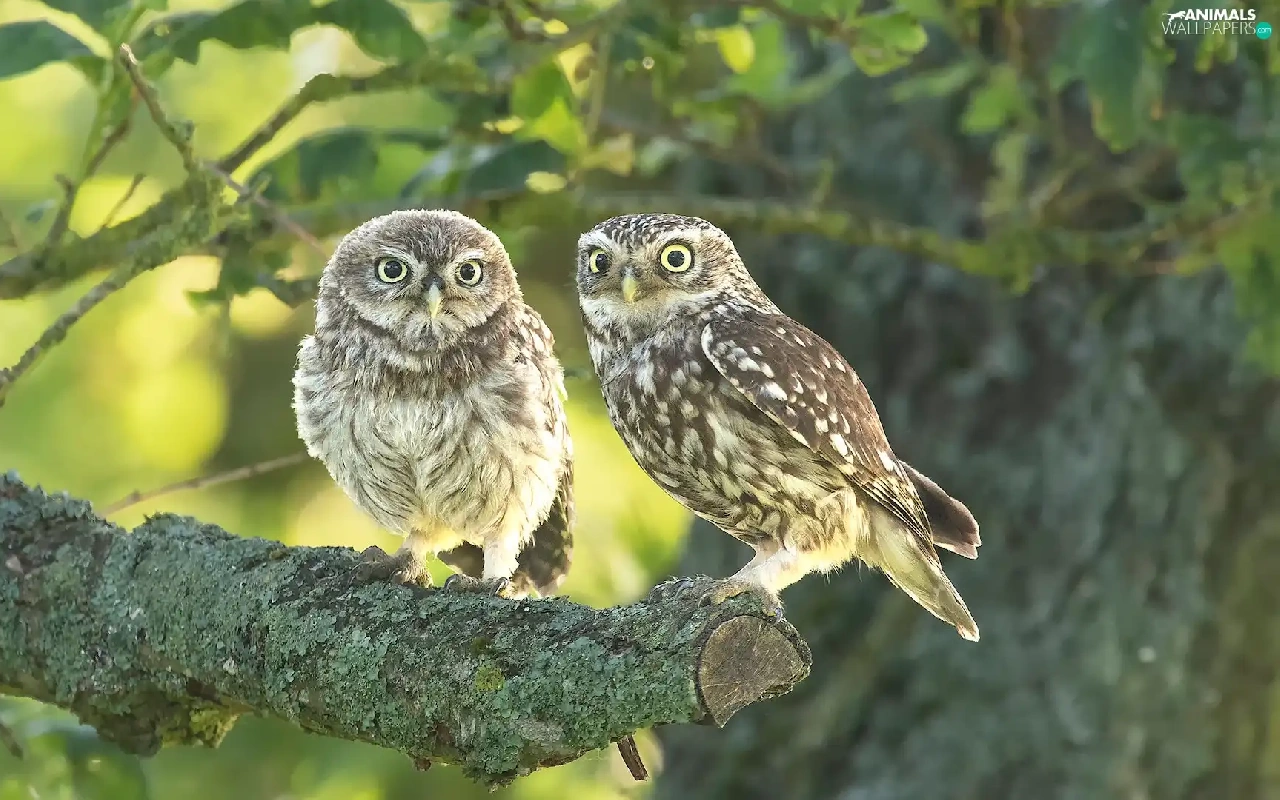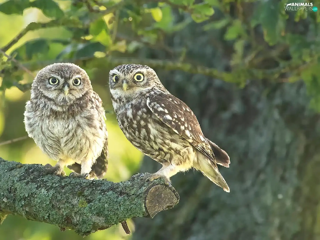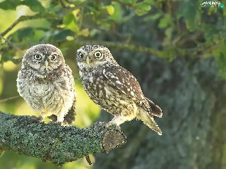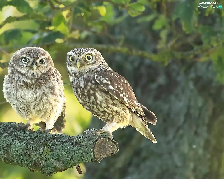 Owls, branch, Lod on the beach, Little Owl