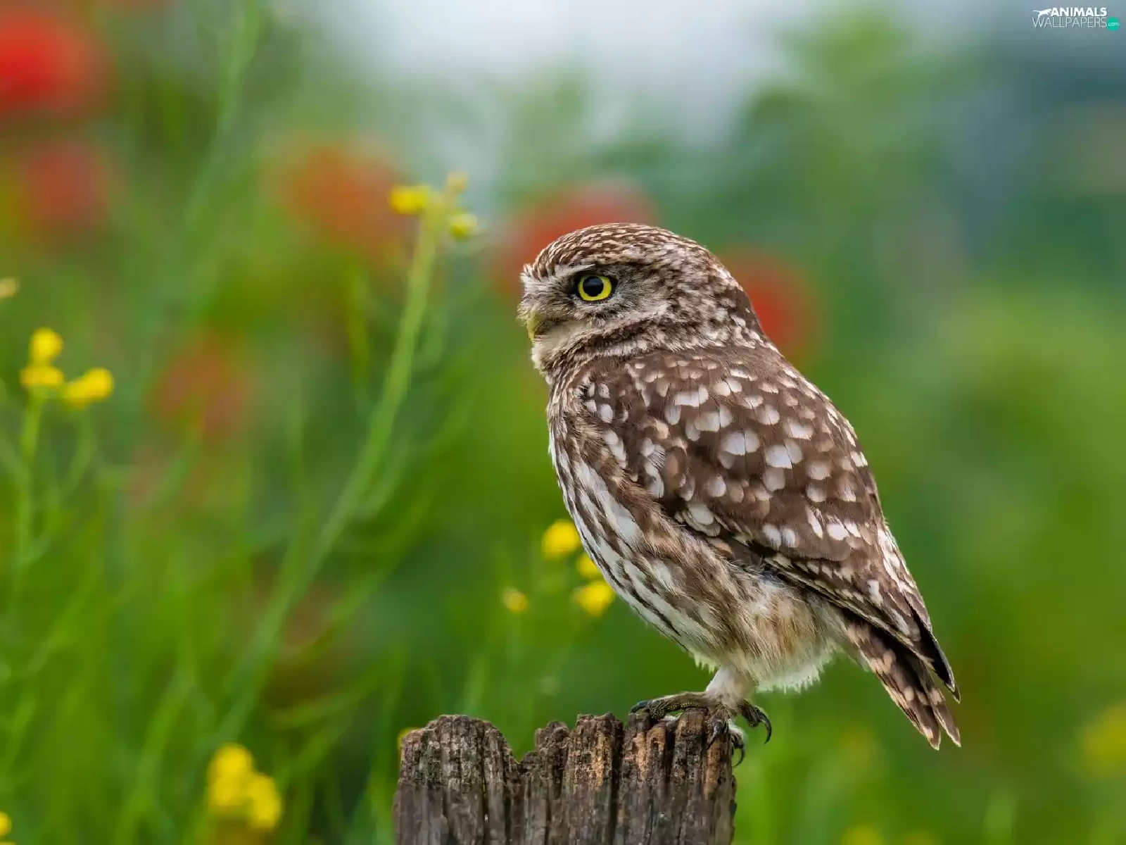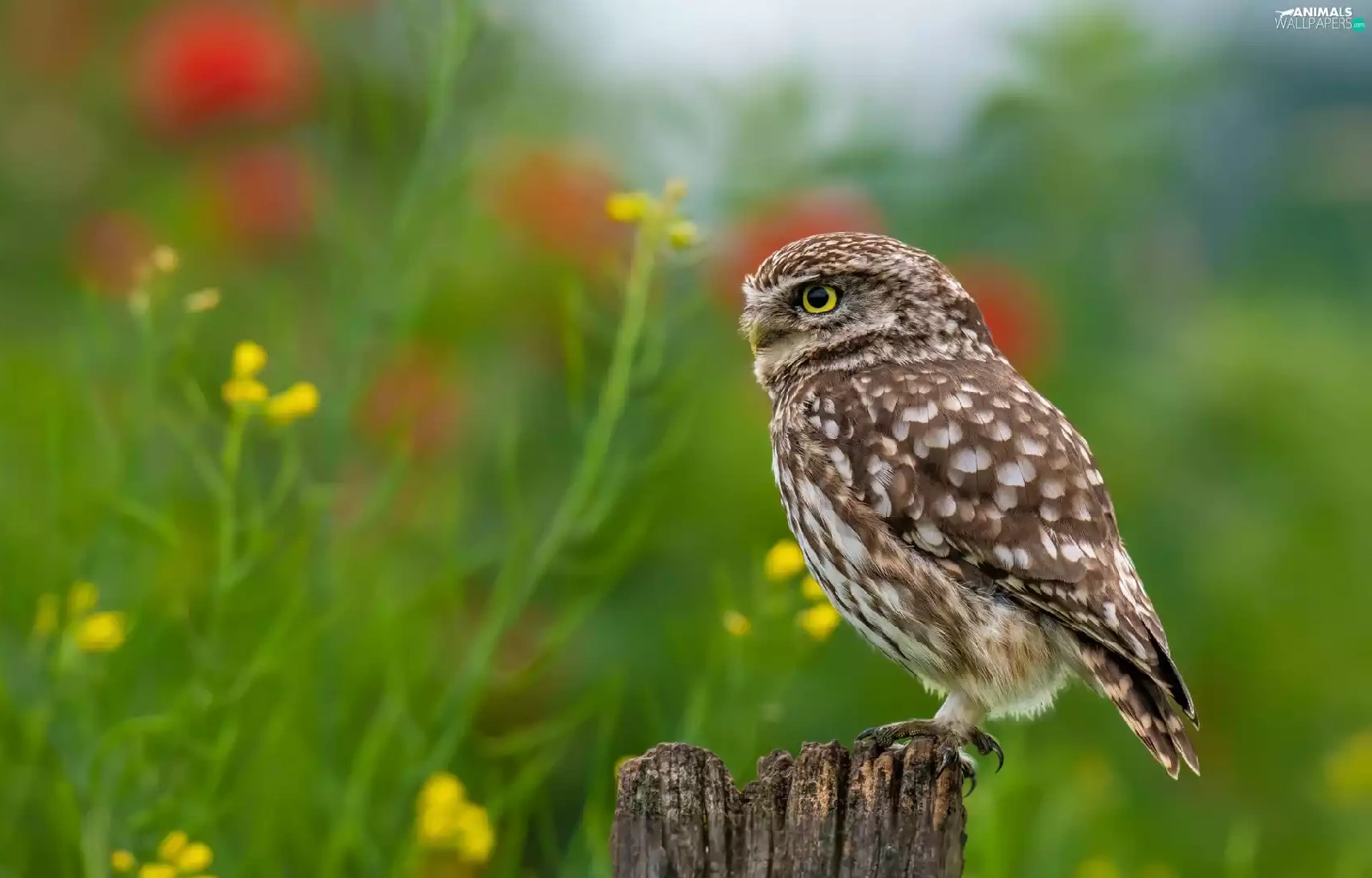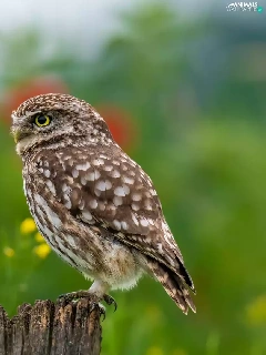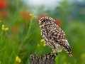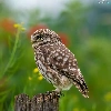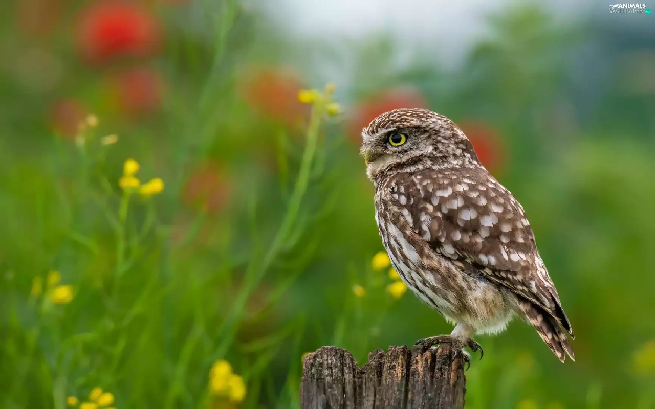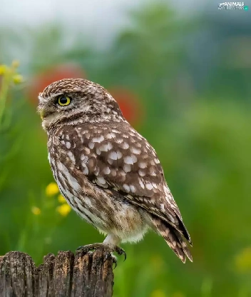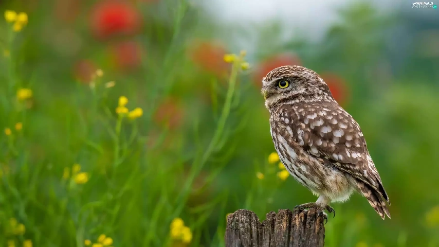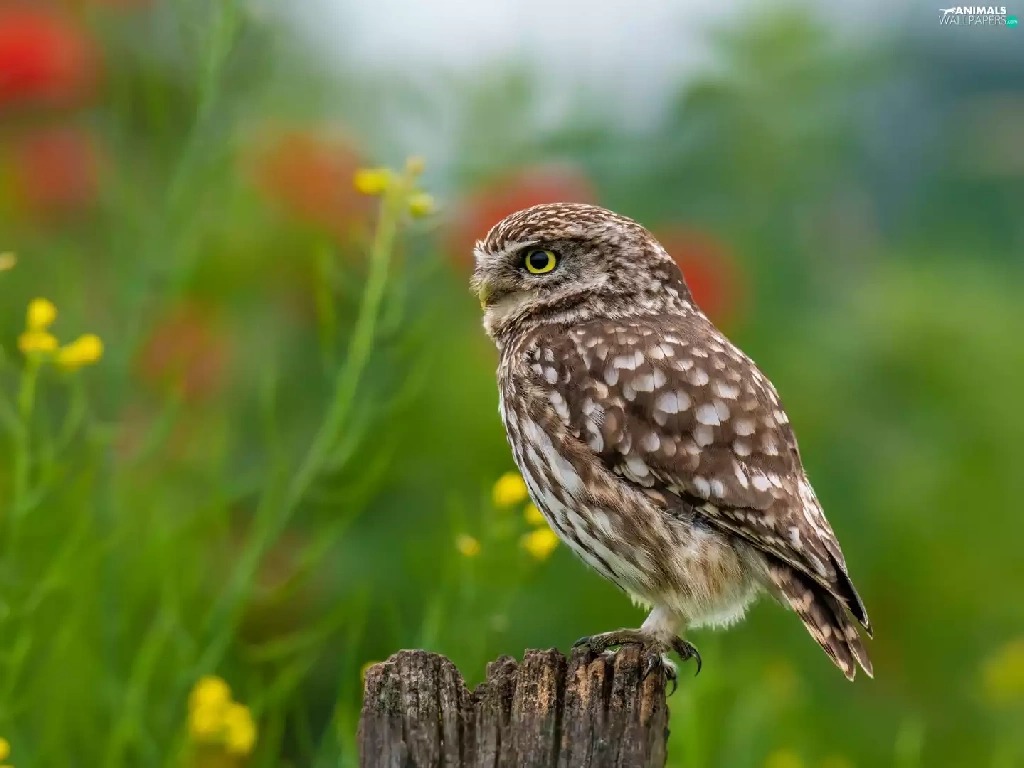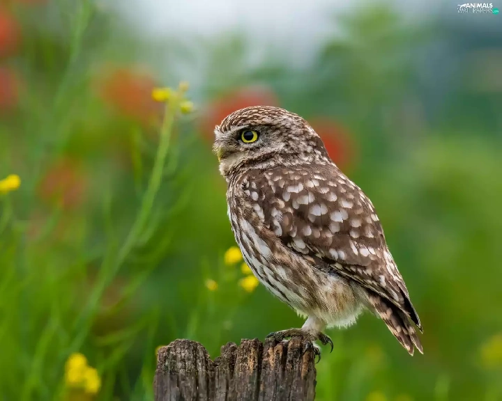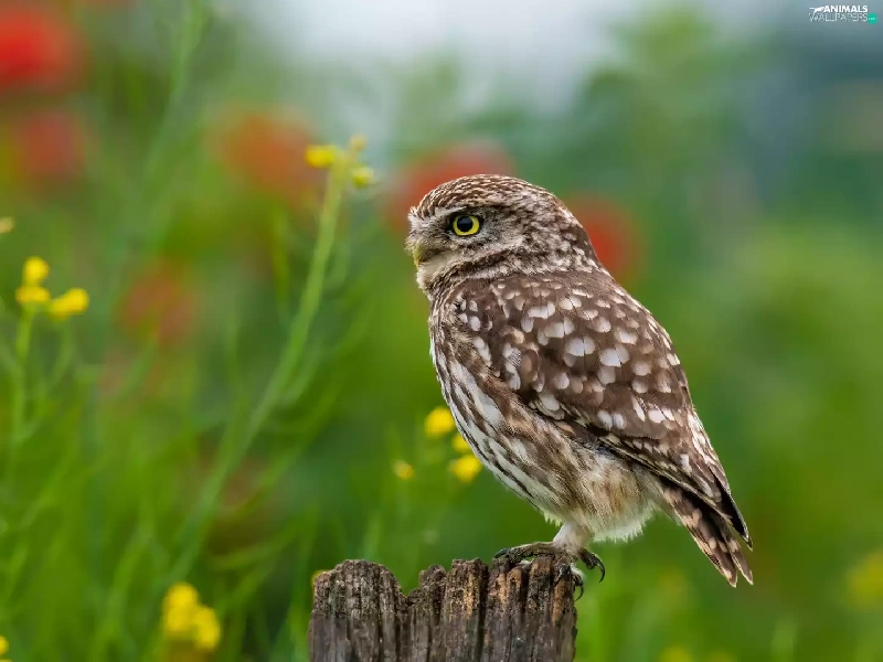 Flowers, blur, Little Owl, stump, owl