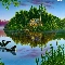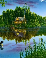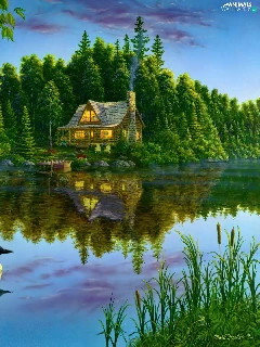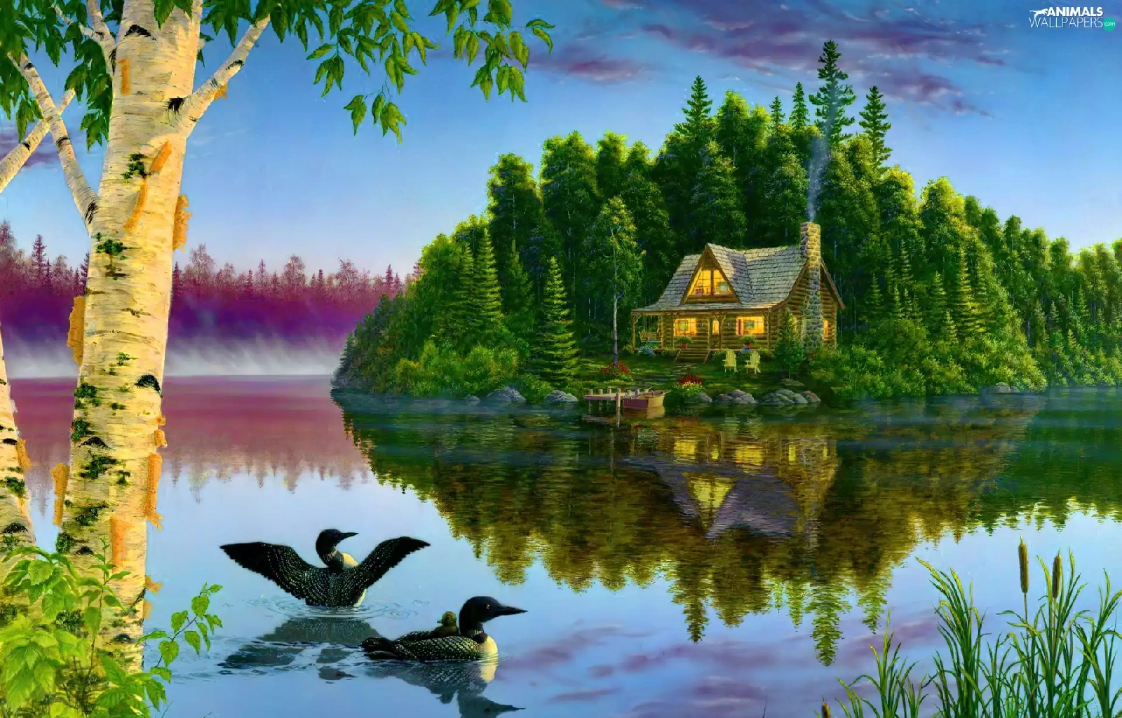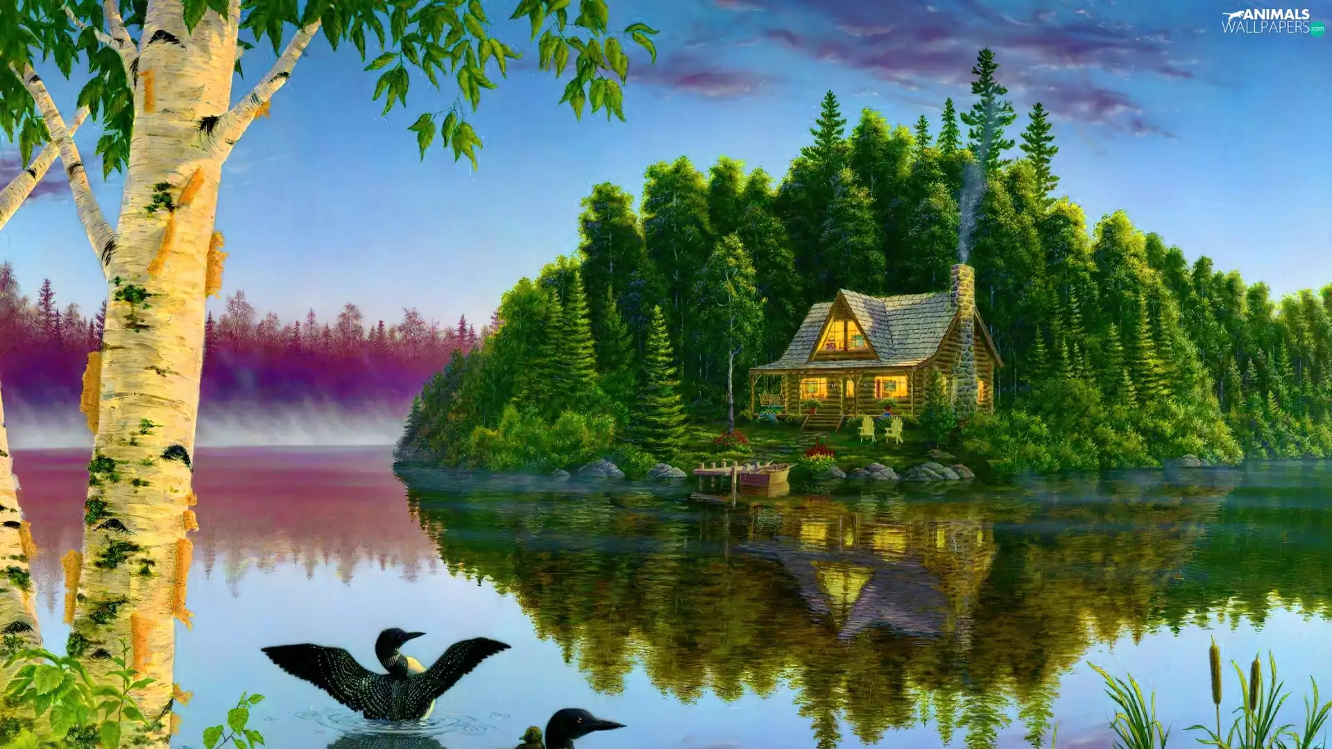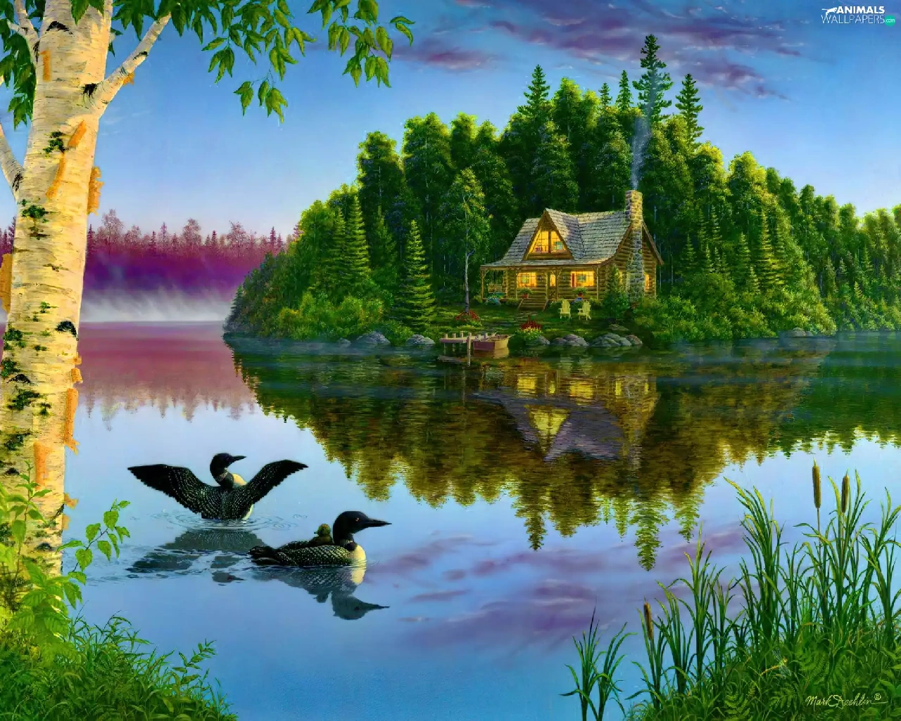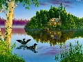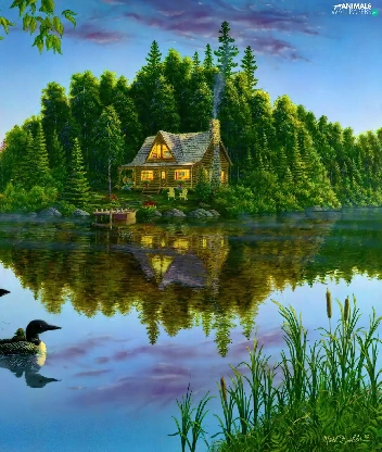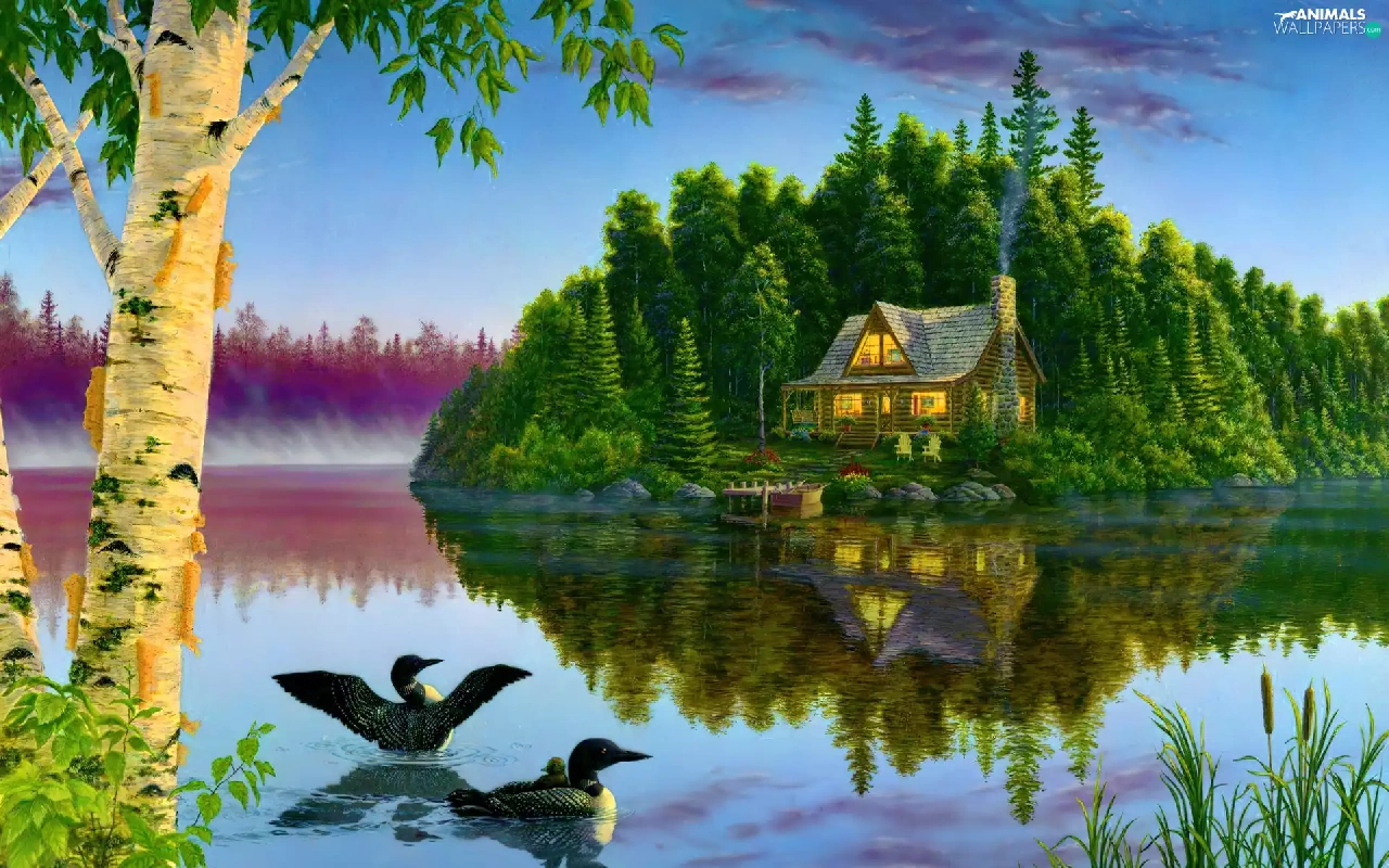 View, painting, ducks, house, lake