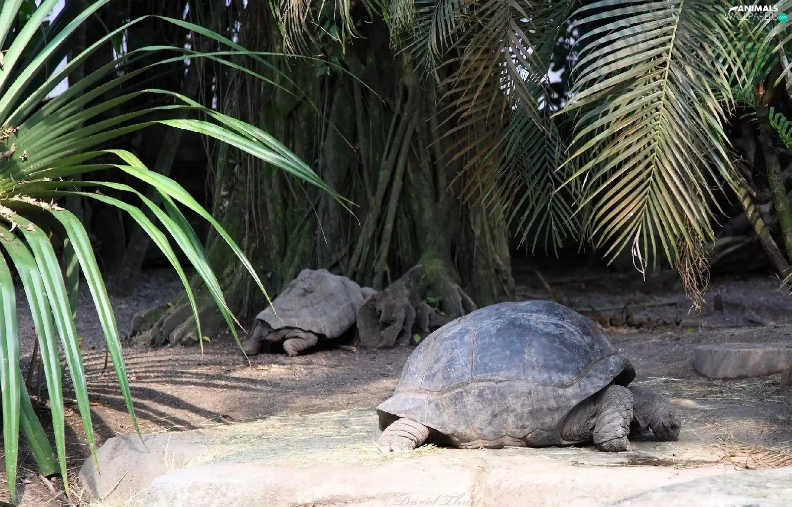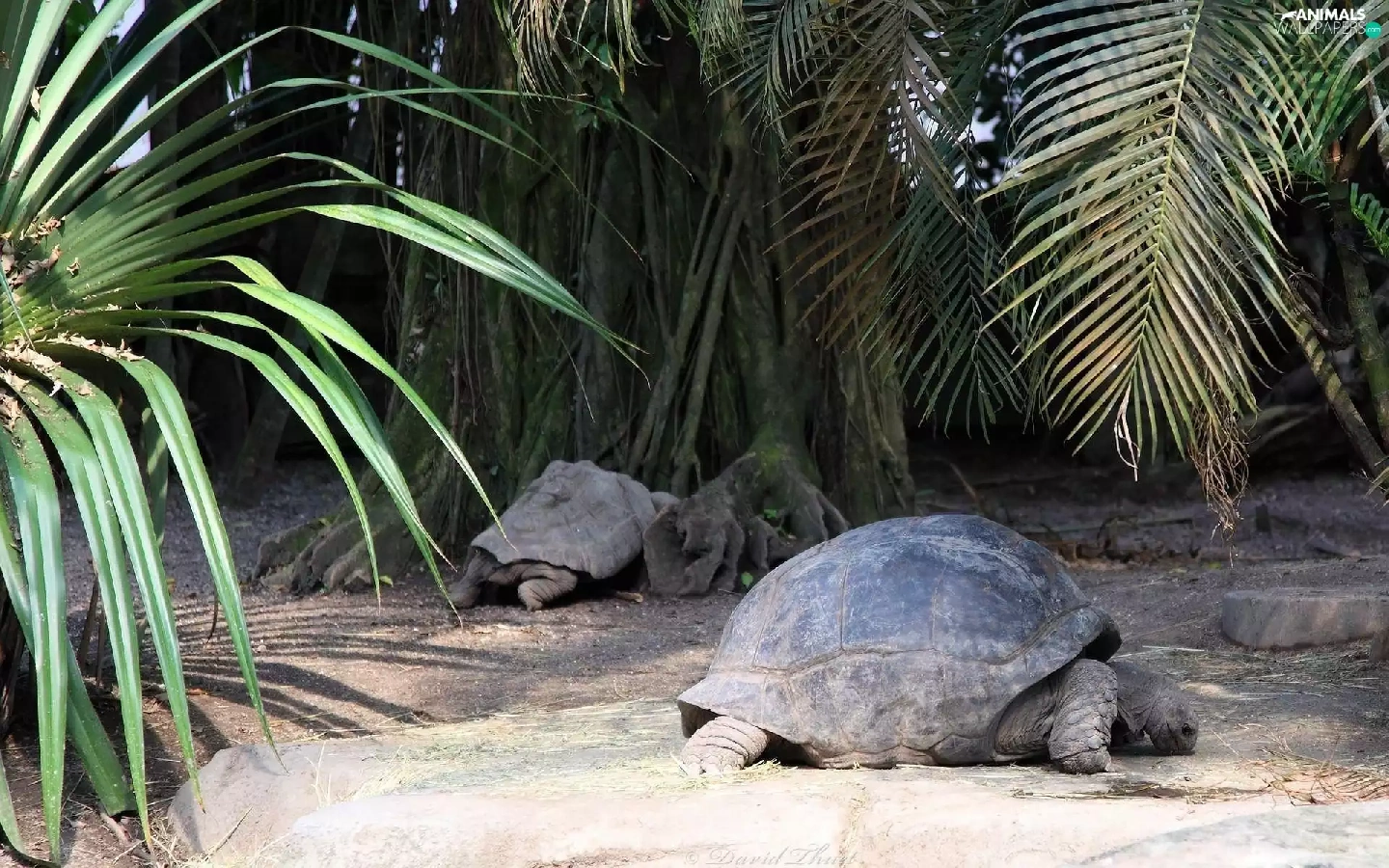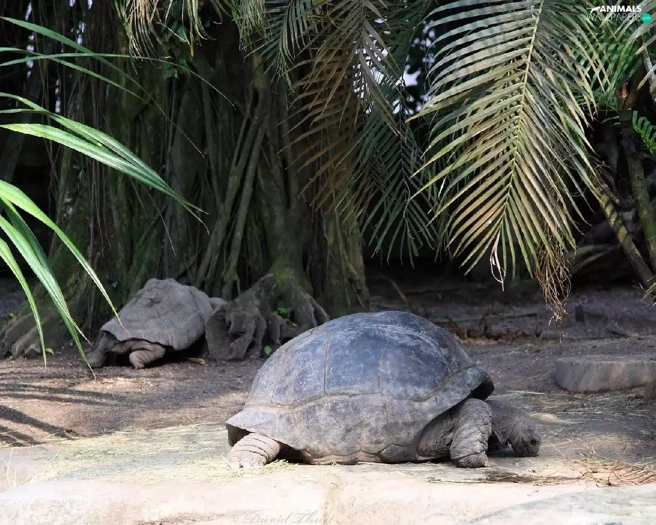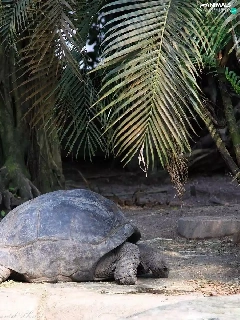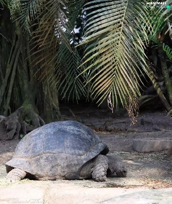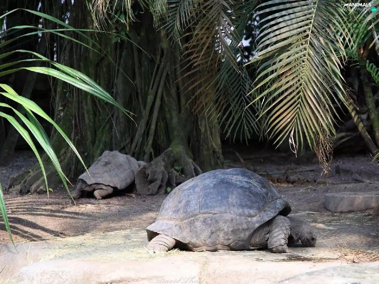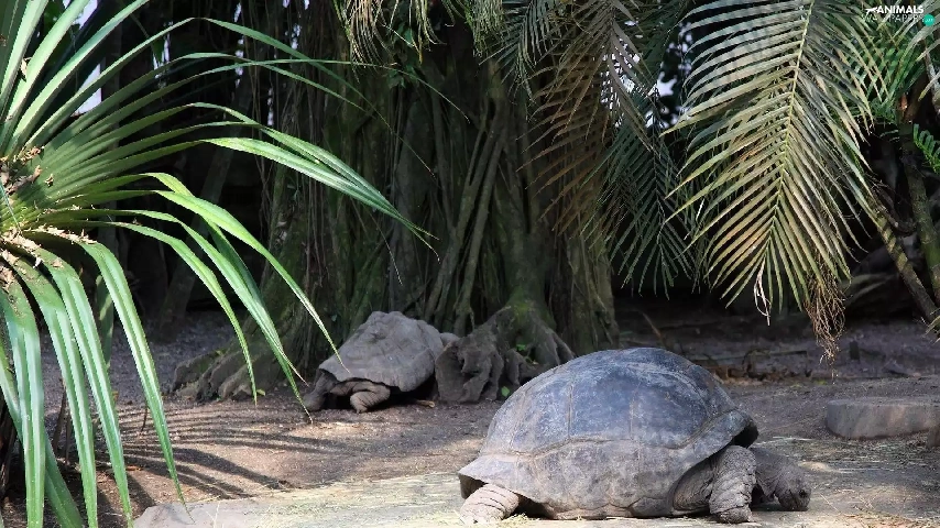Turtles, crust, trunk, Palms