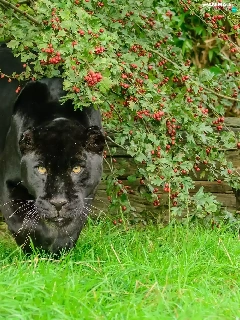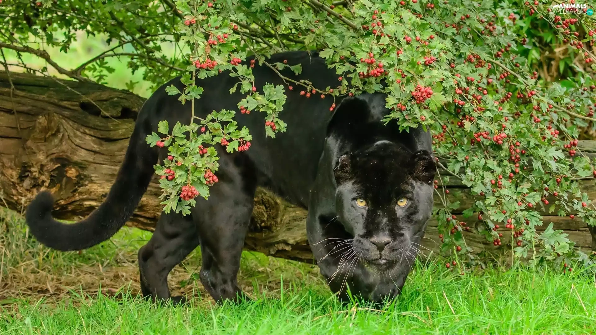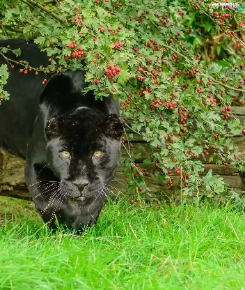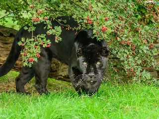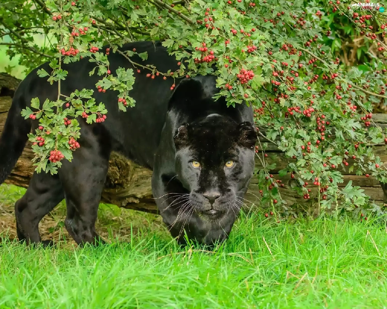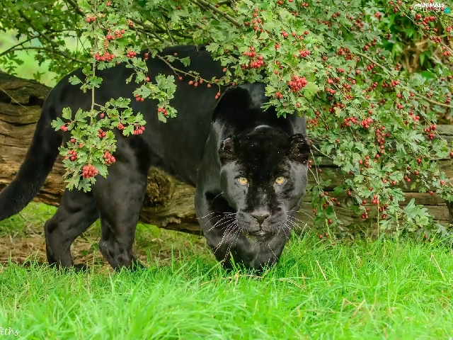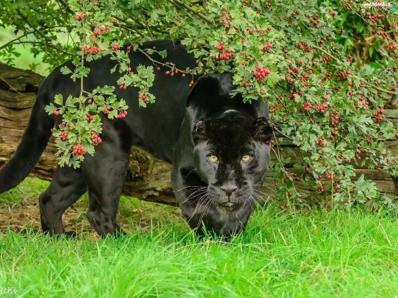 black, log, grass, Panther