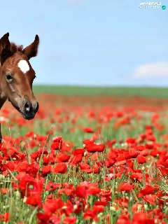 Field, papavers, Horse, Foal, small