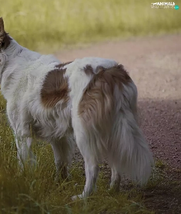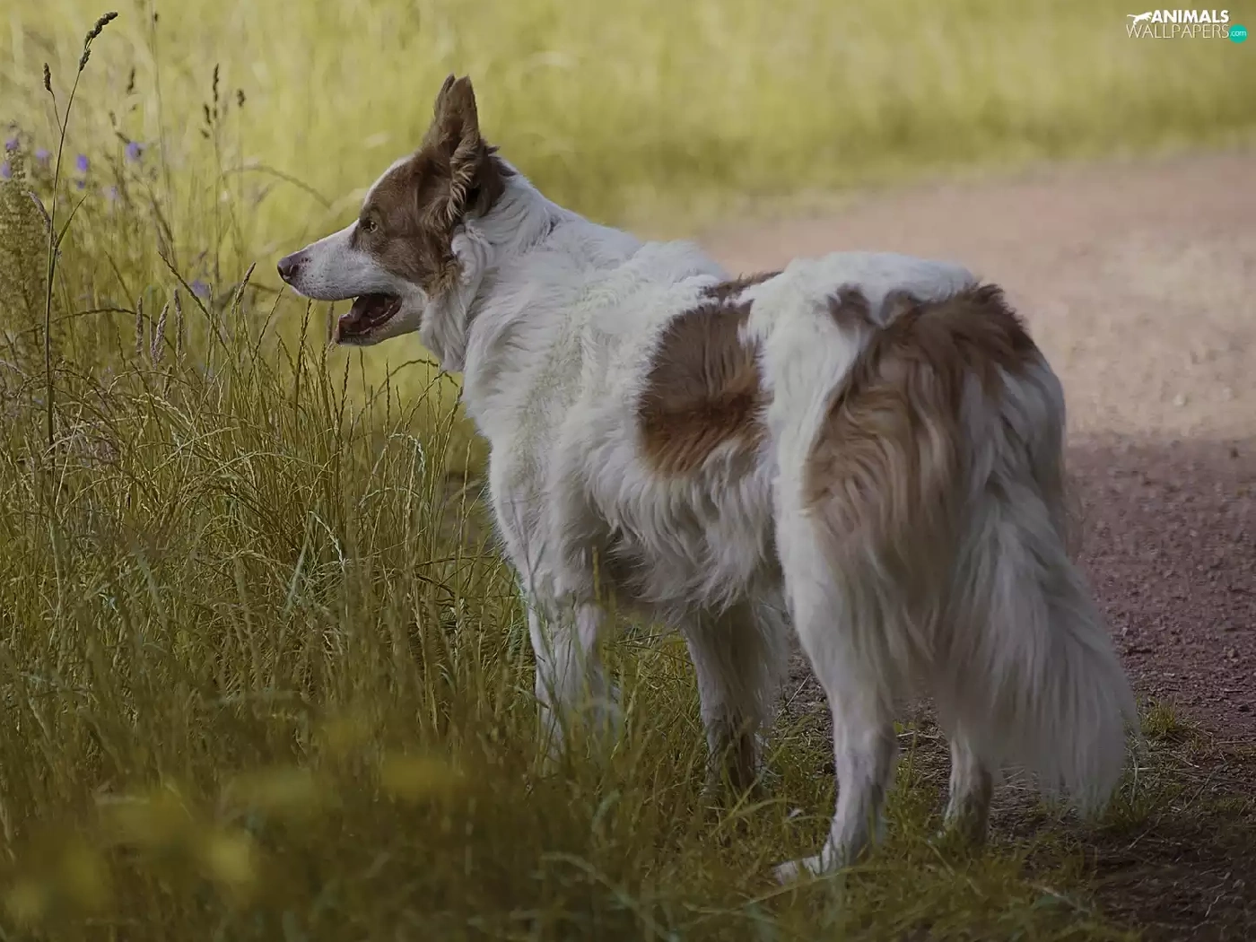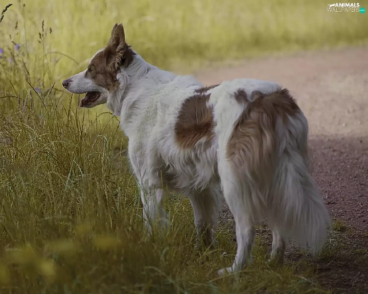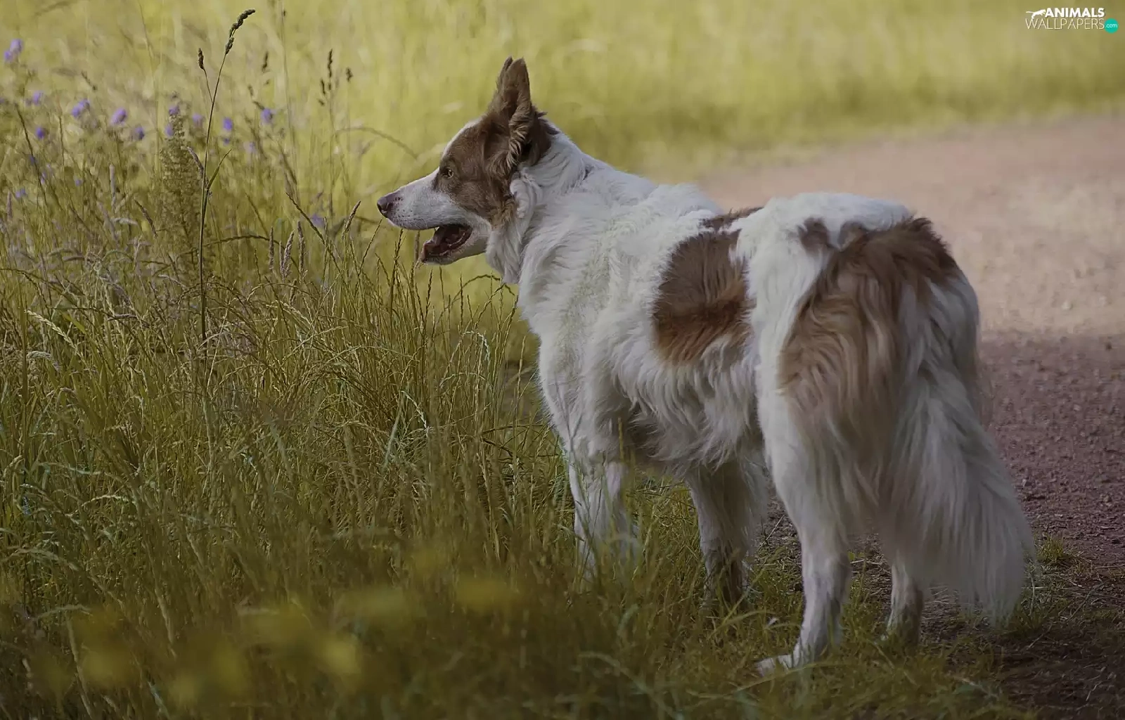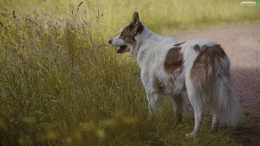 Meadow, dog, Flowers, Path, grass, Border Collie