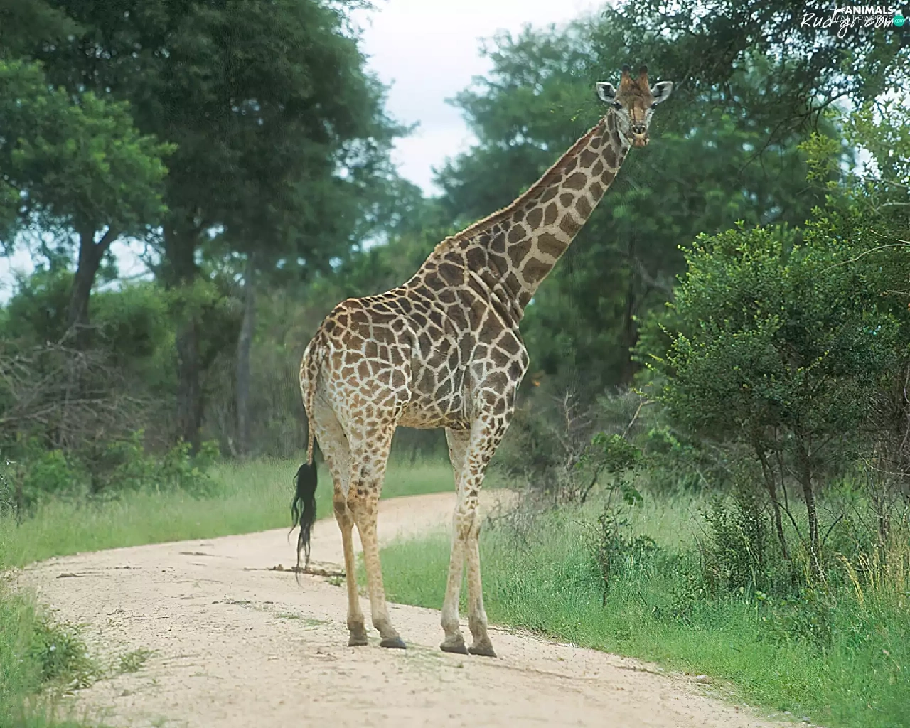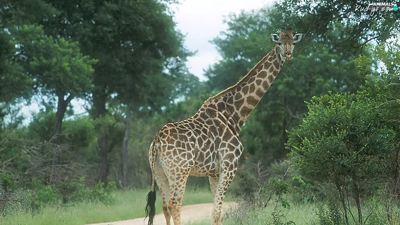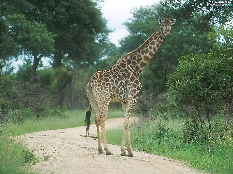 giraffe, trees, viewes, Path