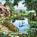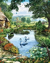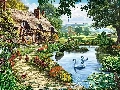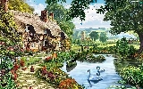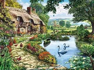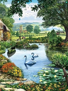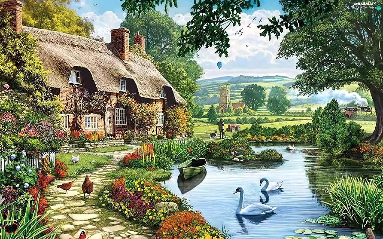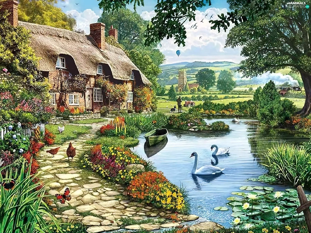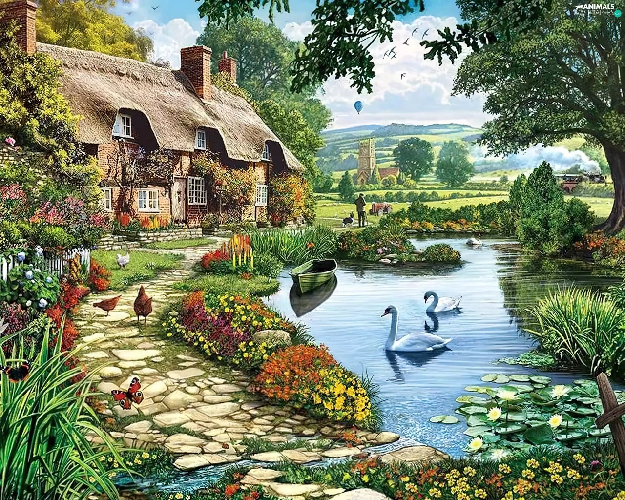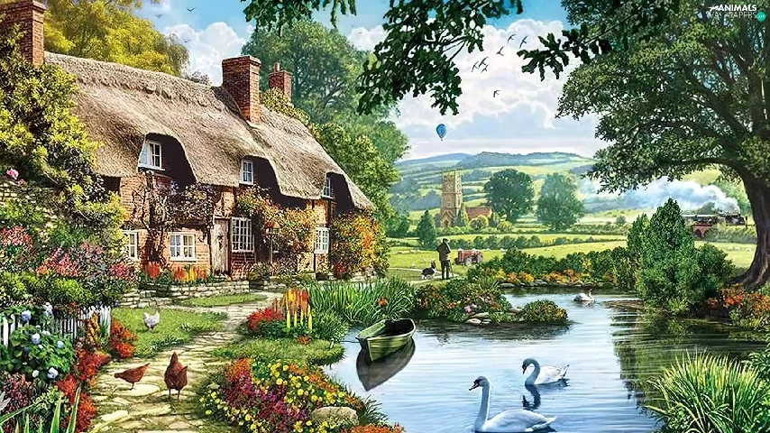 Pond - car, house, hens, Poster Image, Swan, Path