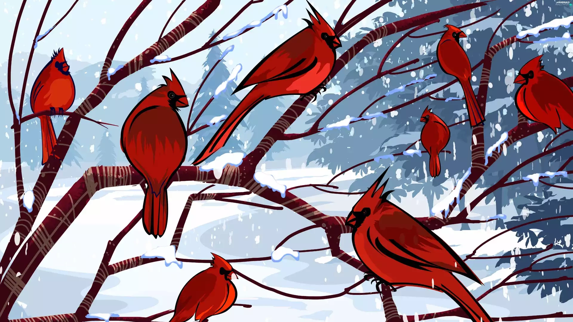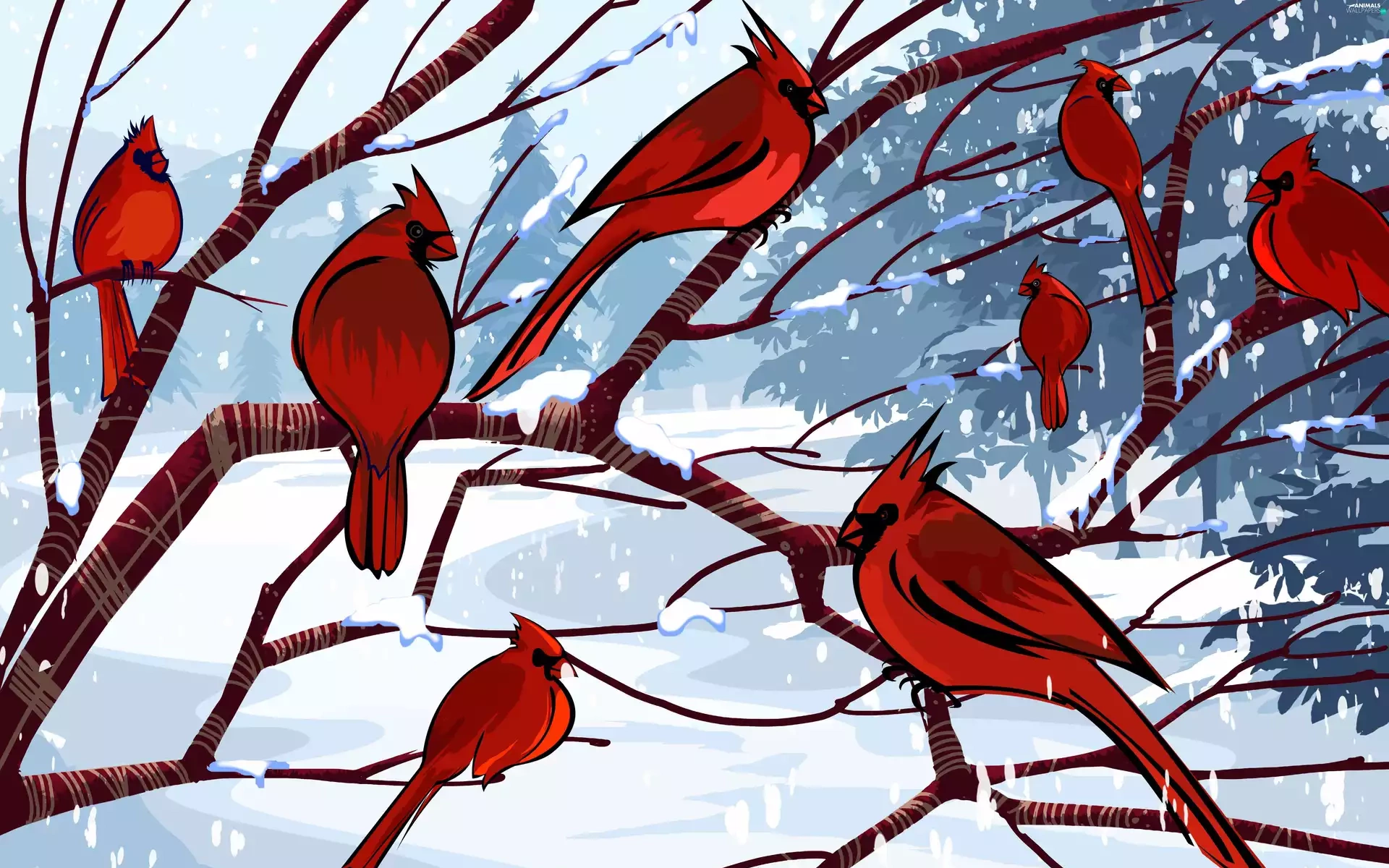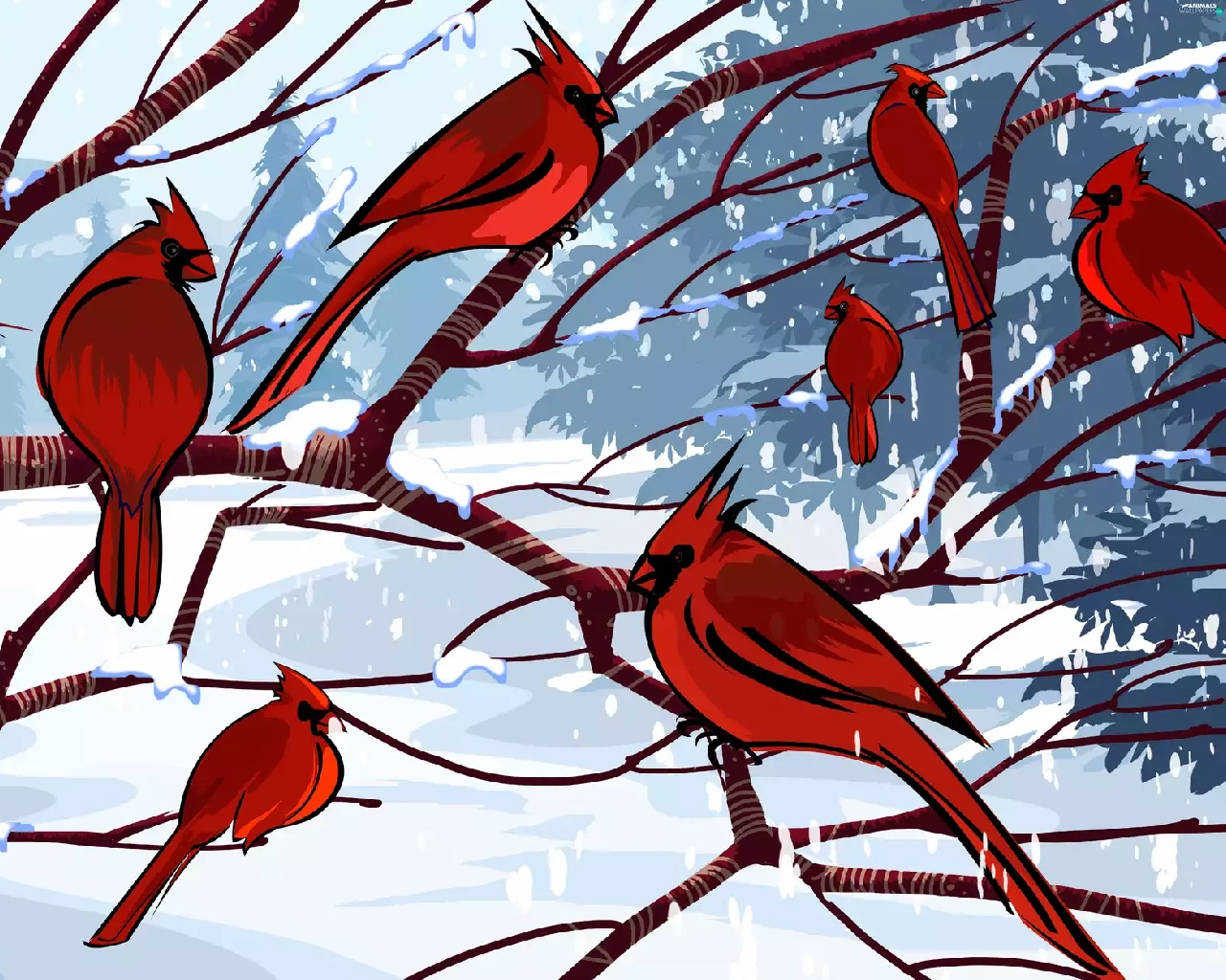 branch pics, Cardinals, winter, birds